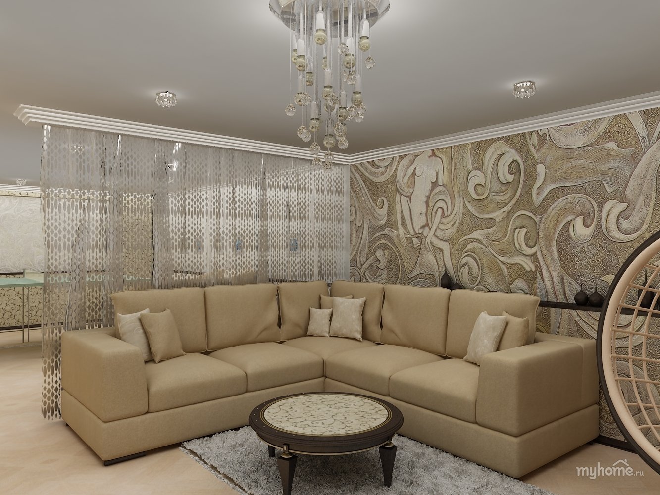 Интерьер гостиной с уговым дивано