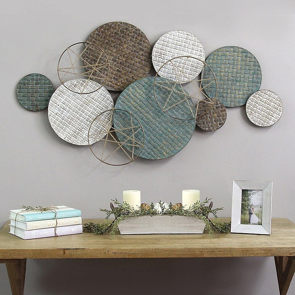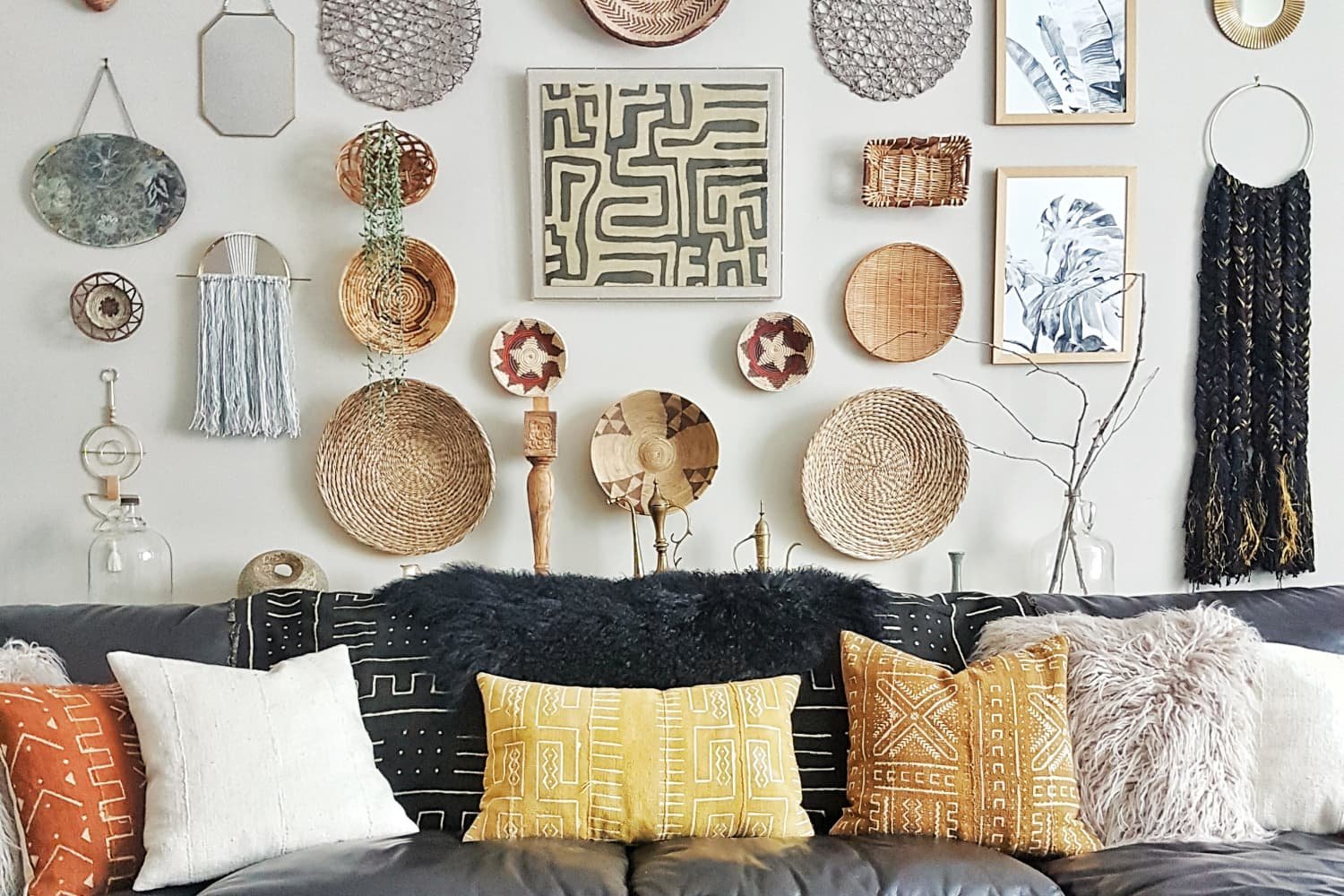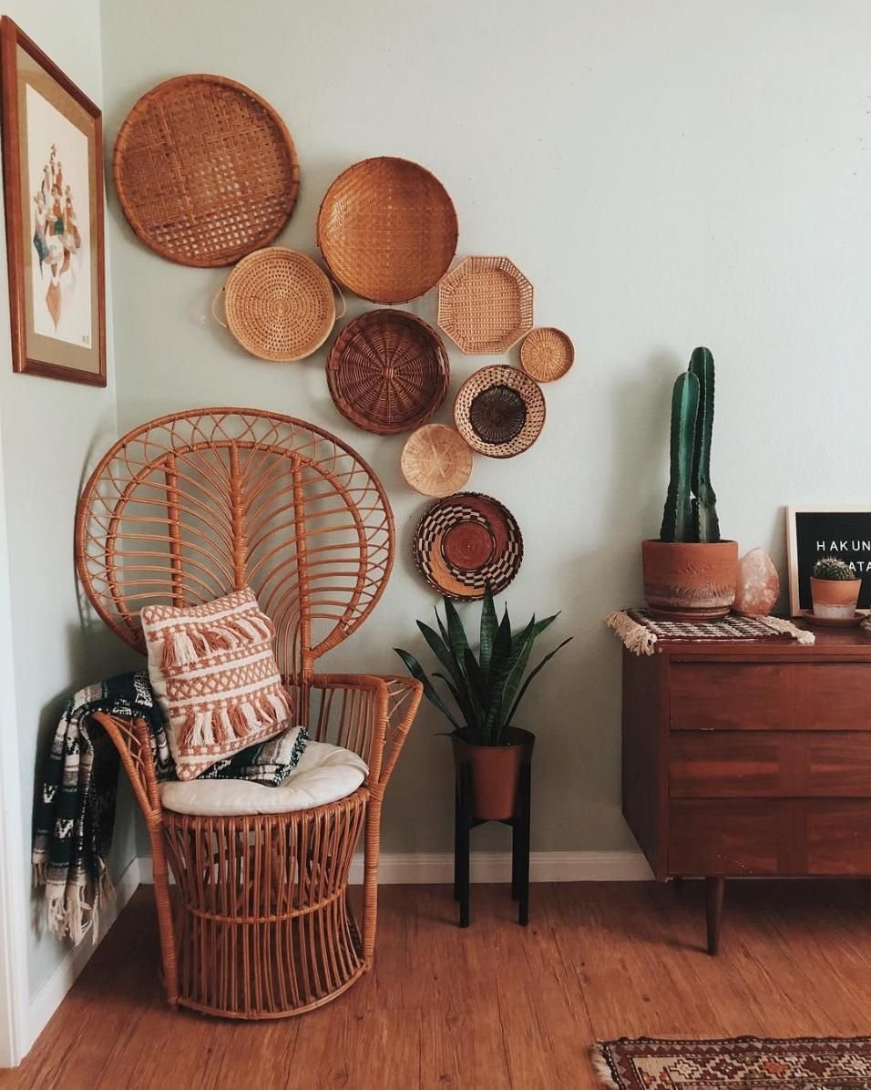 Плетеные тарелки на стене в интерьере