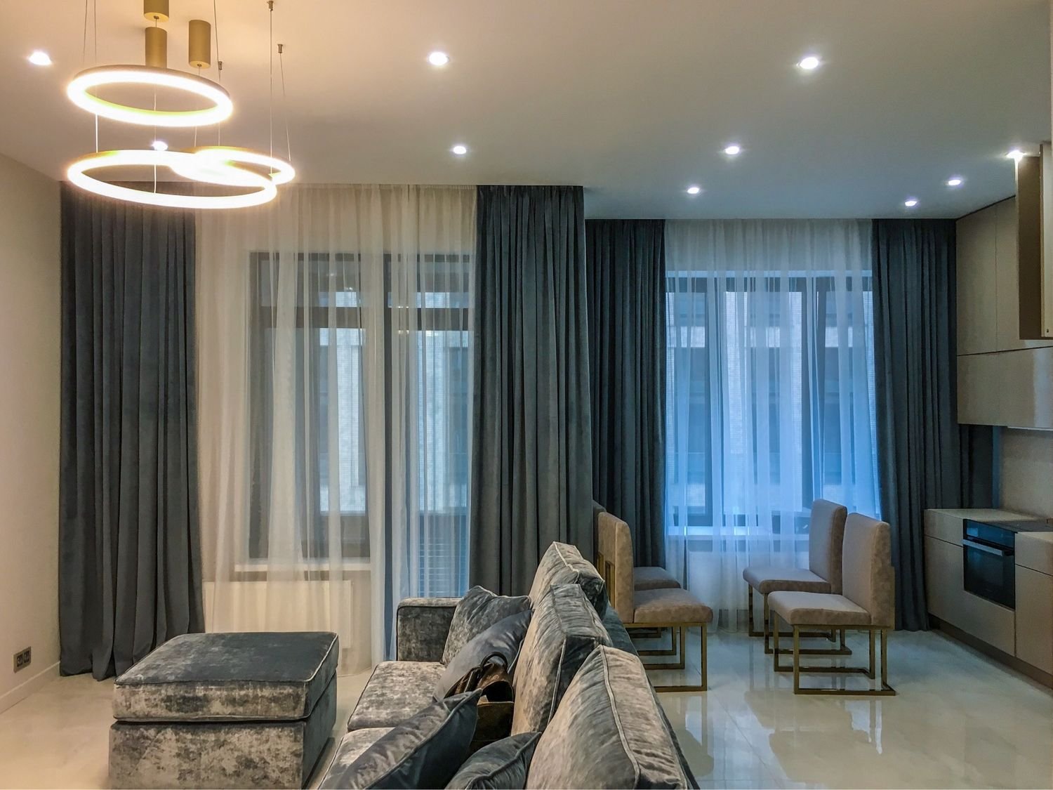 Бархатные шторы в современном интерьере кухни