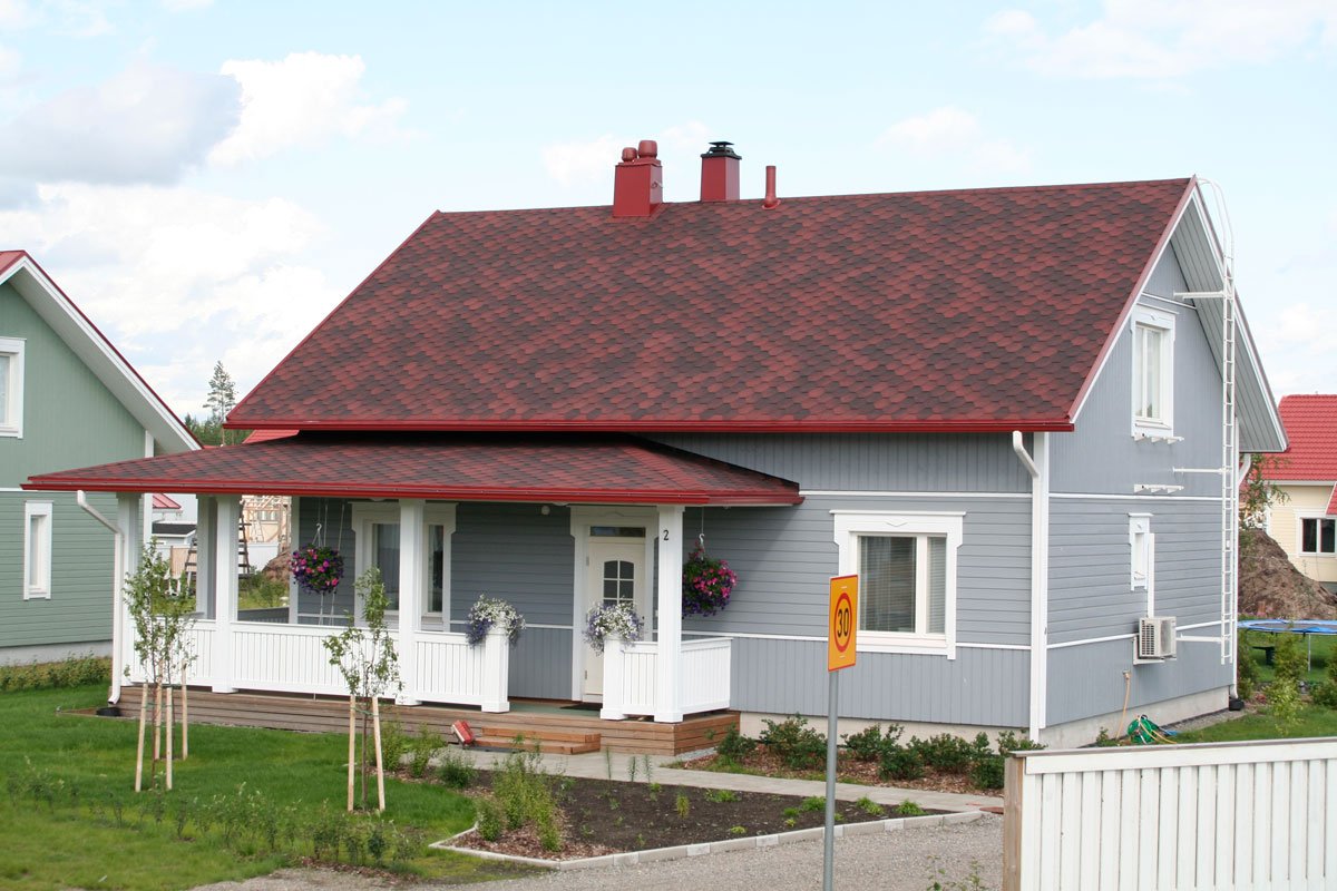 Серый дом с бордовой крышей