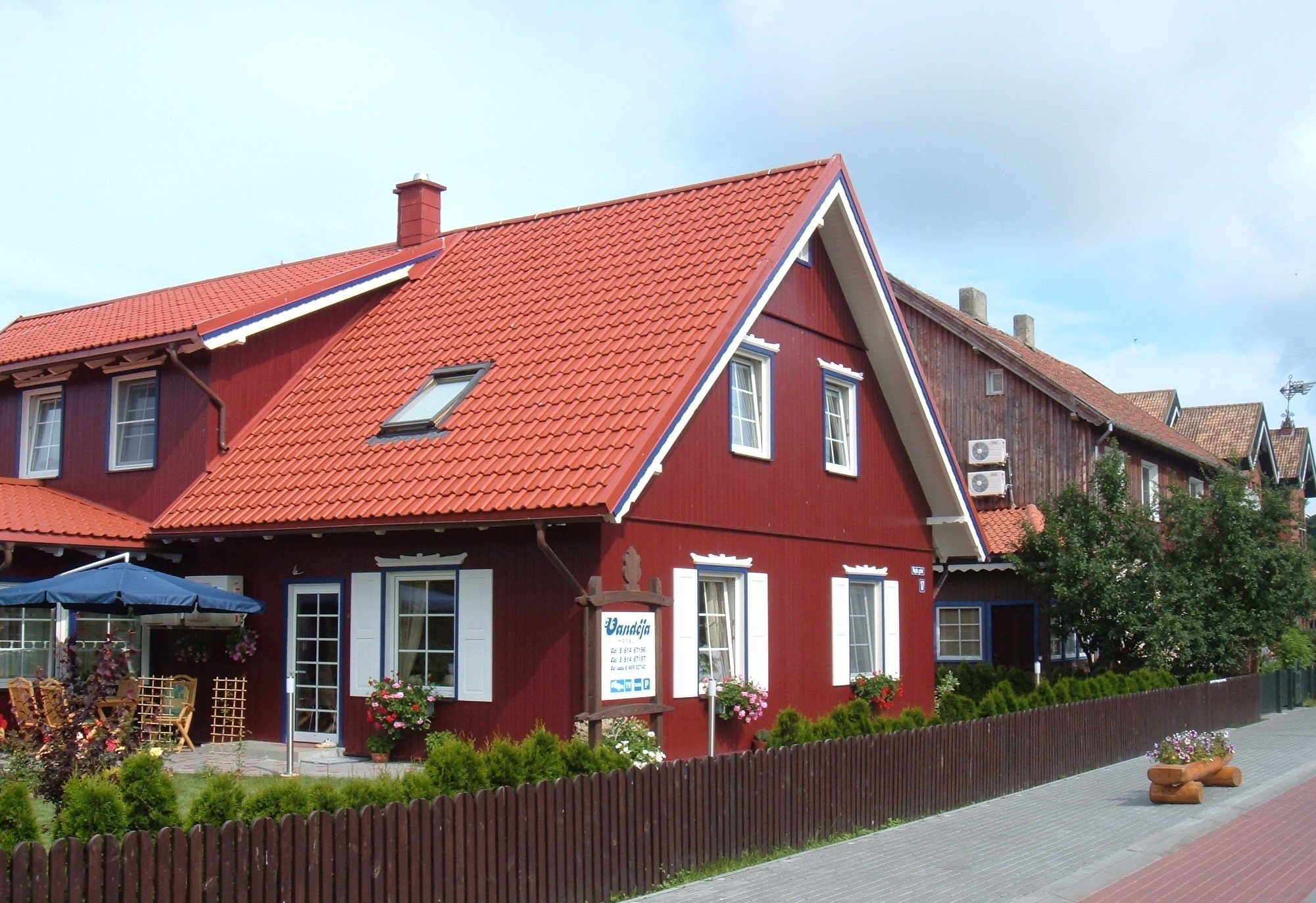 Деревянный дом с вишневой крышей