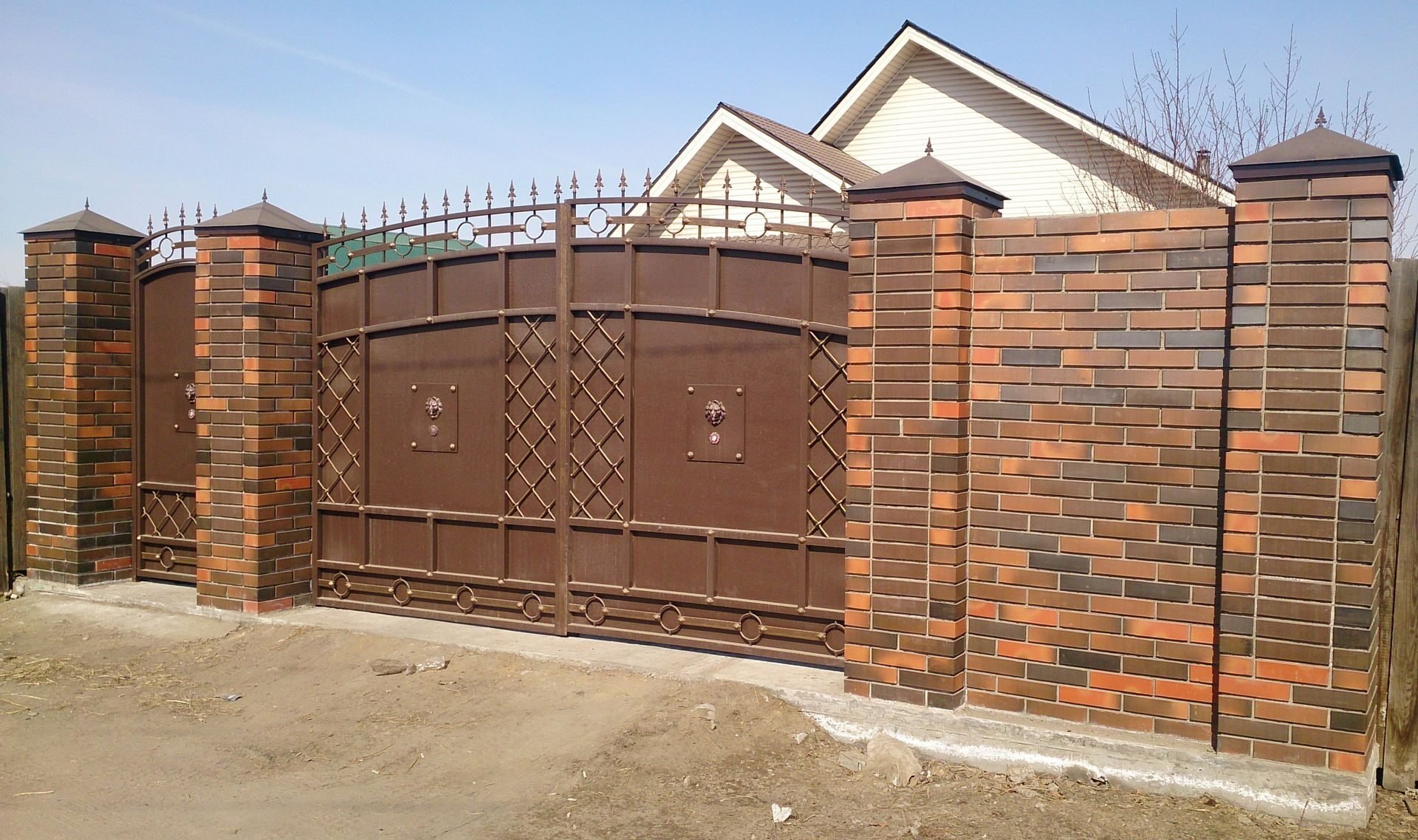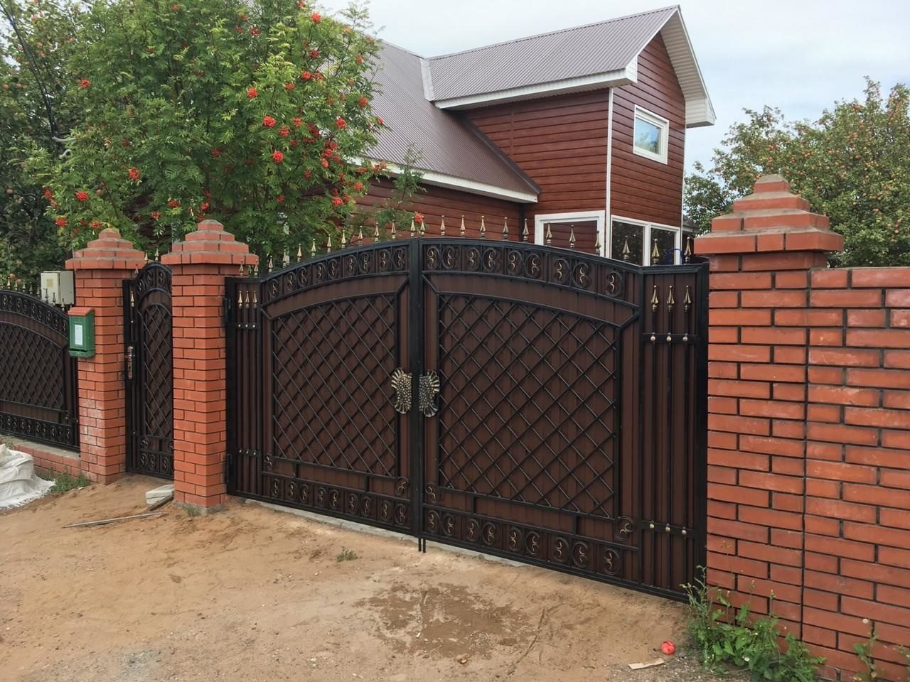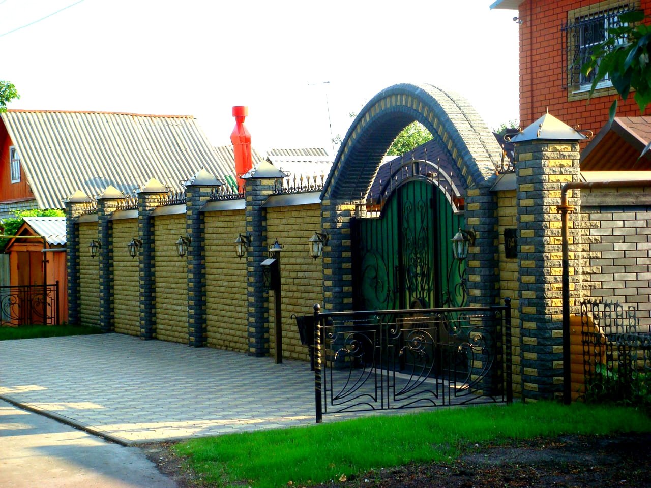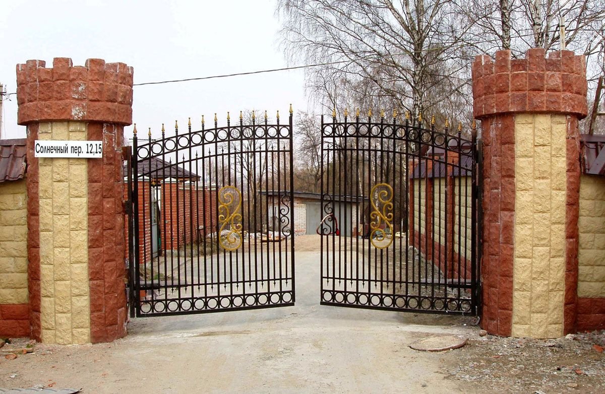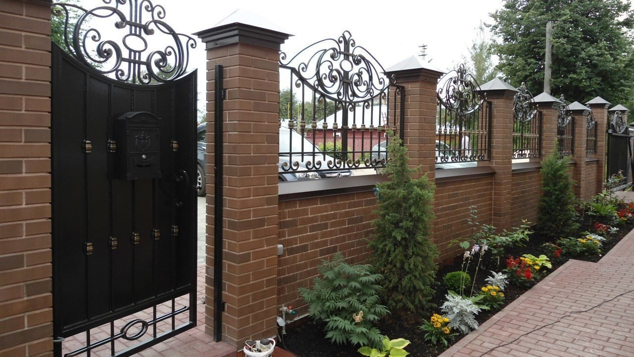 Кирпичные заборы с коваными воротами