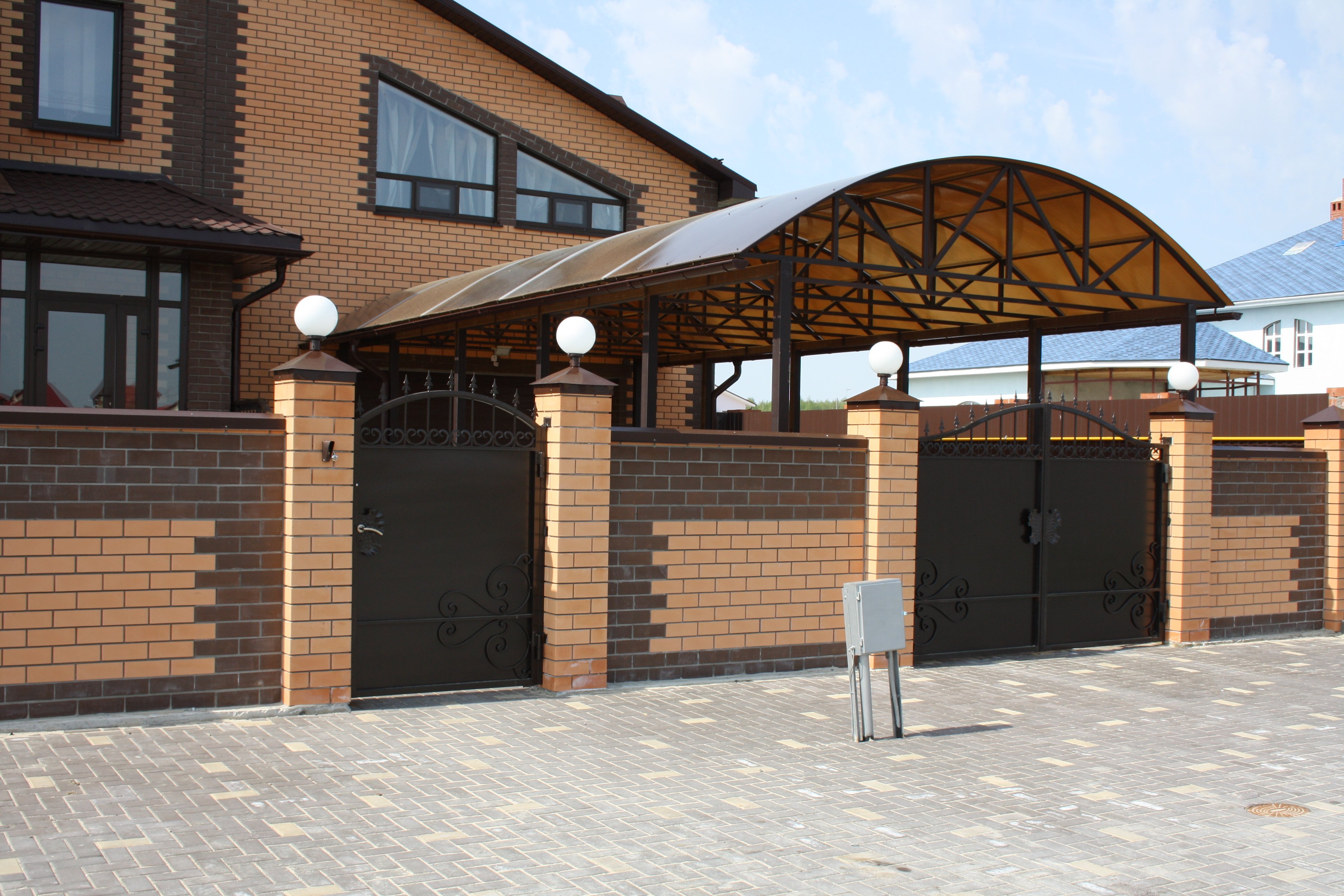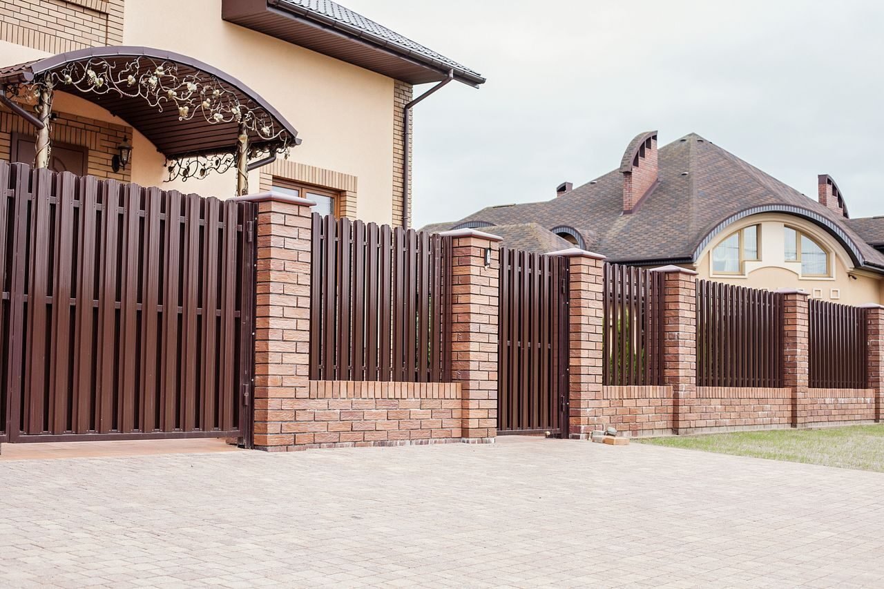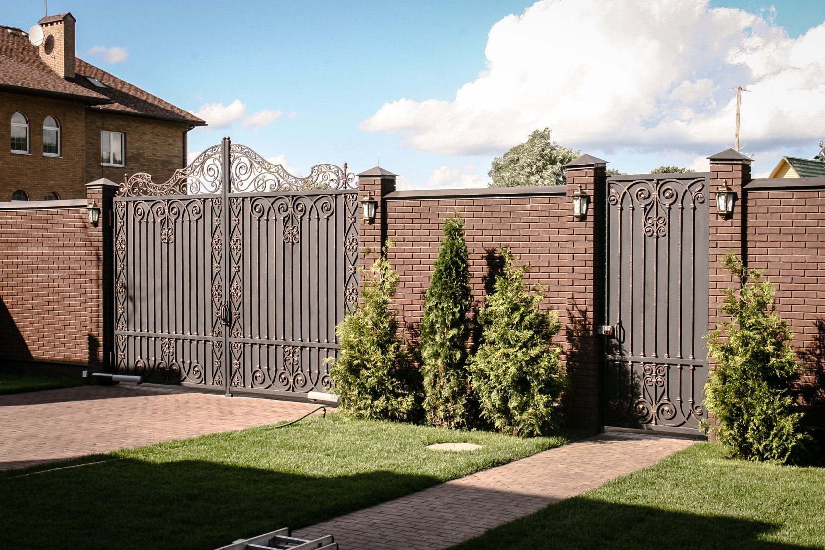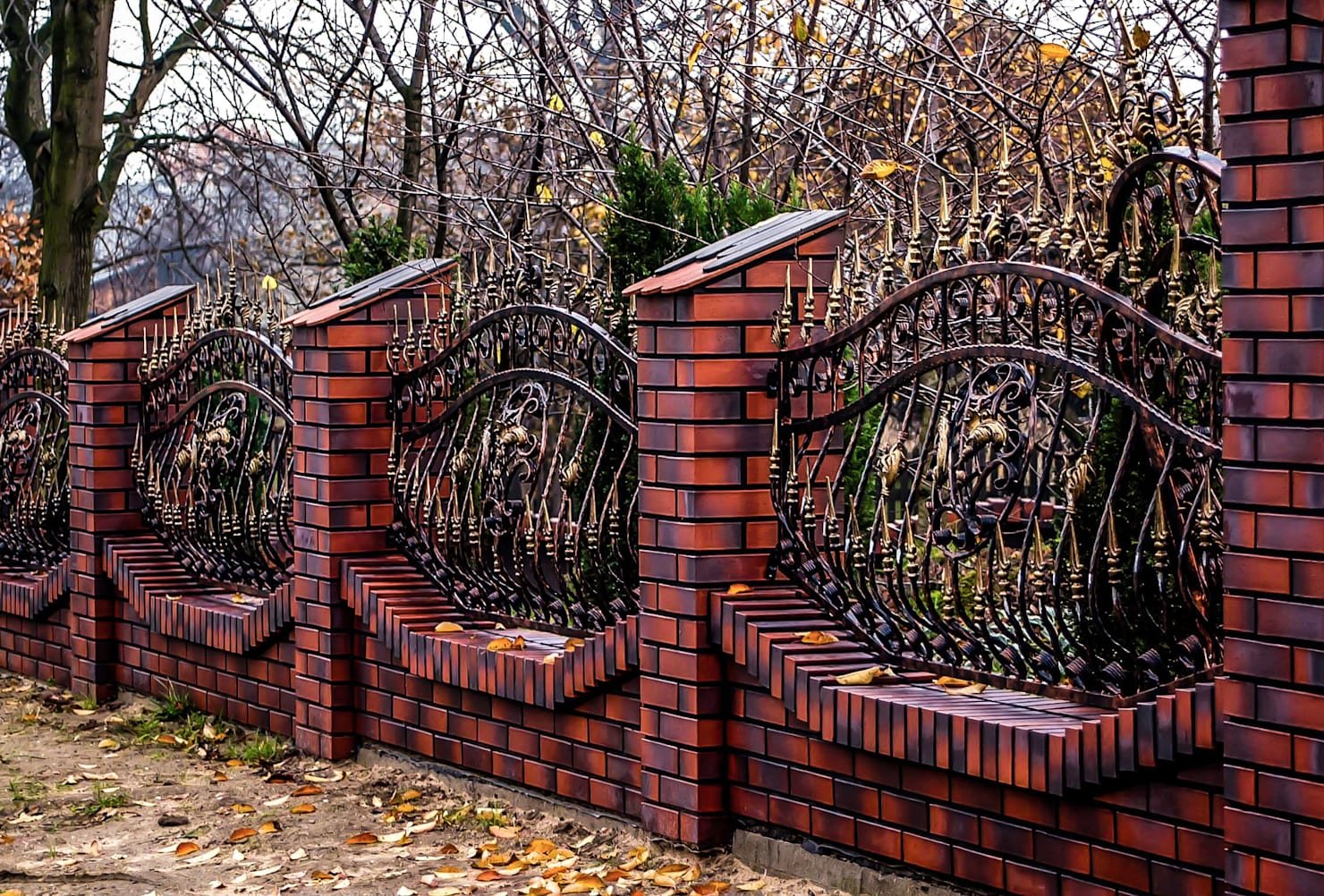 Кирпичные заборы с коваными воротами