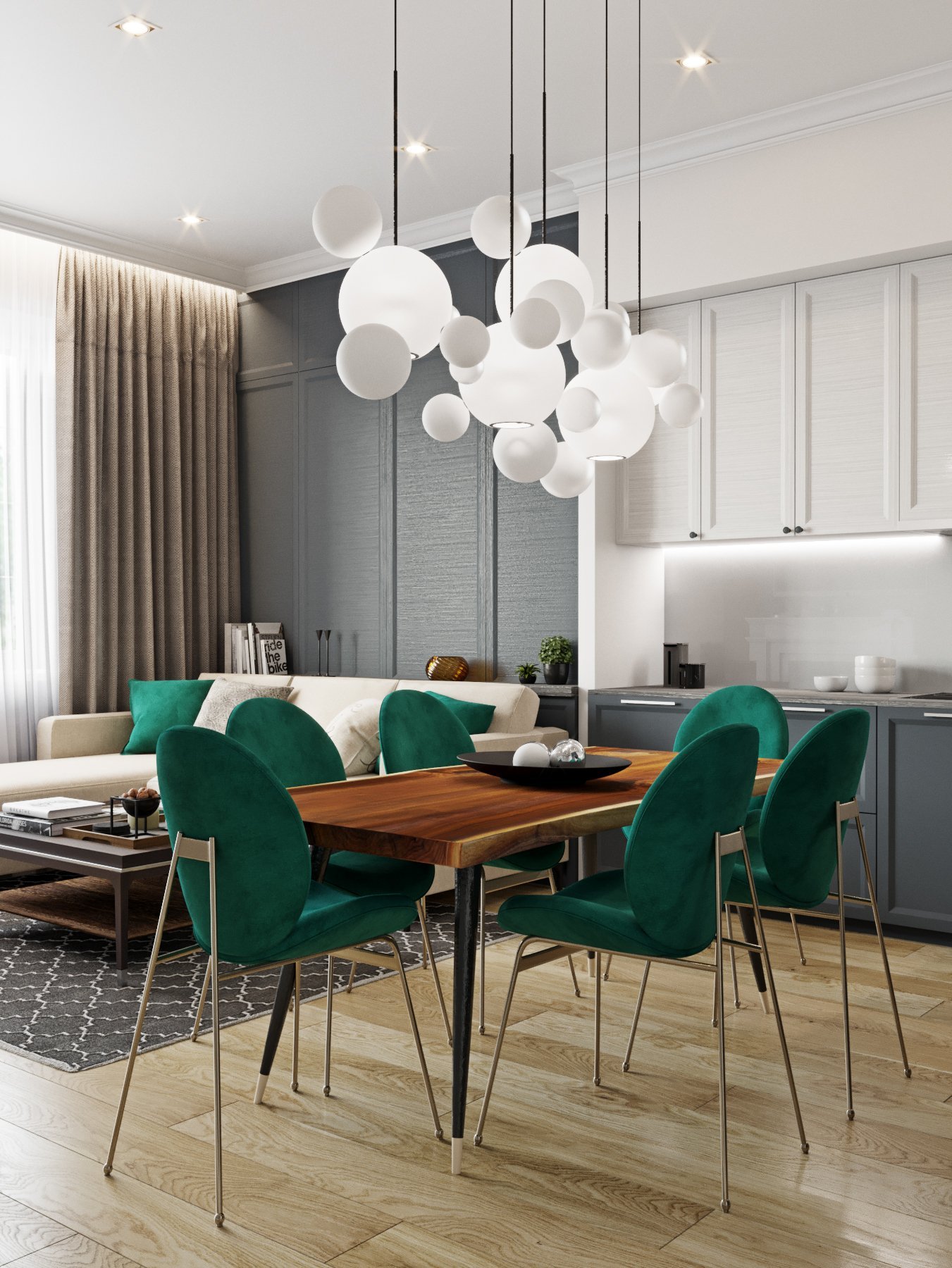 Сочетание изумрудного и серого цвета на кухне