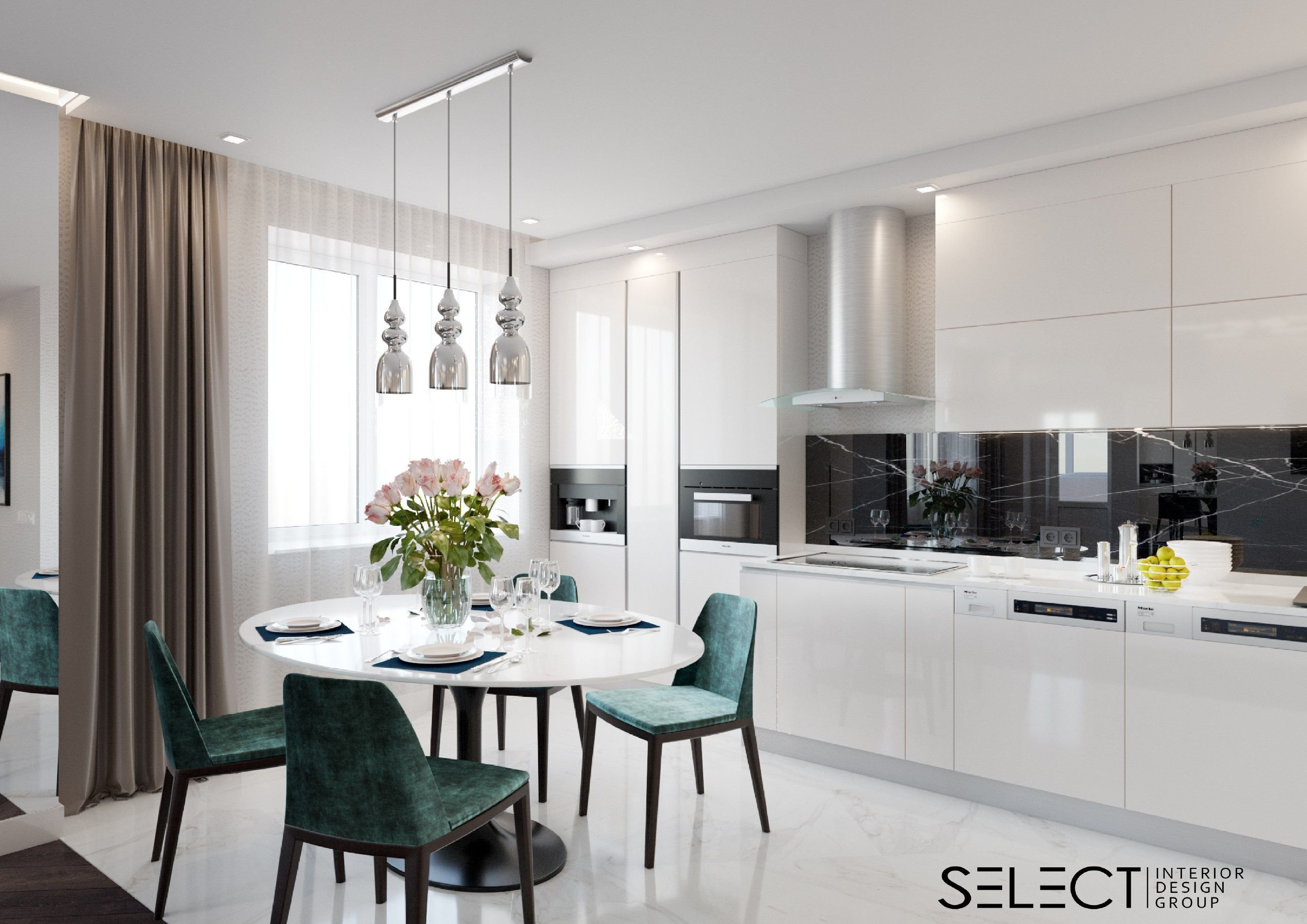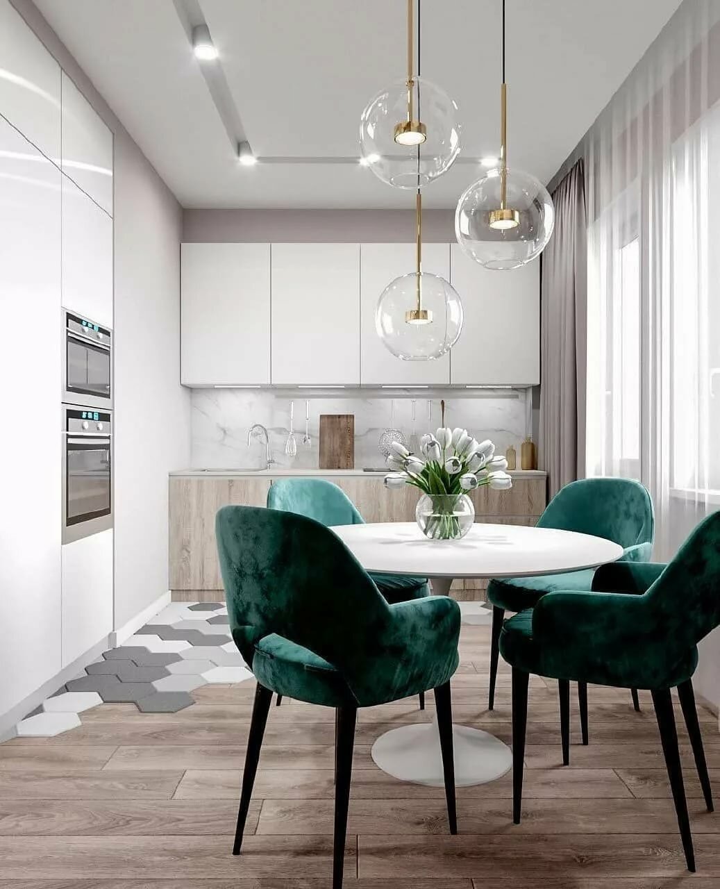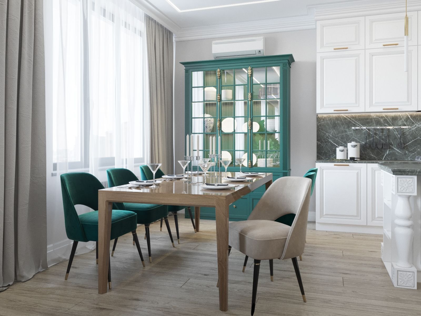 Интерьер бело изумрудной кухни