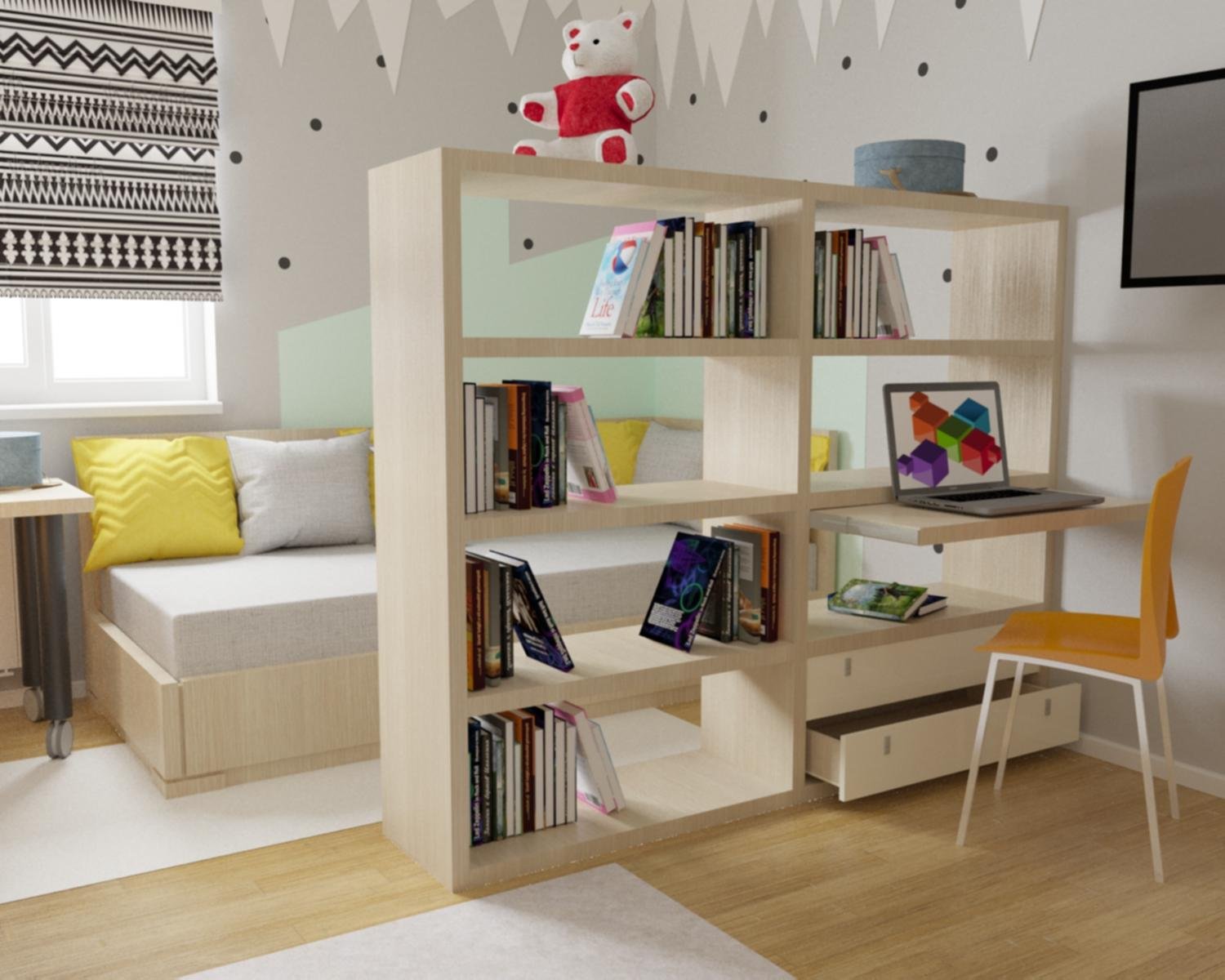 Зонирование детской комнаты стеллажом