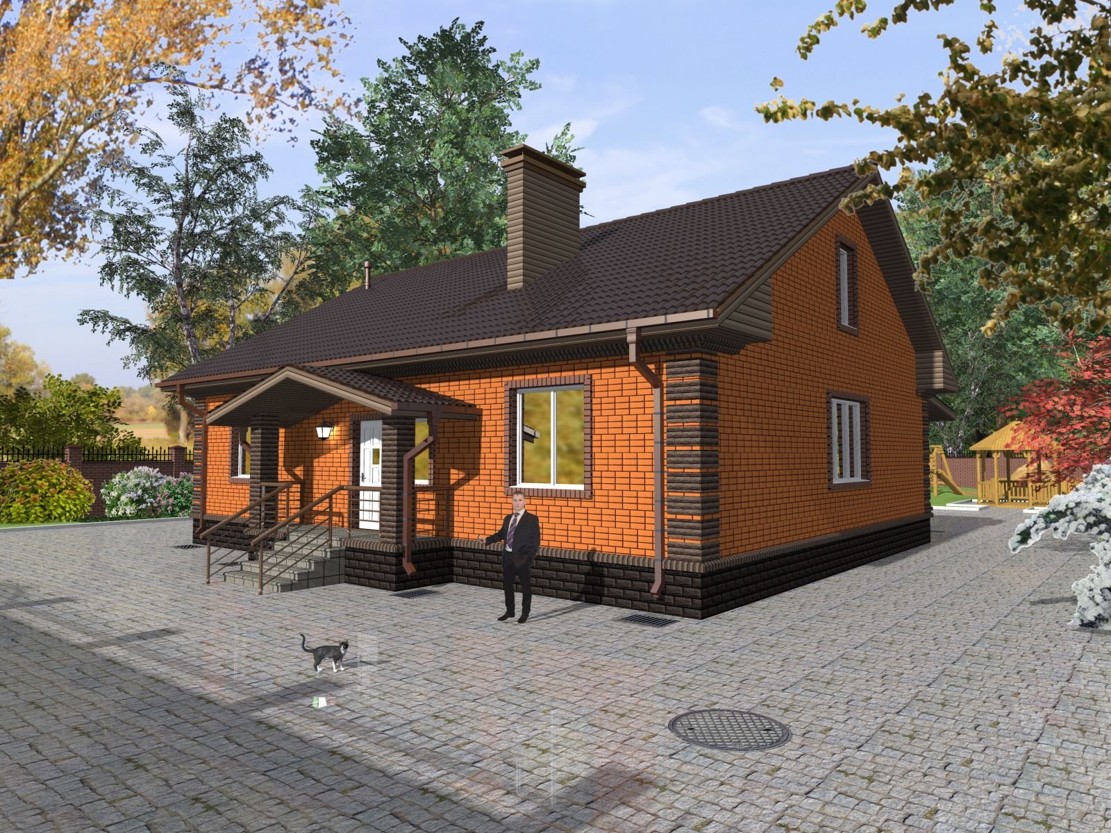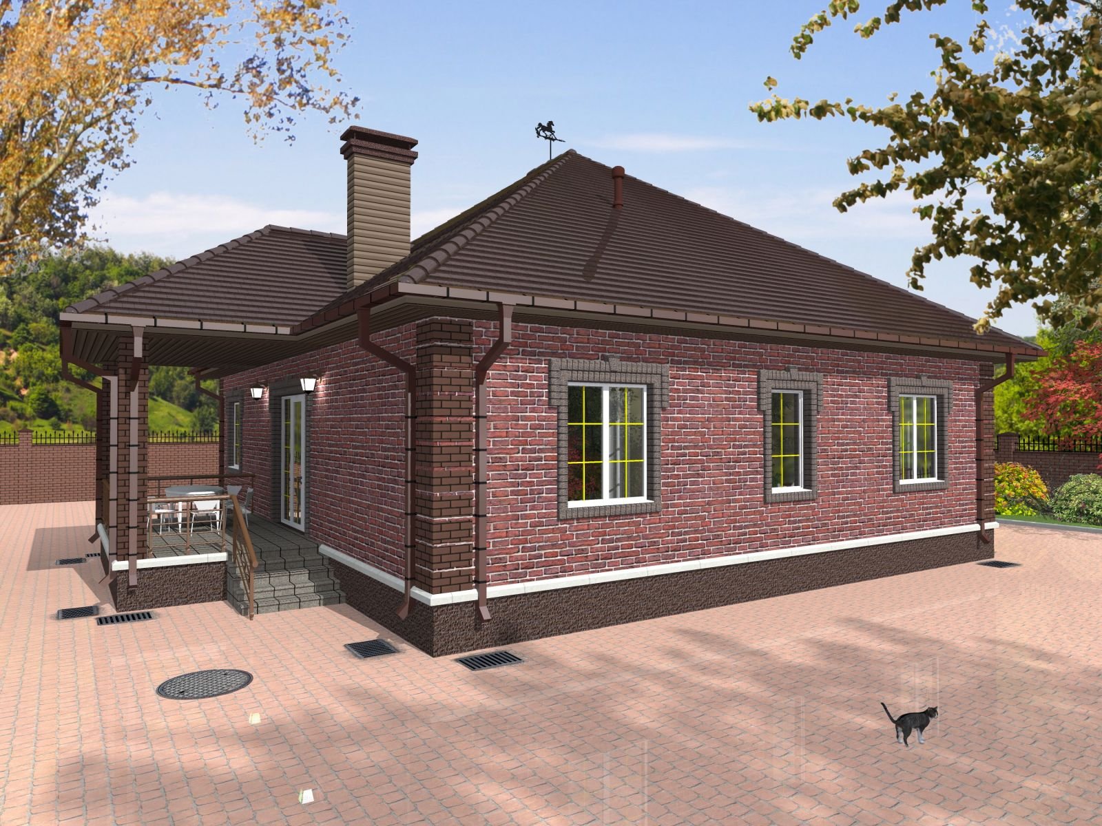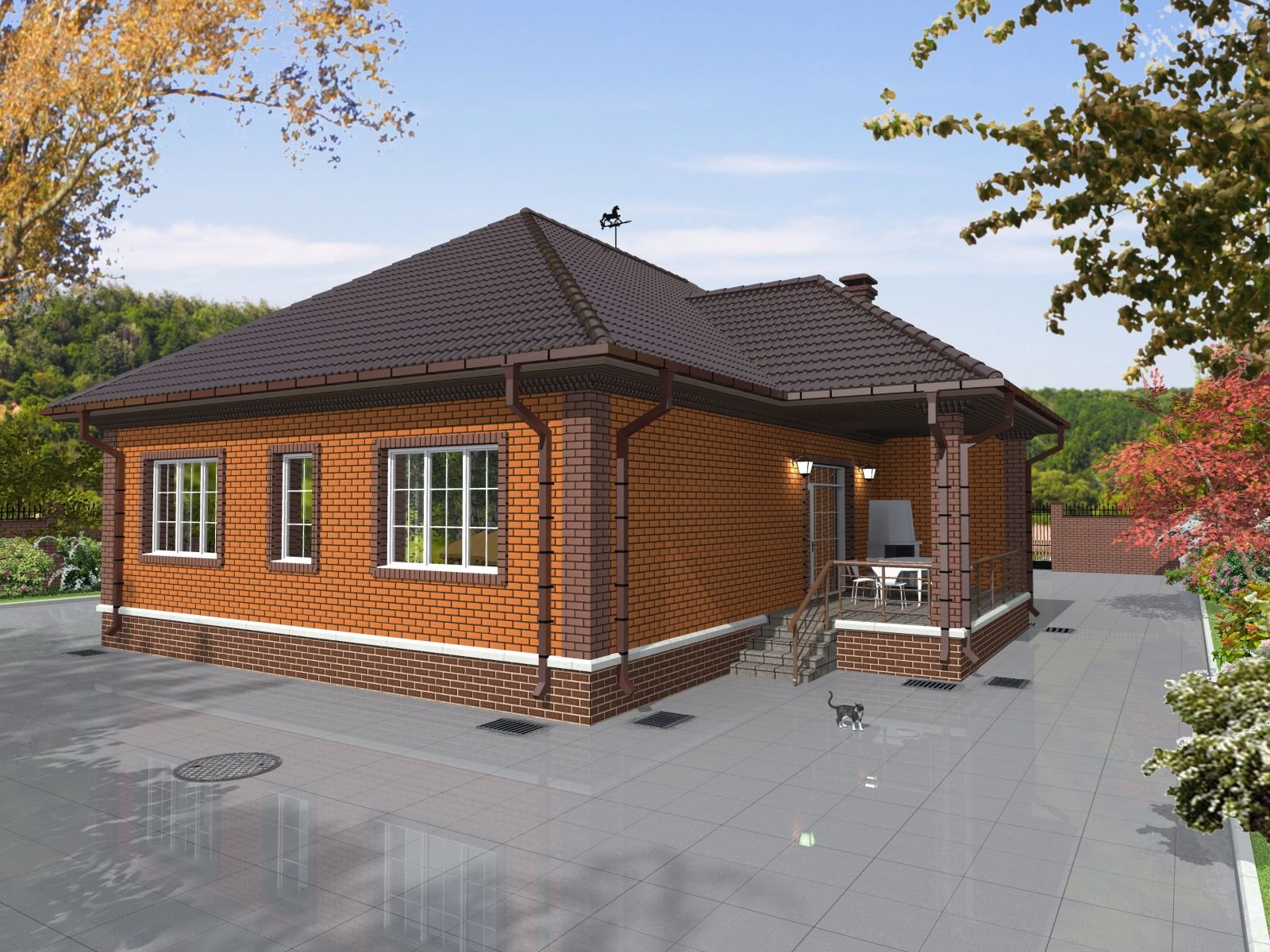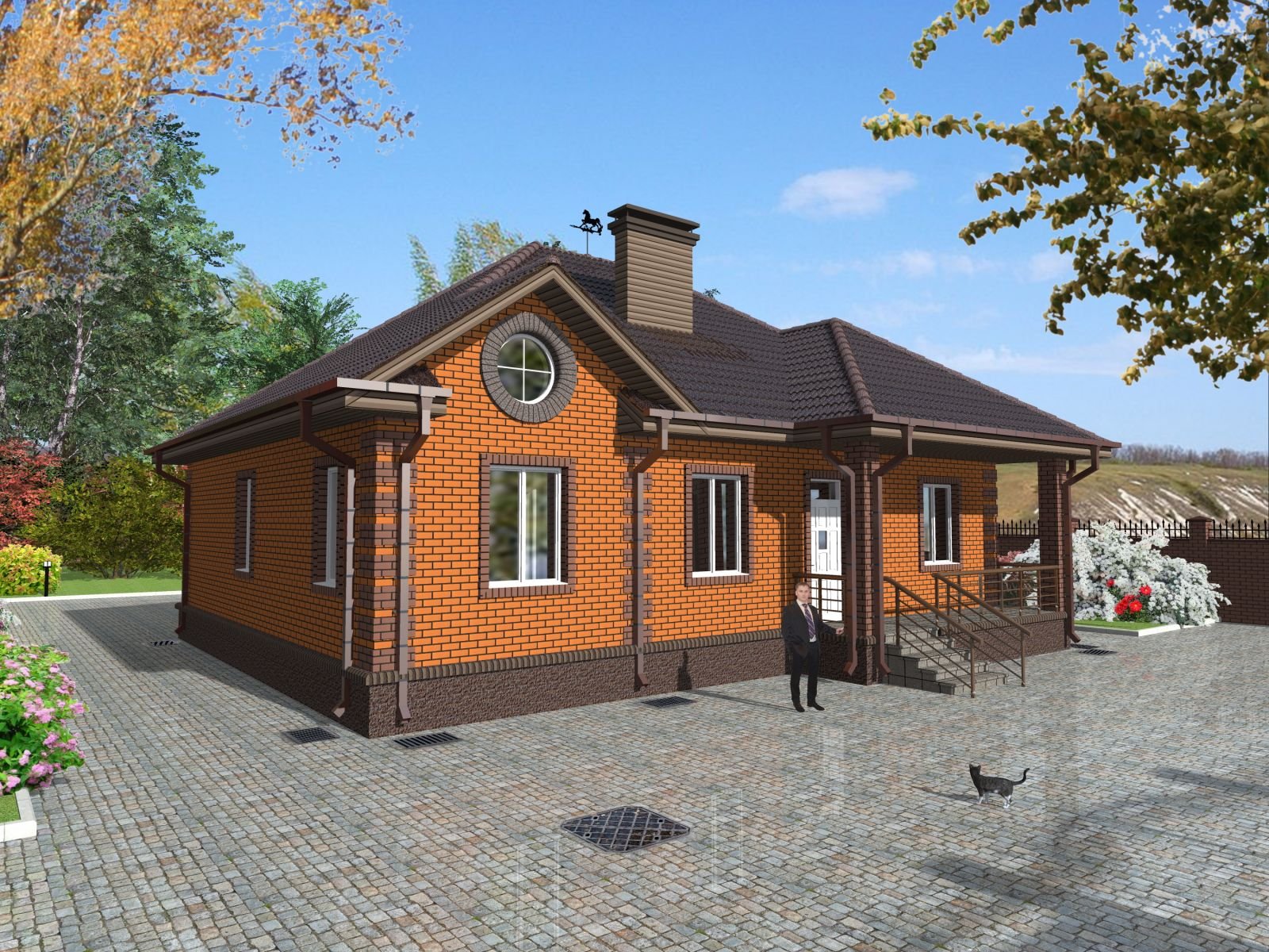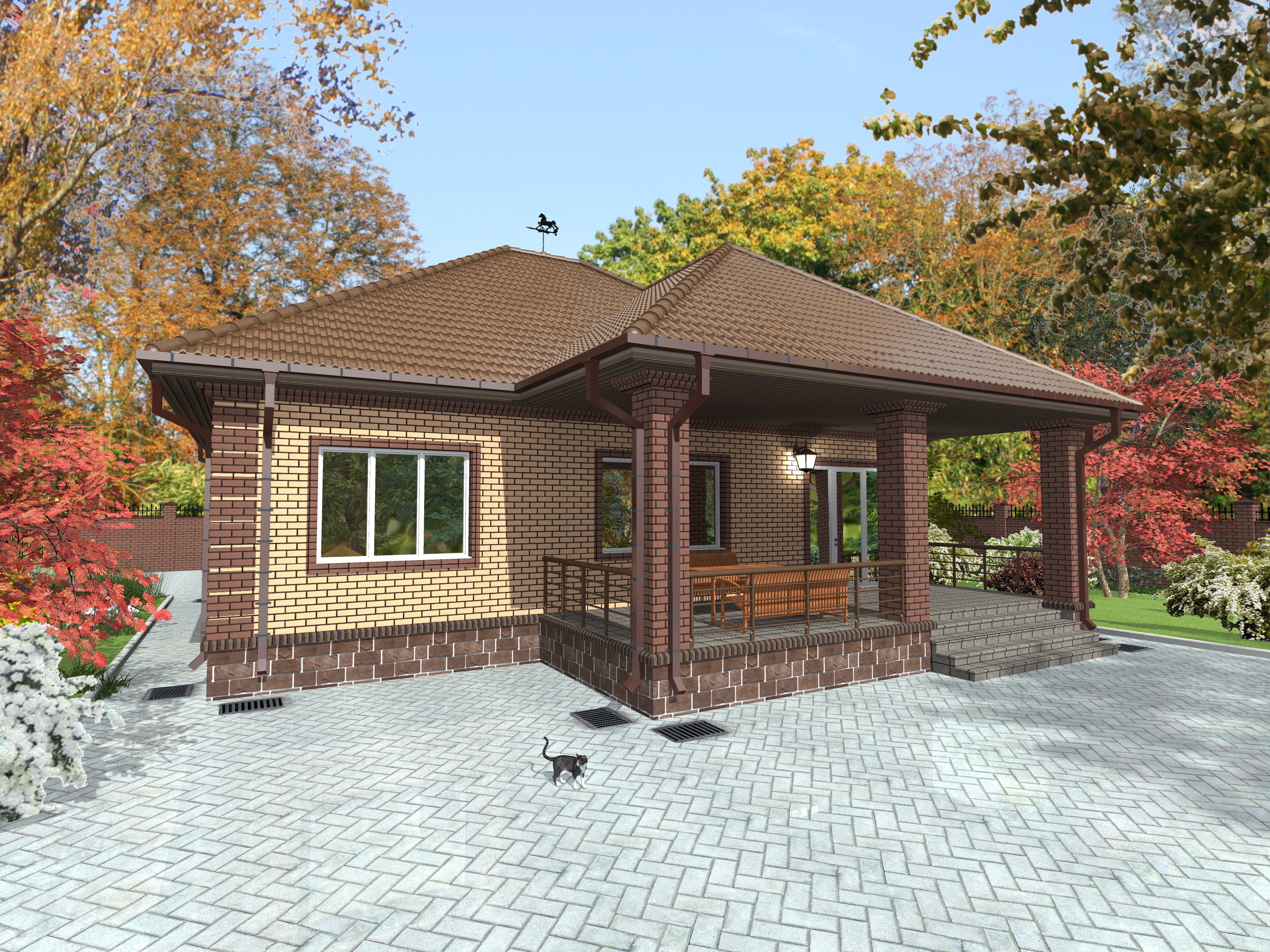 Одноэтажный кирпичный дом с крыльцом