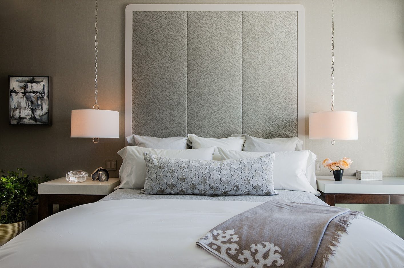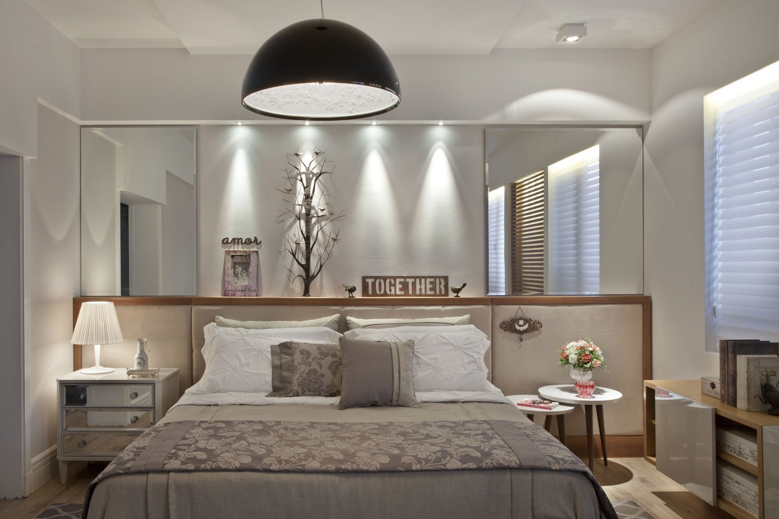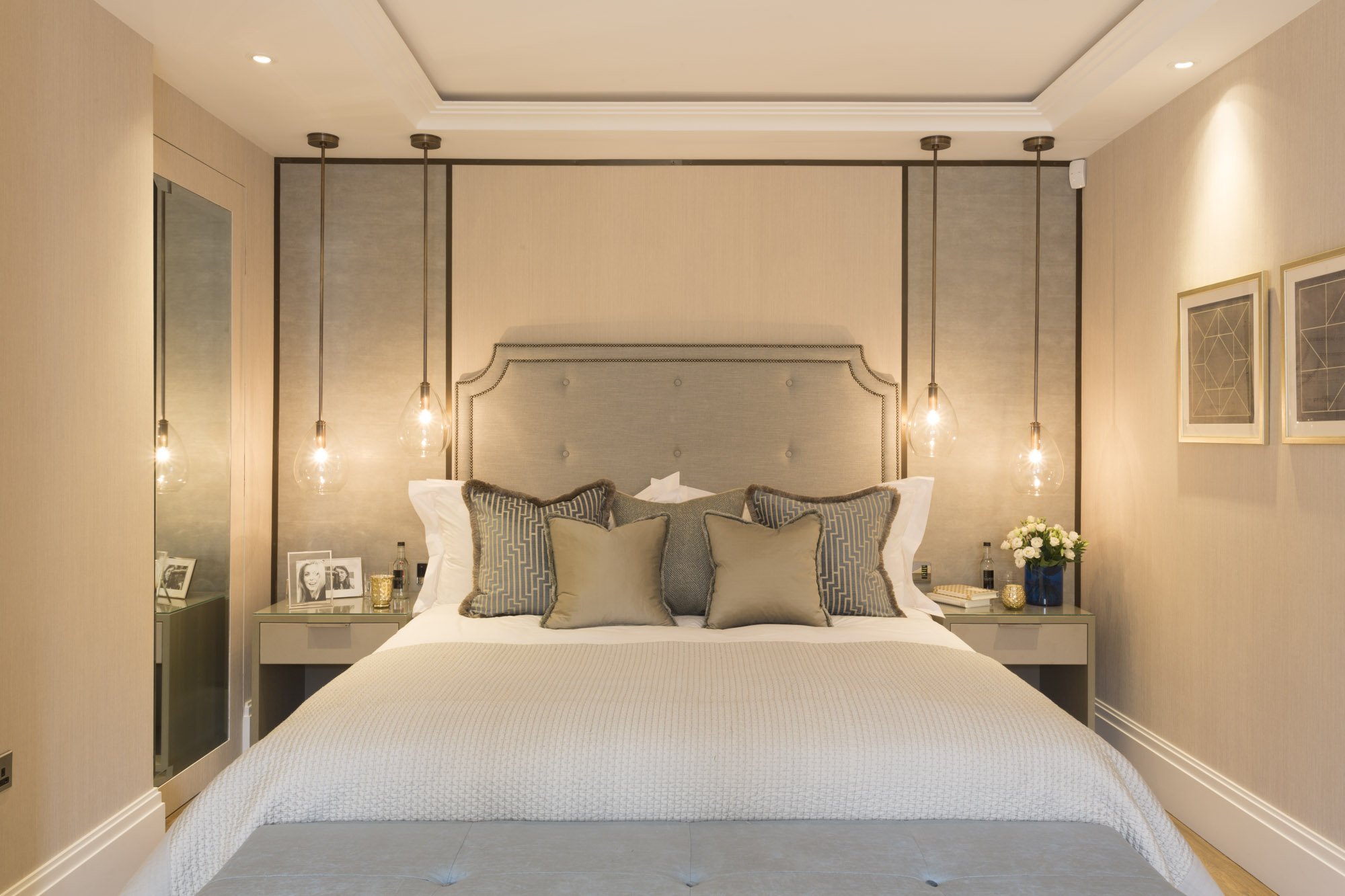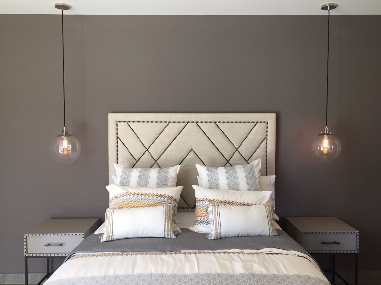 Подвесные светильники в спальне над тумбочками