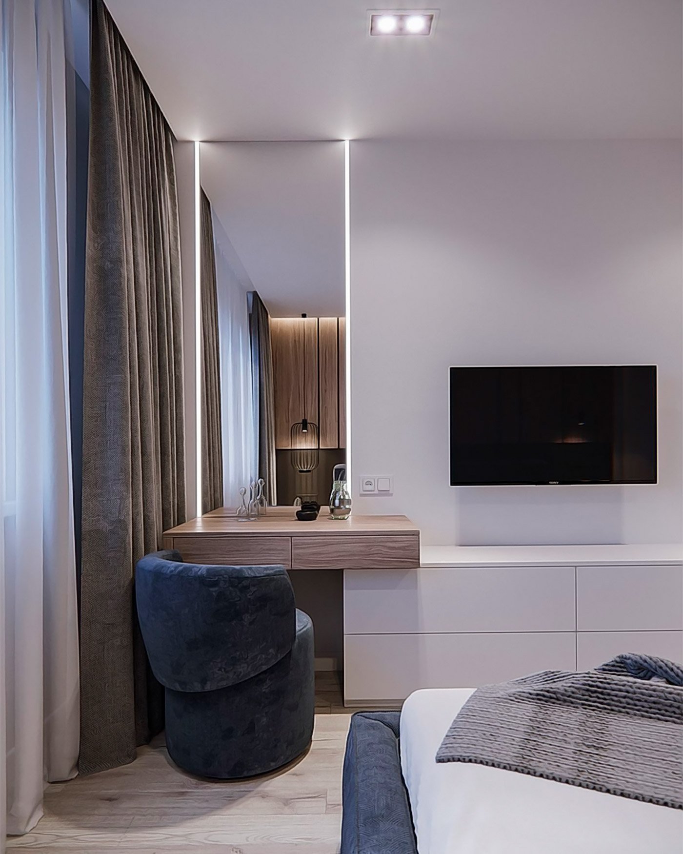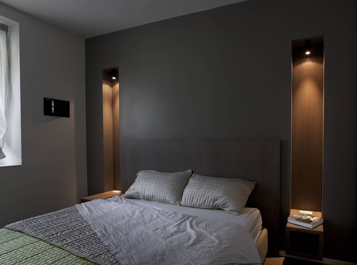 Точечные светильники над кроватью в спальне