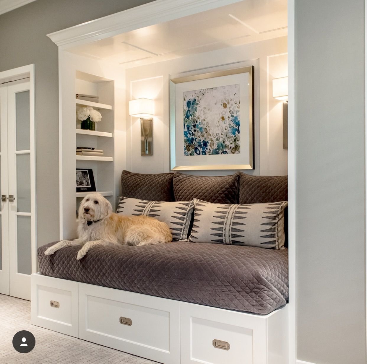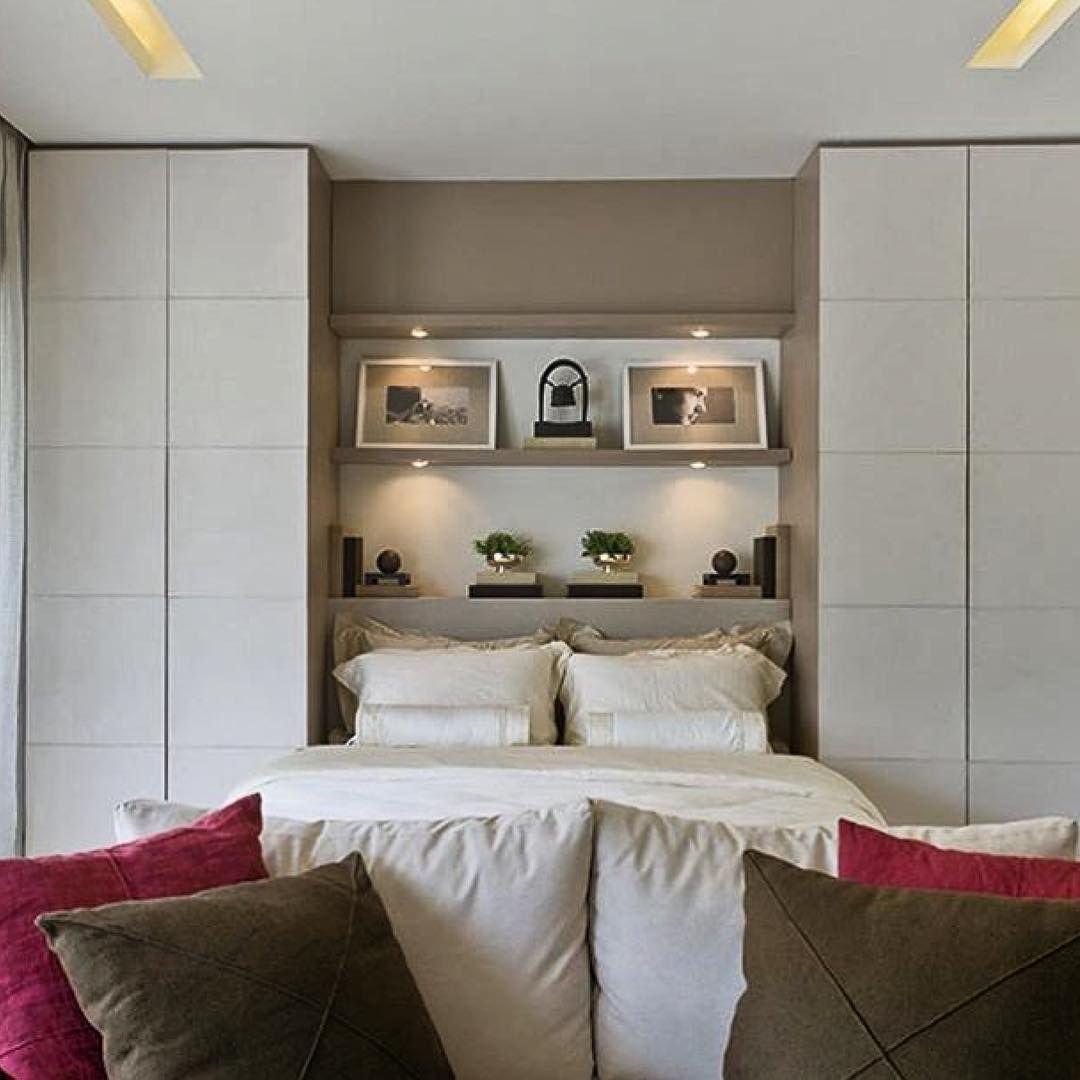 Современный дизайн спальни с полками у изголовья