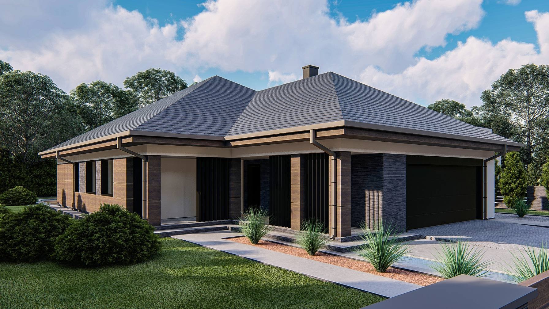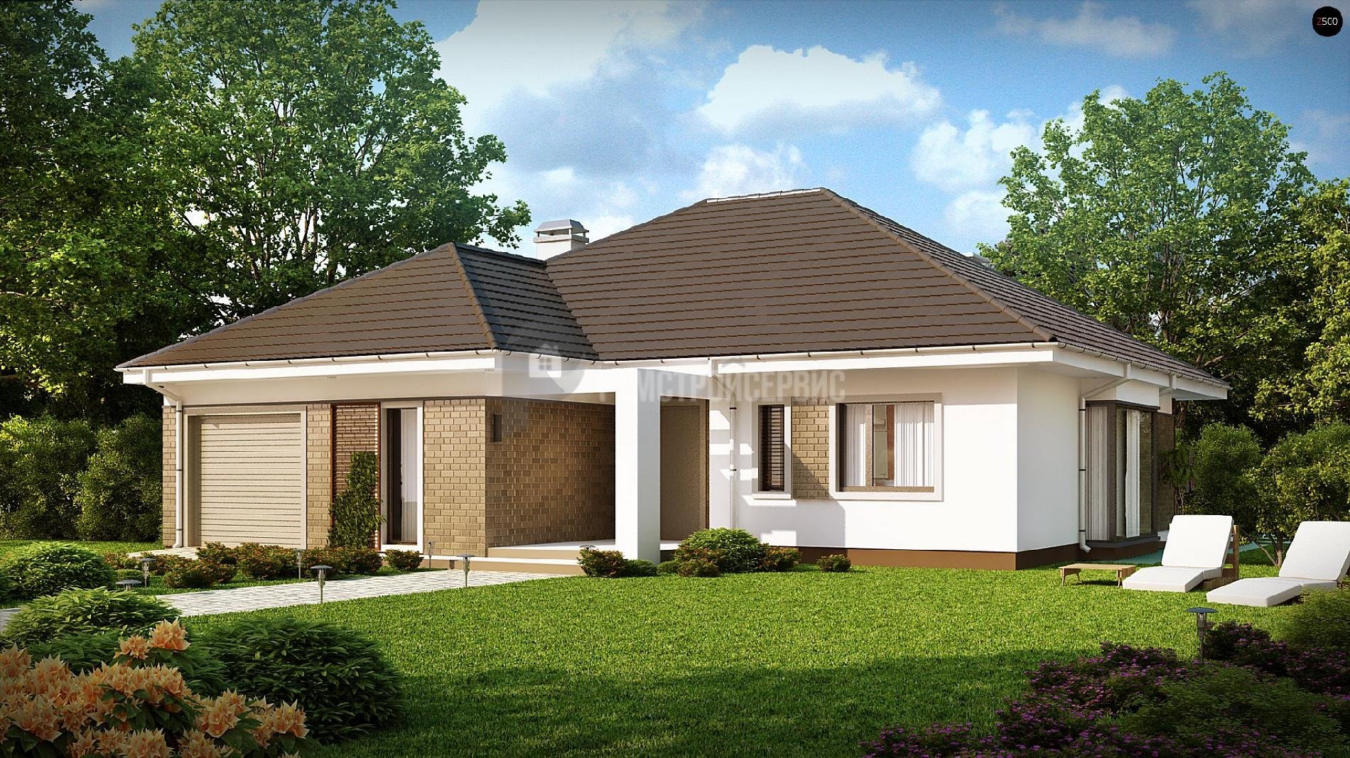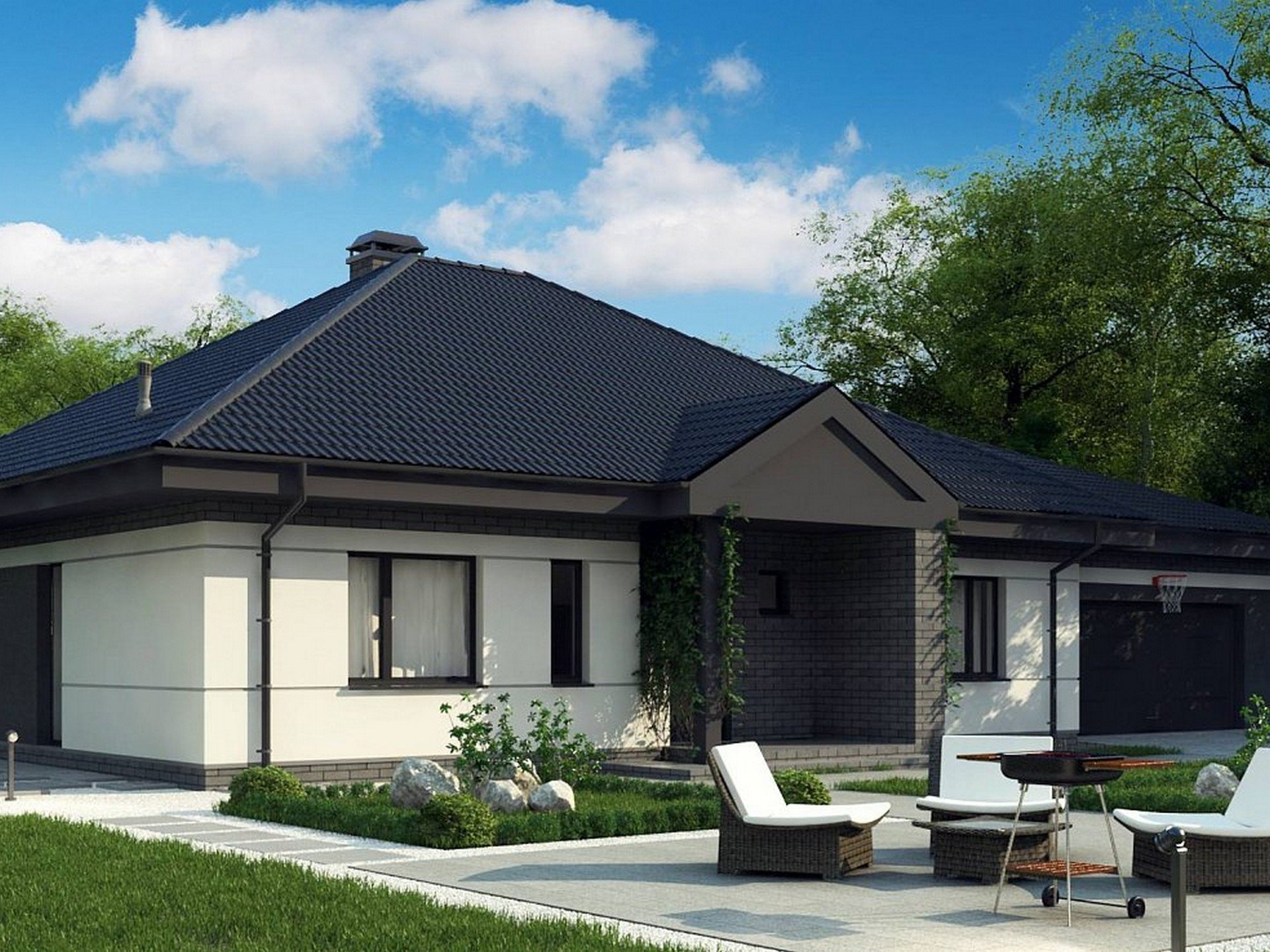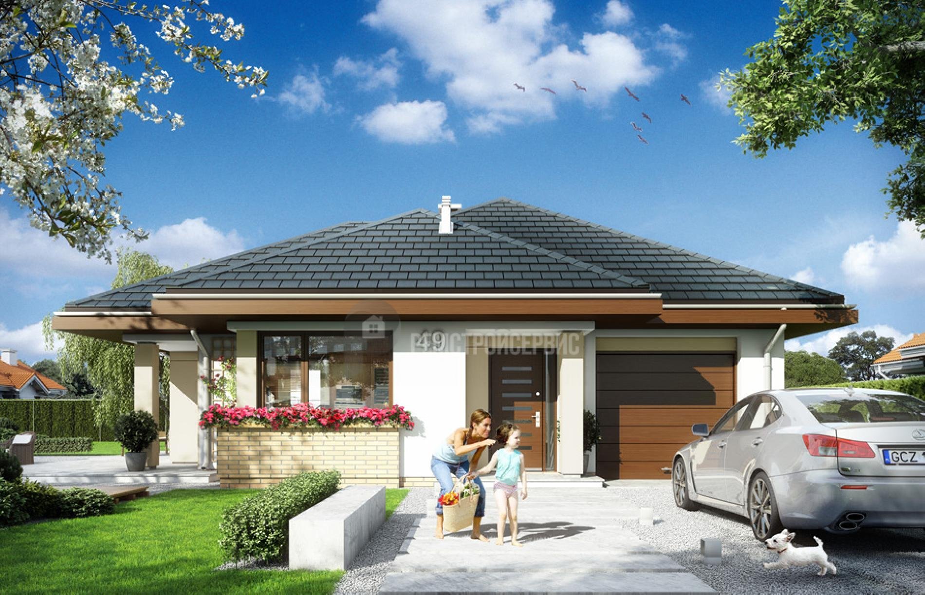 Одноэтажный дом с четырехскатной крышей и гаражом