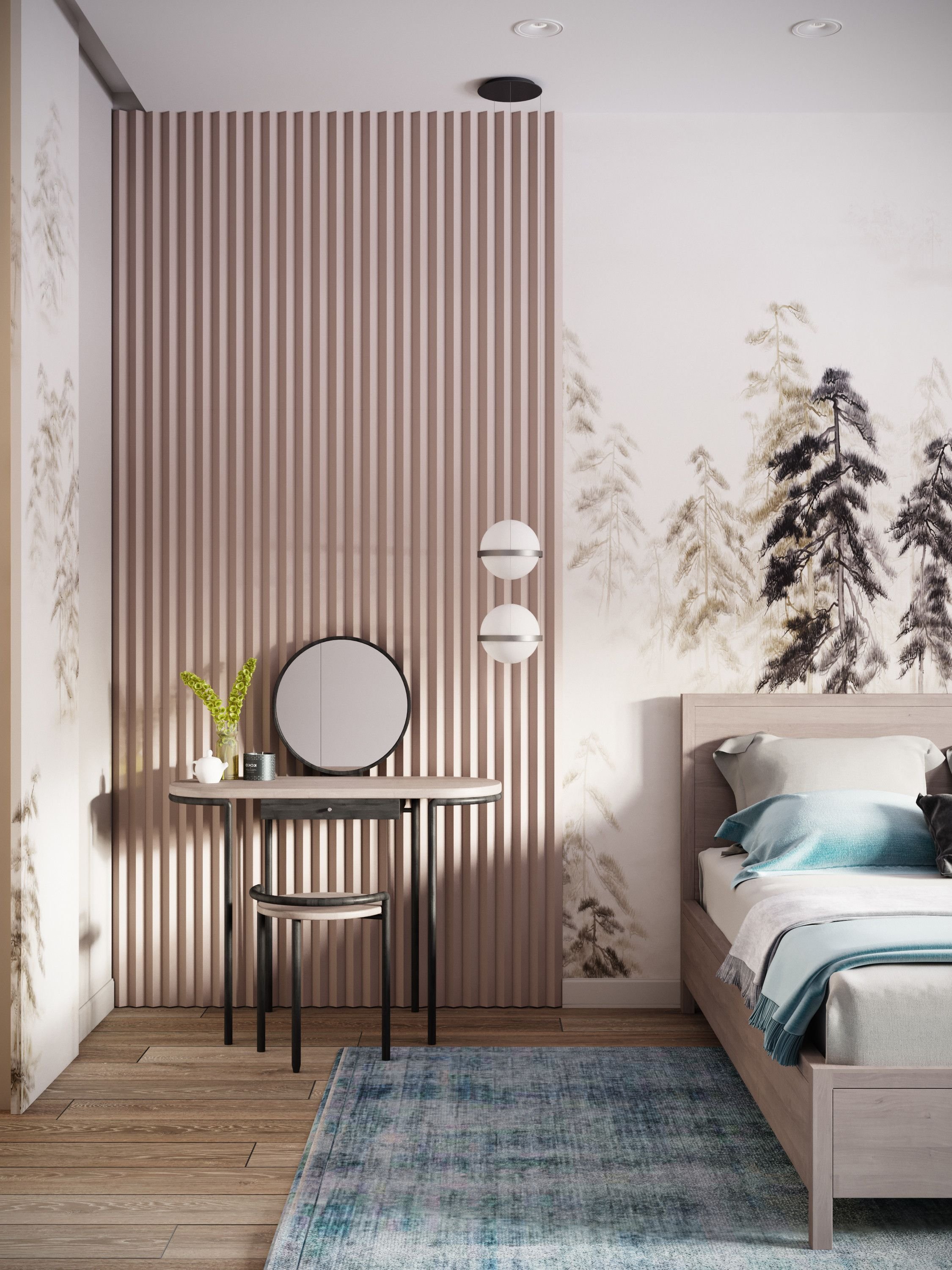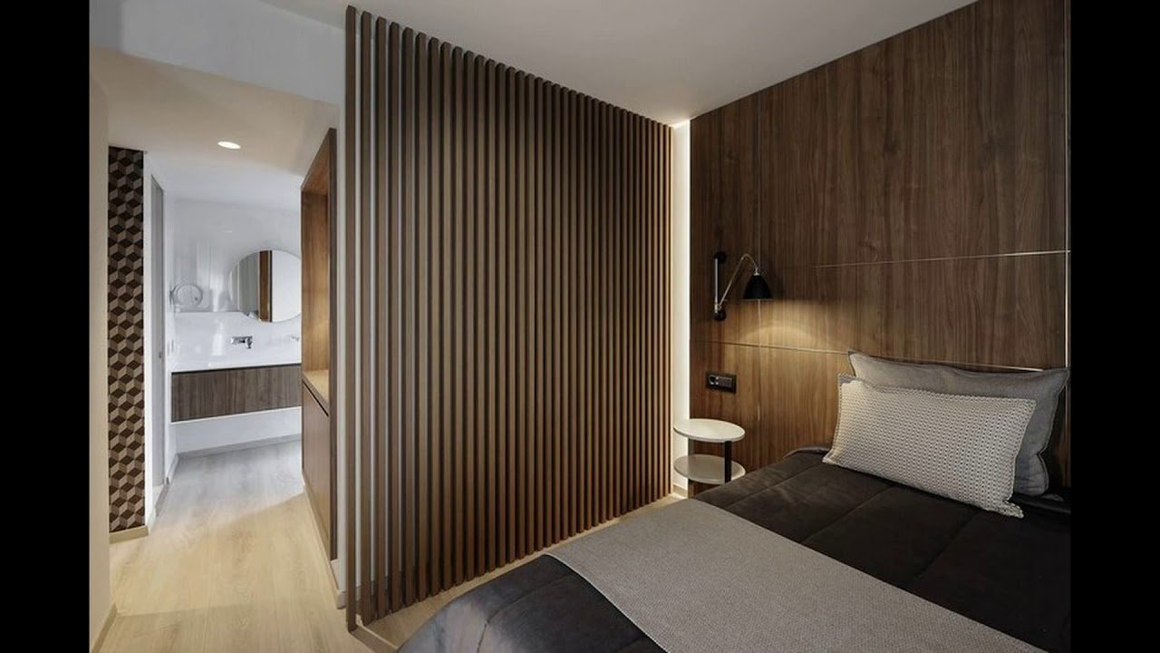 Спальня с деревянными рейками на стене