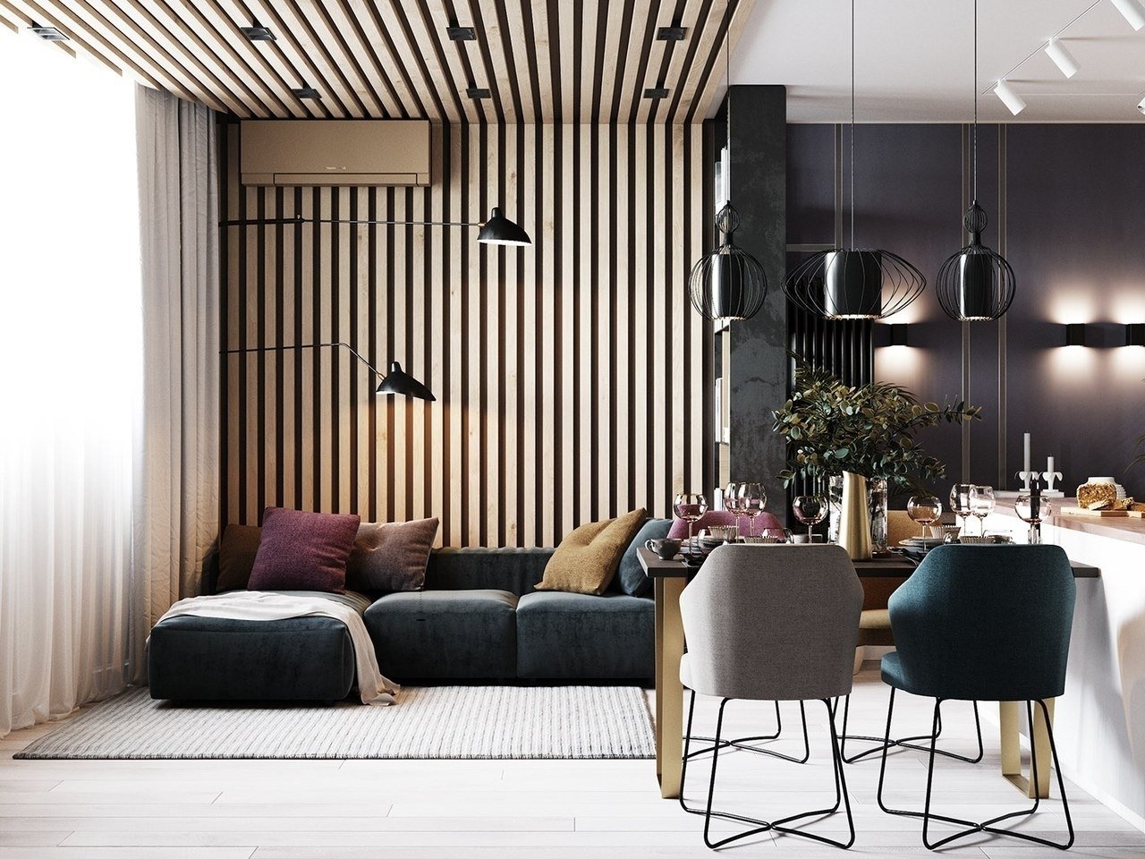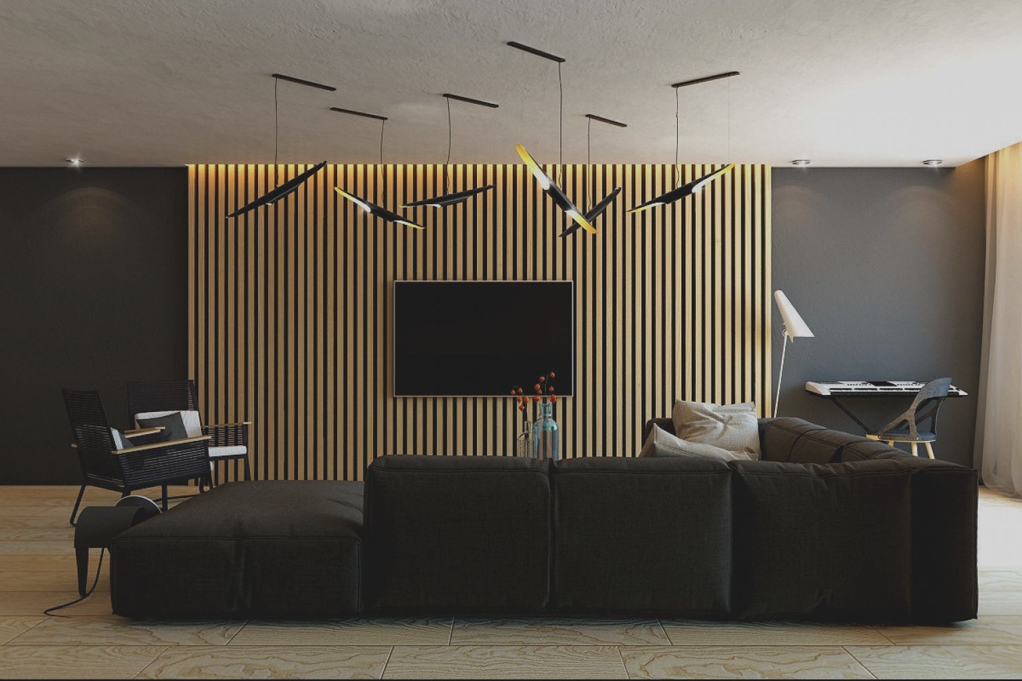 Гостиная с деревянными рейками