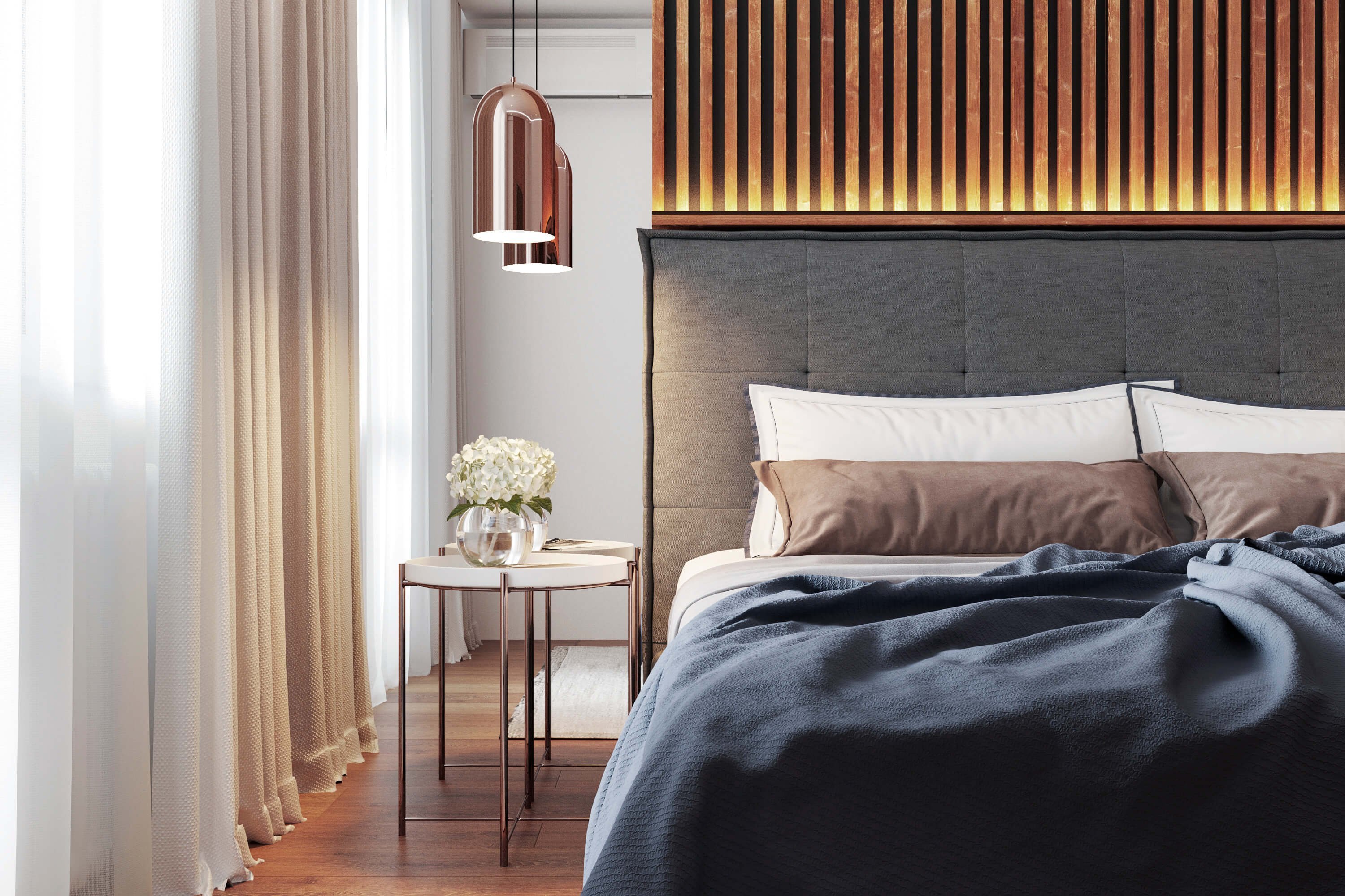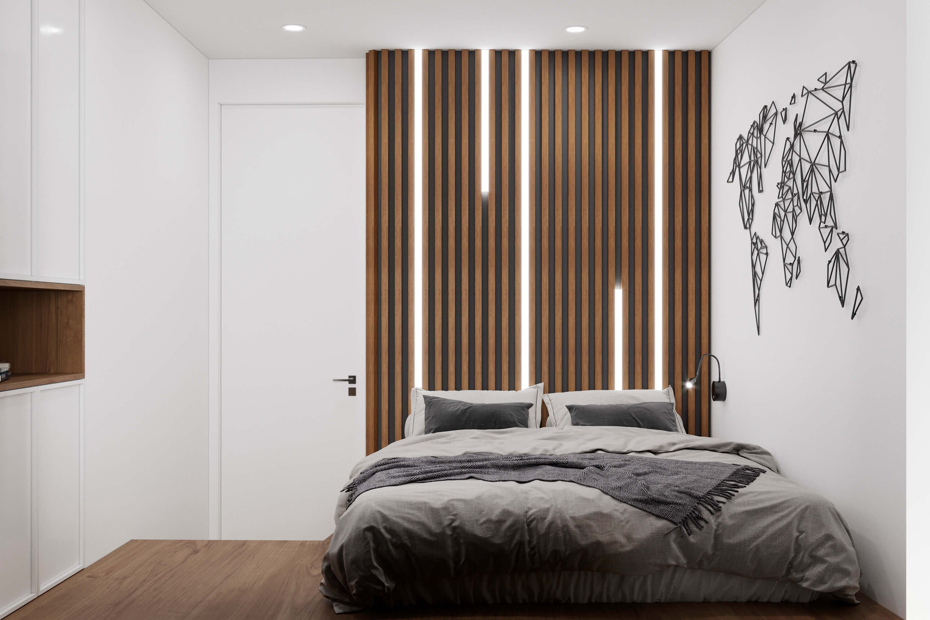 Серая спальня с рейками