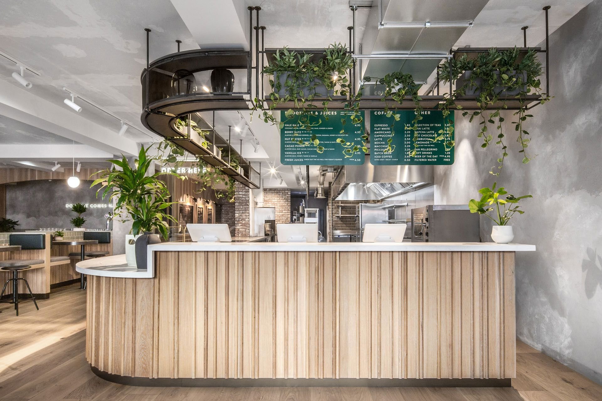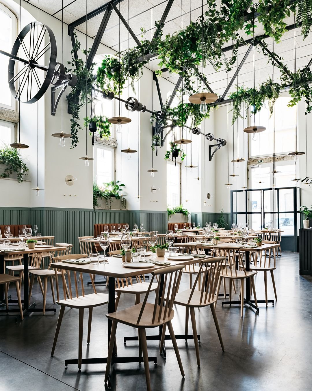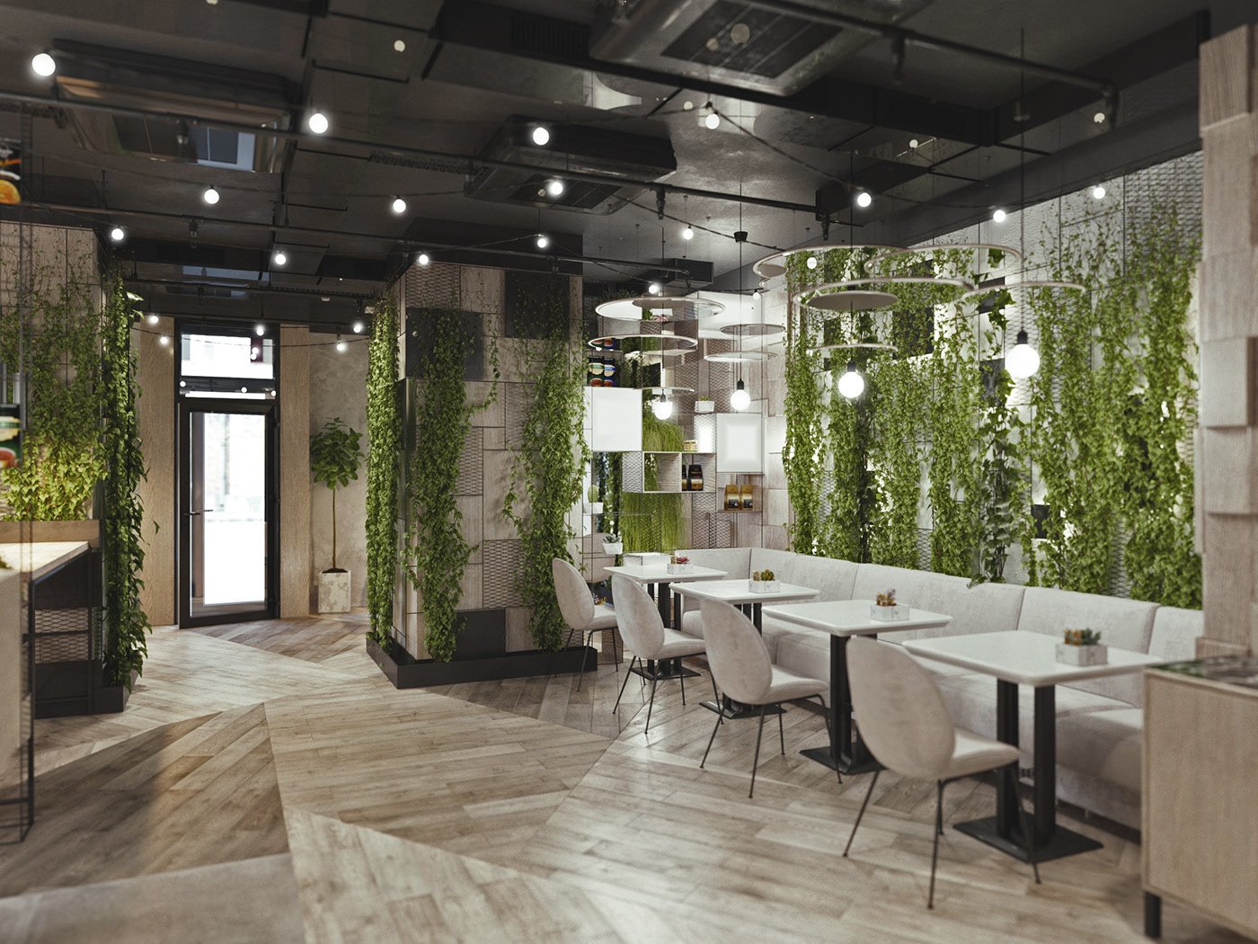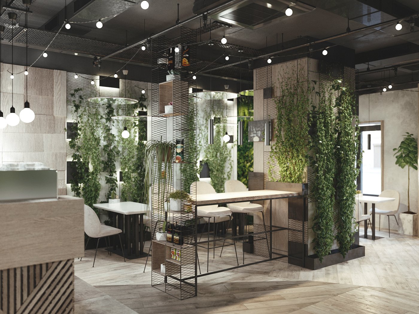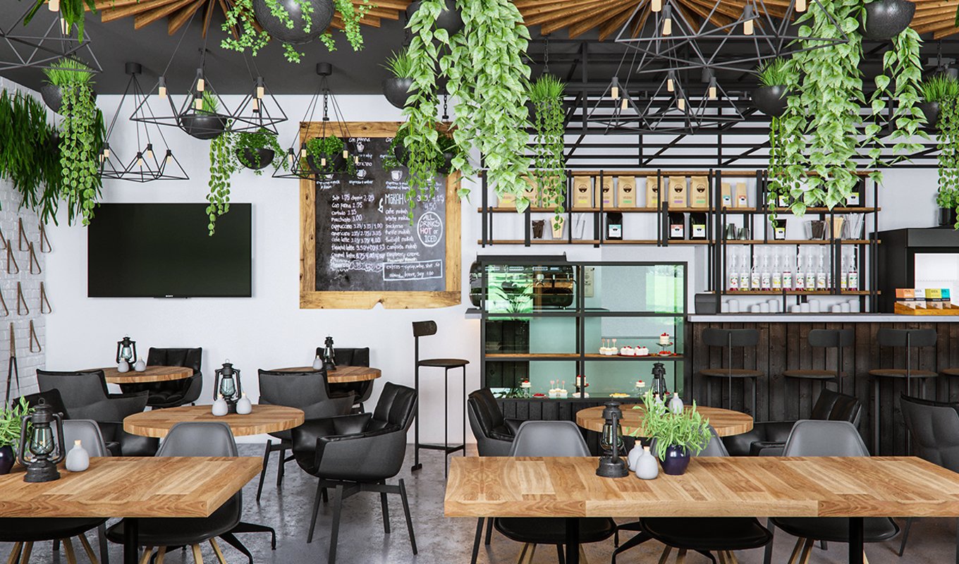 Кафе в стиле лофт с зеленью