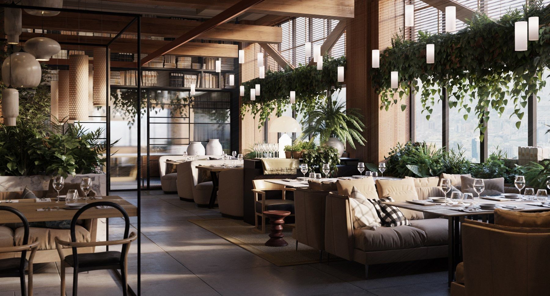 Кафе с панорамными окнами в экостиле