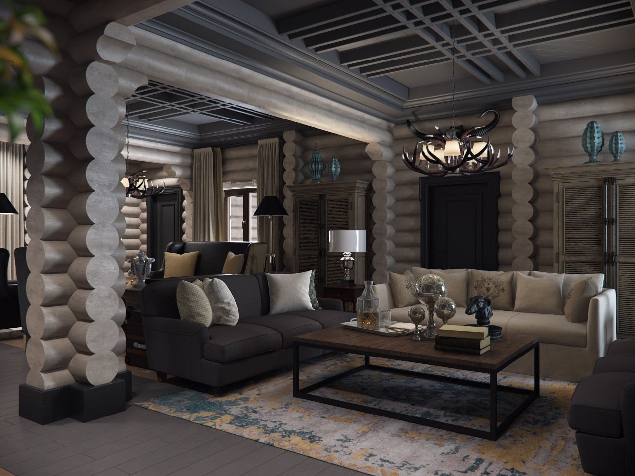 Интерьер брусового дома в серых тонах