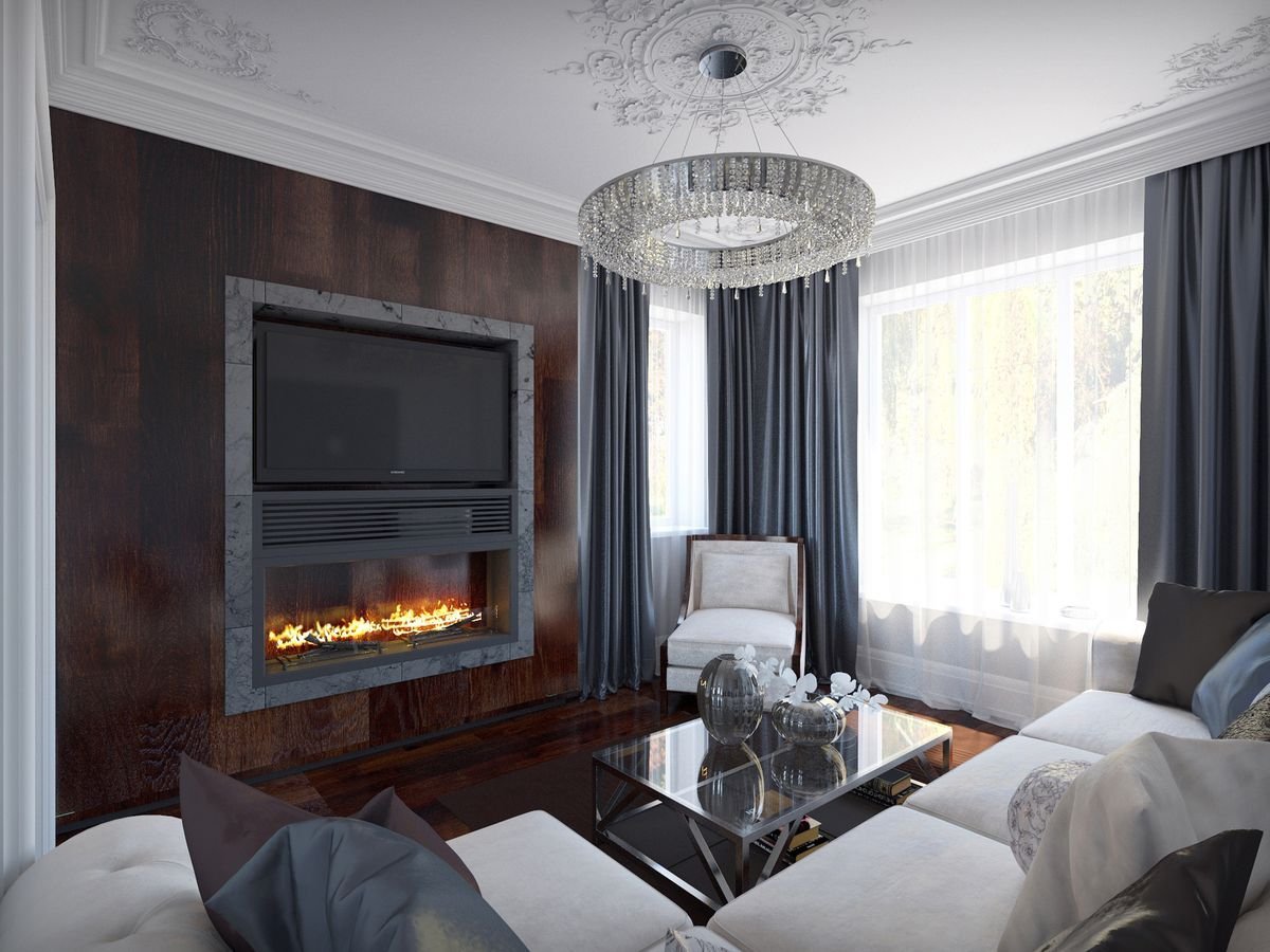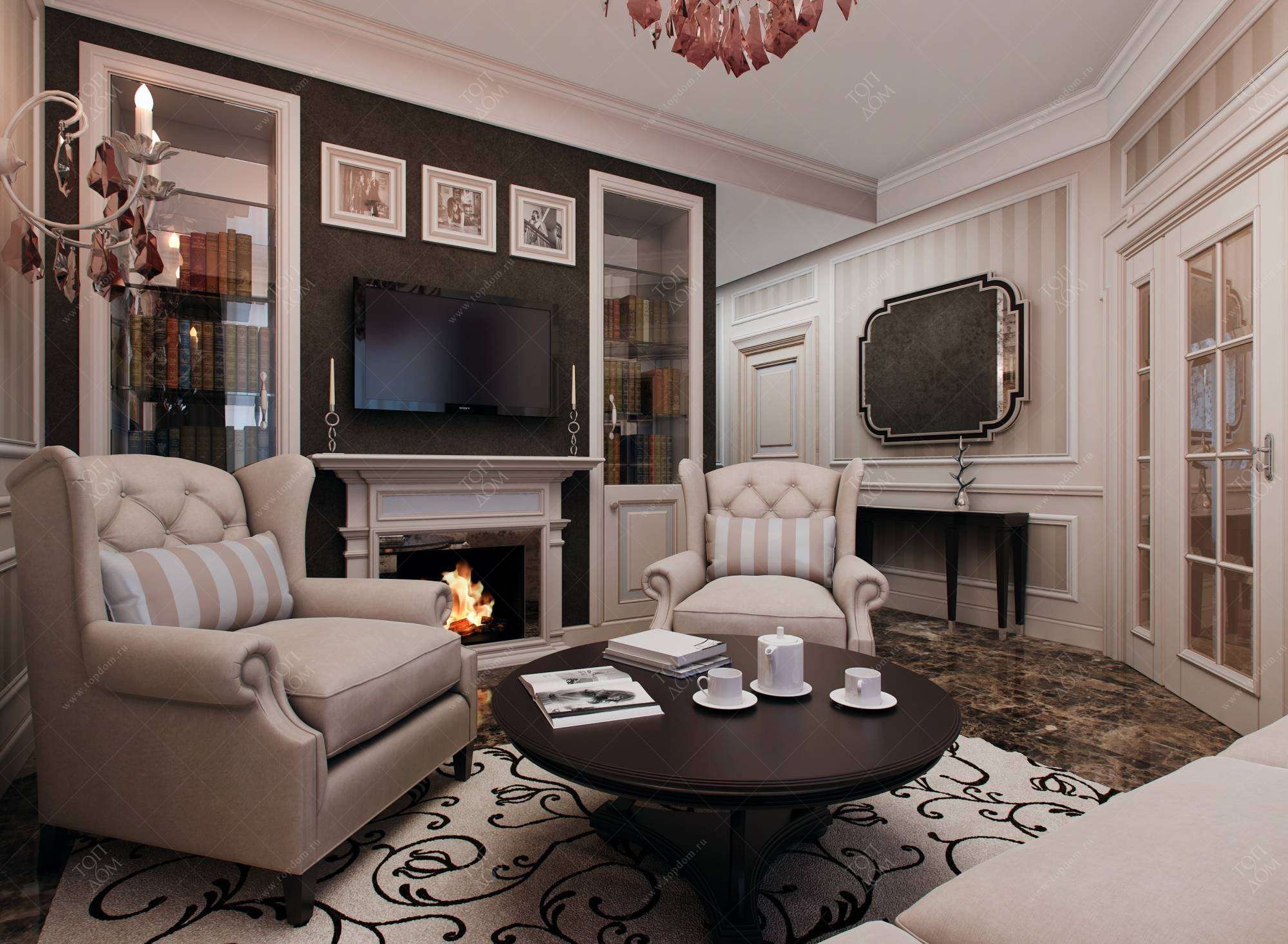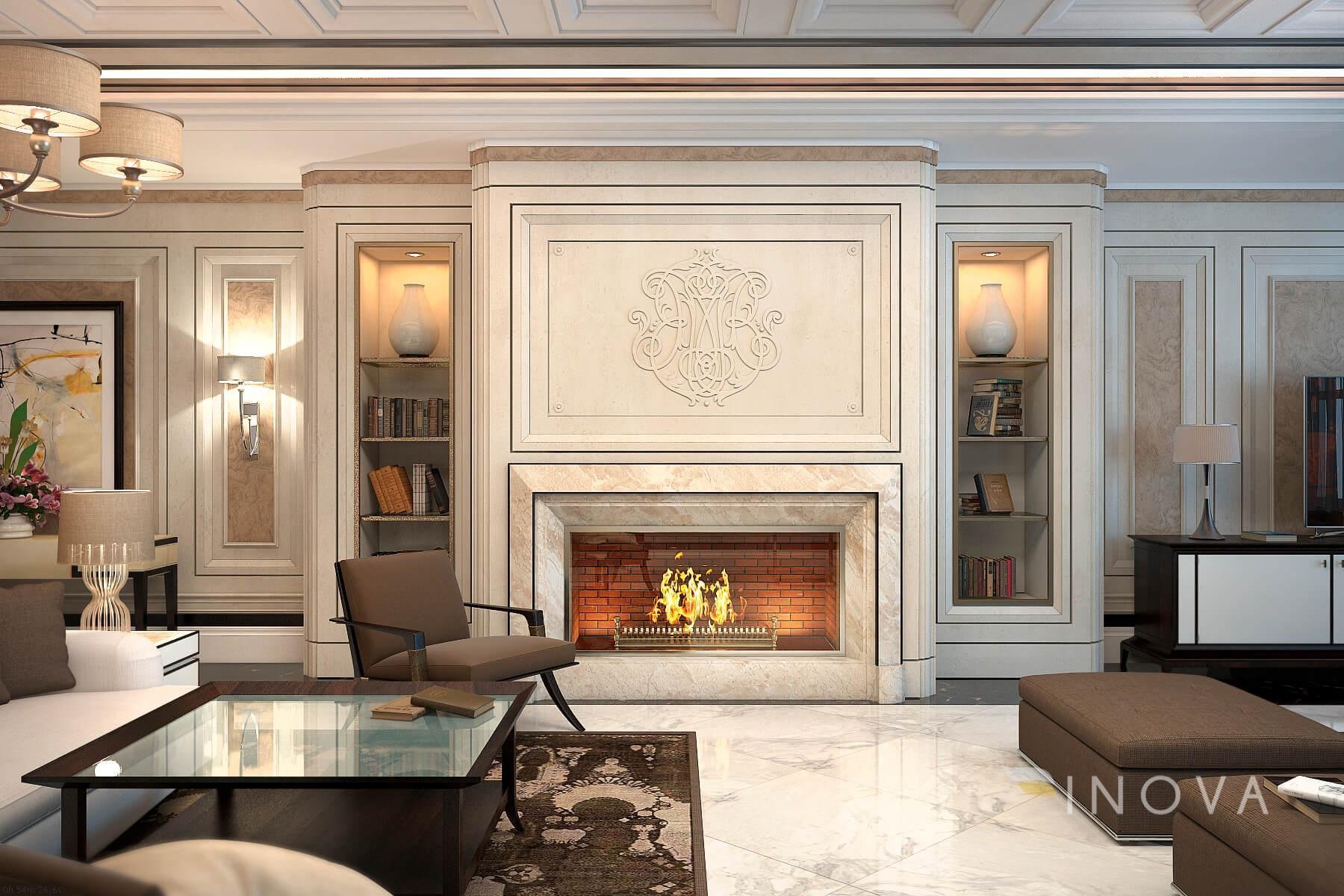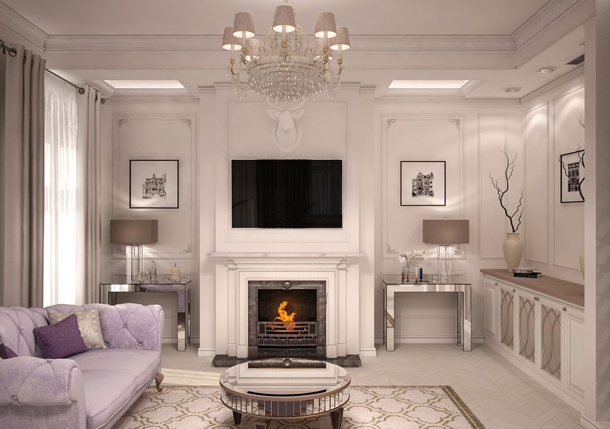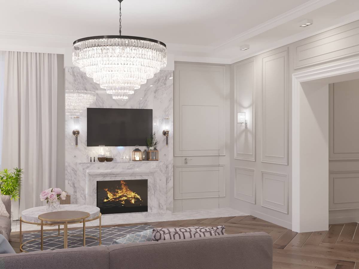 Неоклассика в интерьере гостиной с камином
