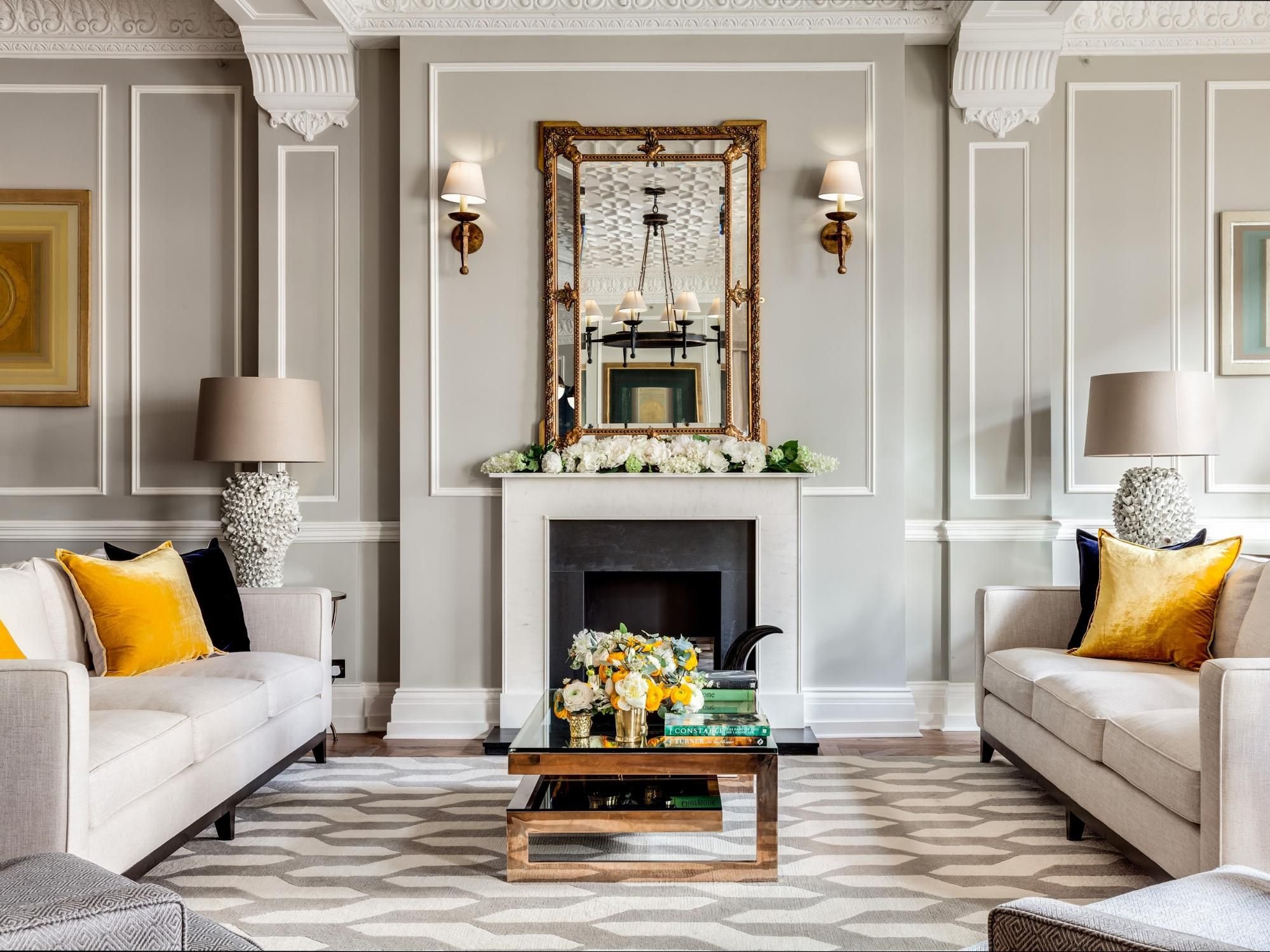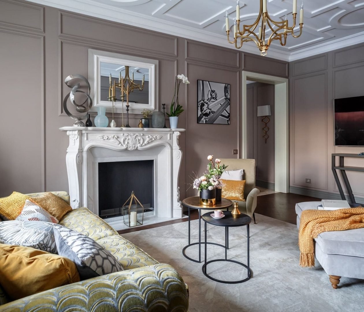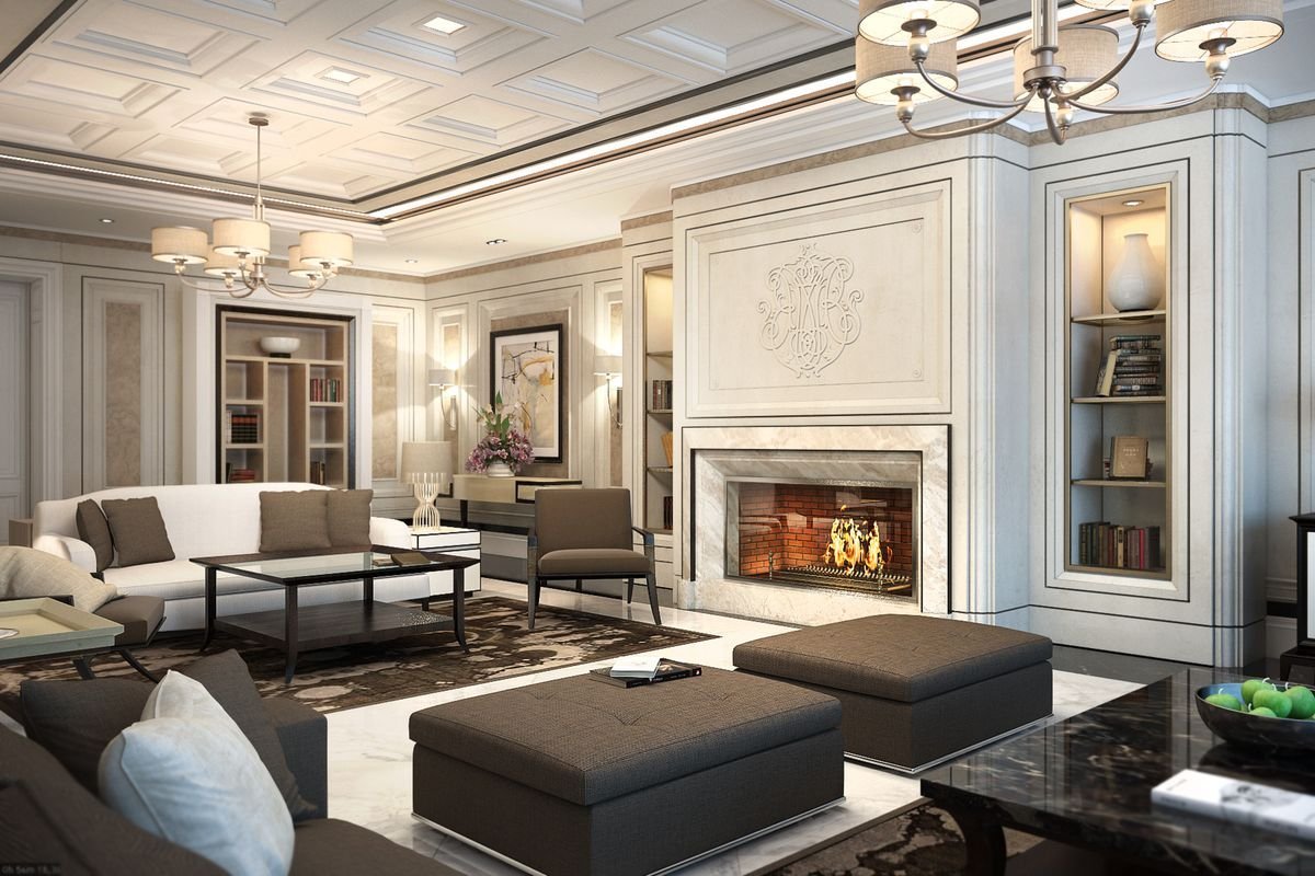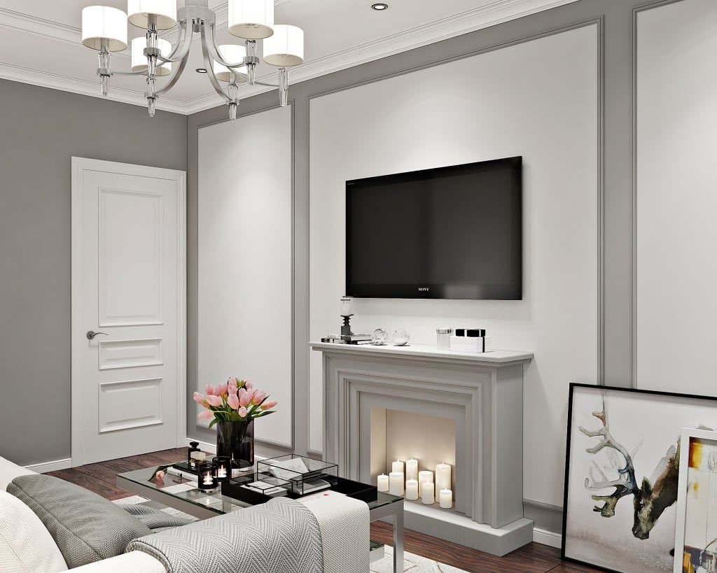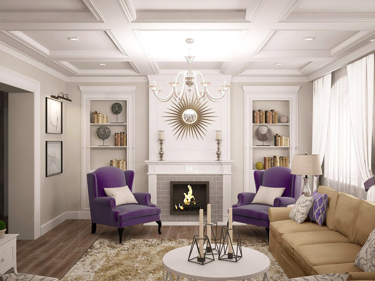 Неоклассика в интерьере гостиной с камином
