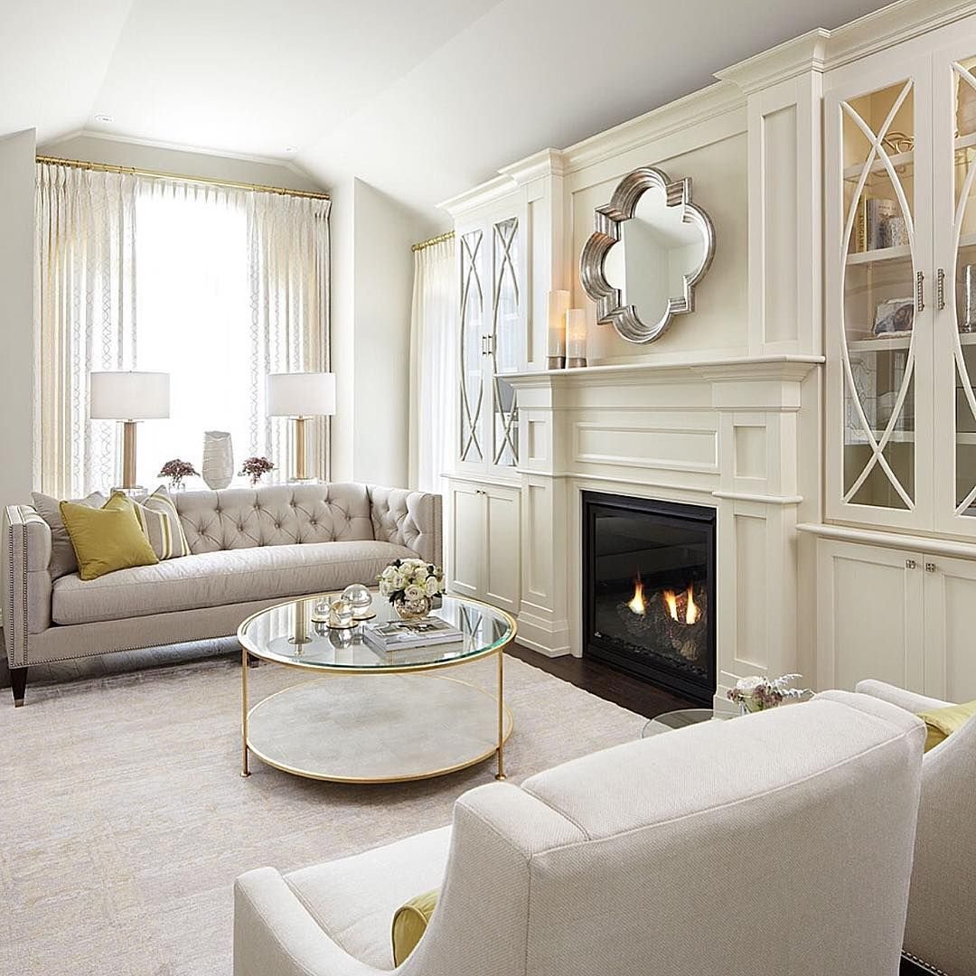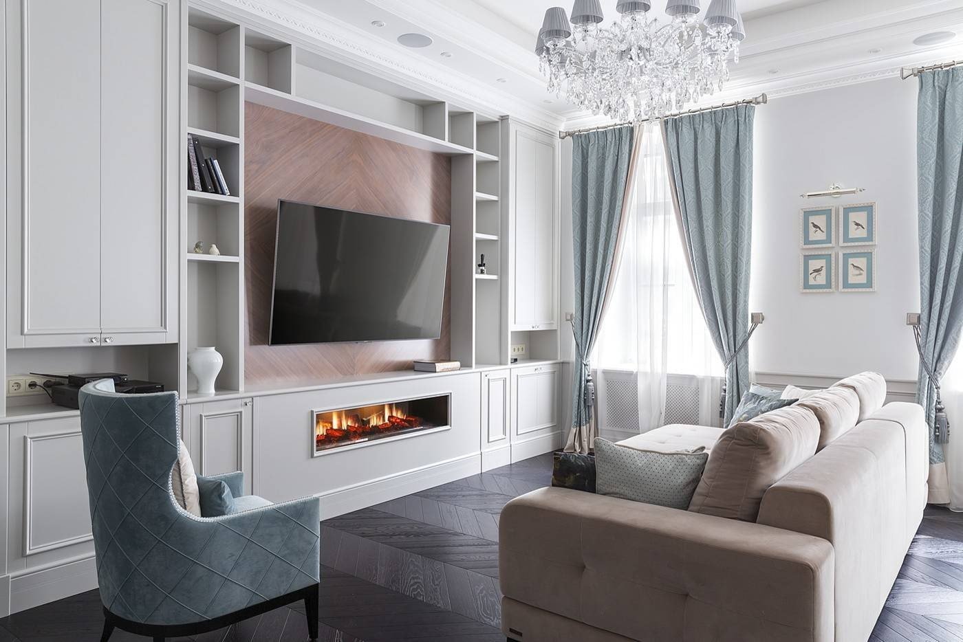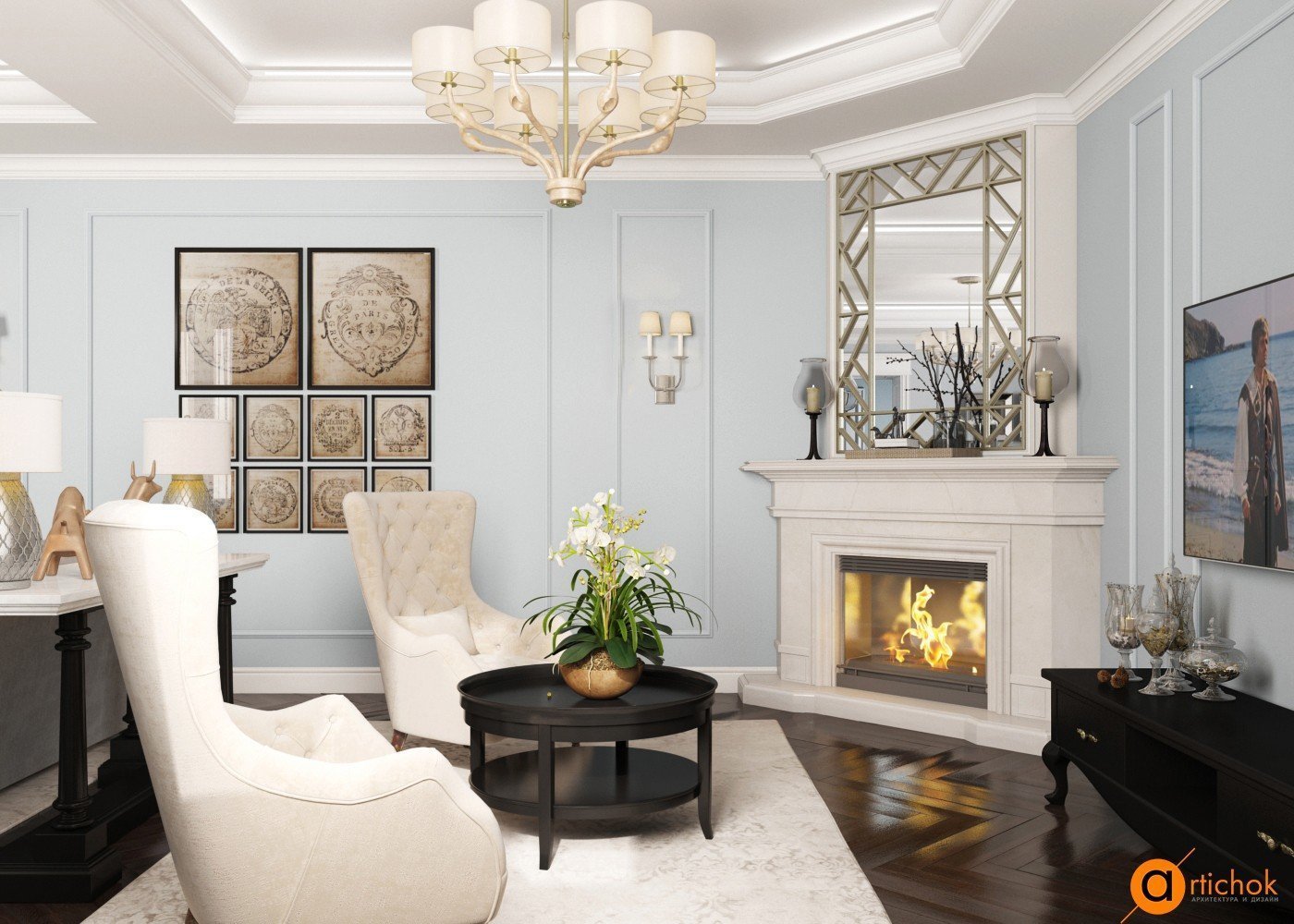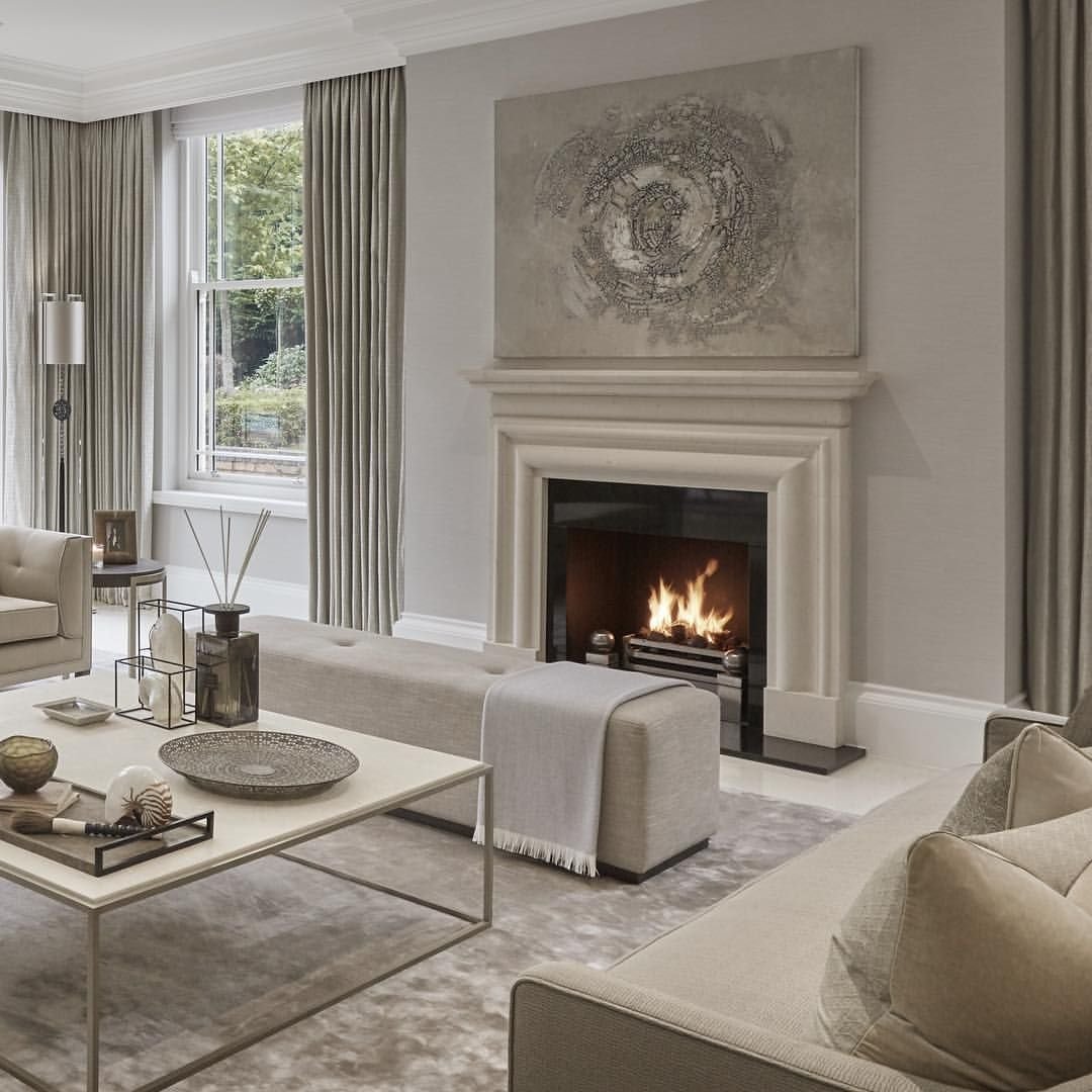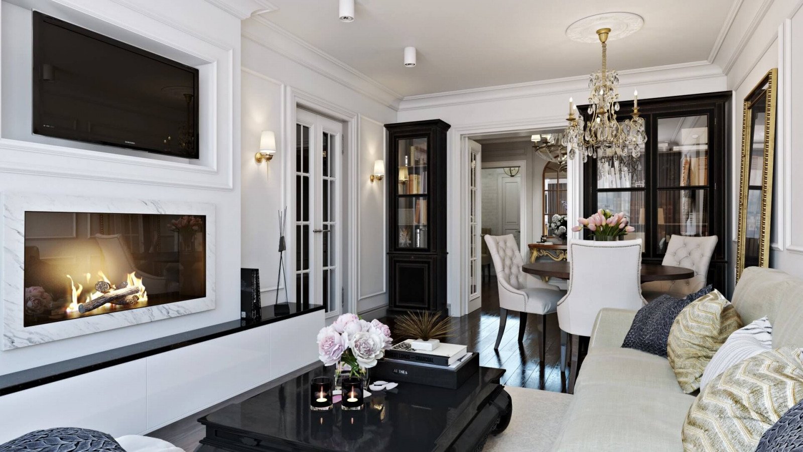 Неоклассика в интерьере гостиной с камином