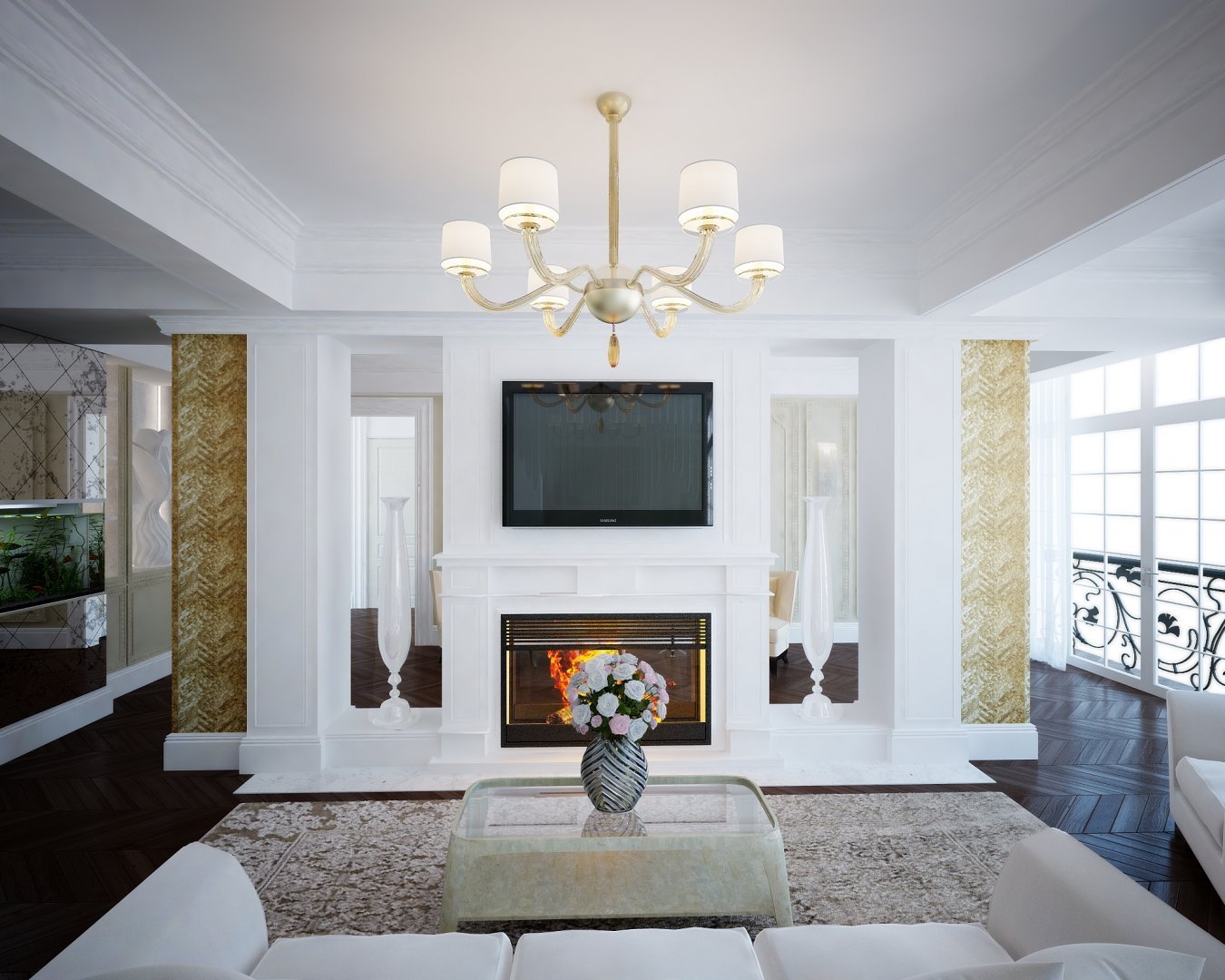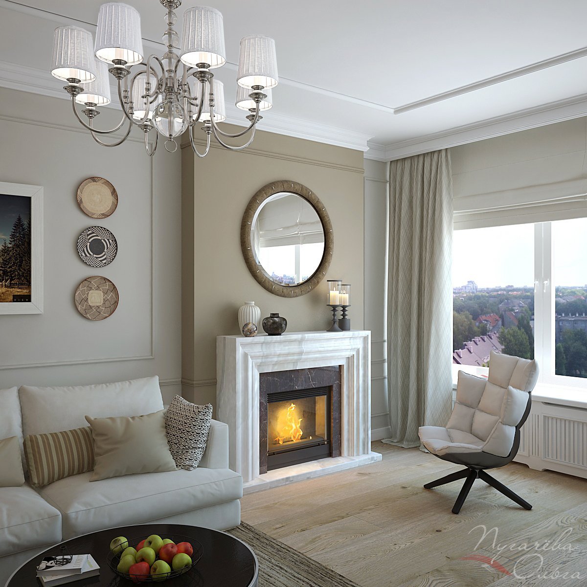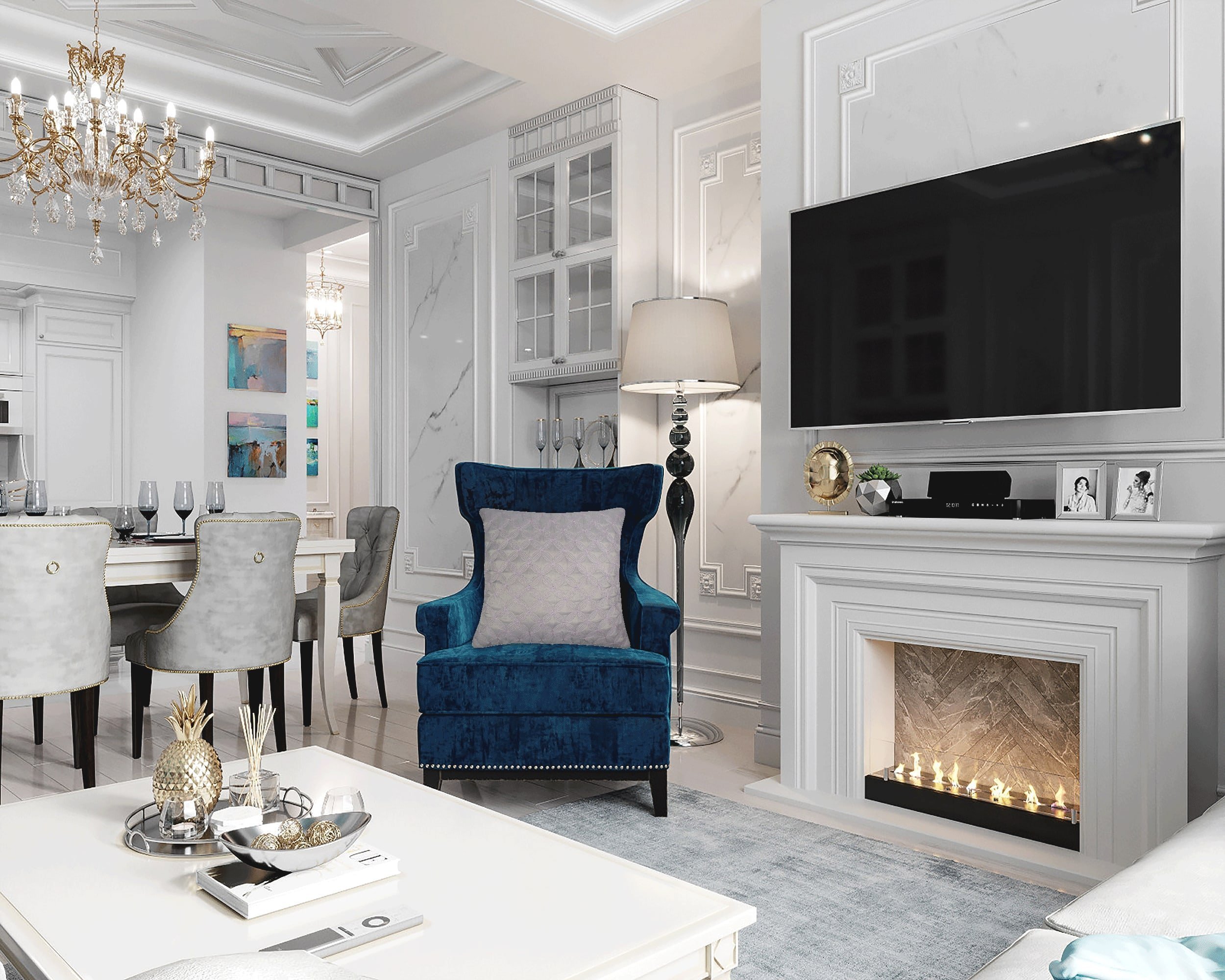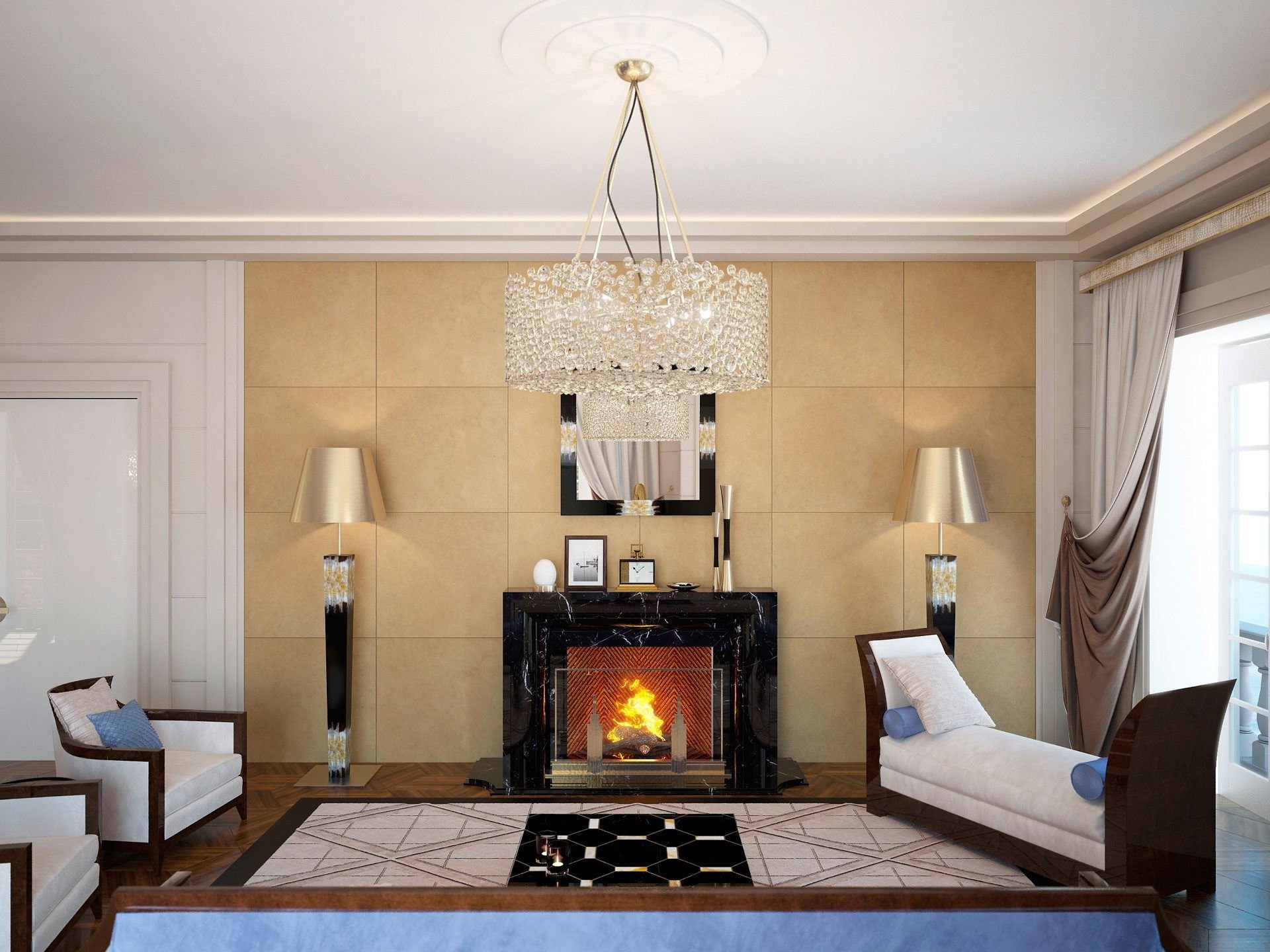 Неоклассика в интерьере гостиной с камином