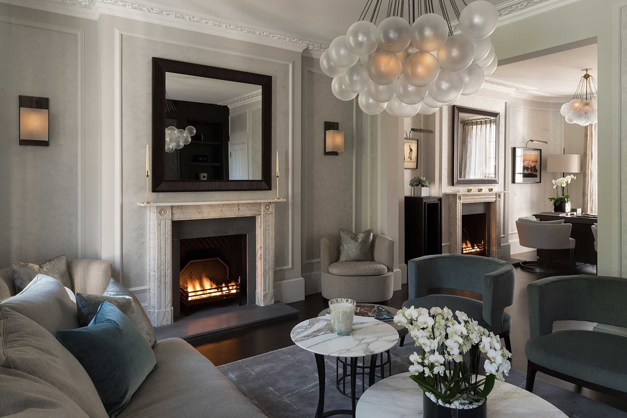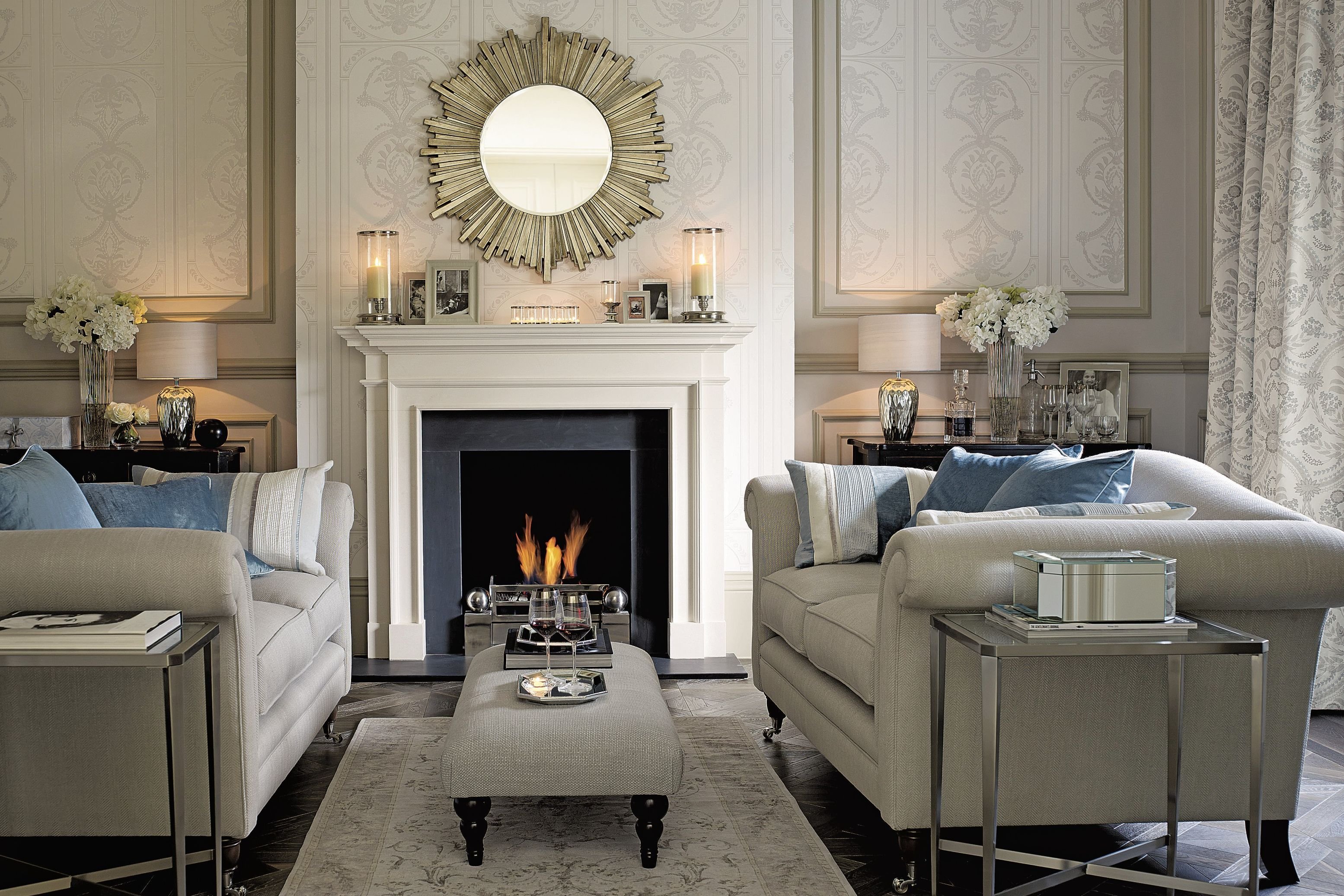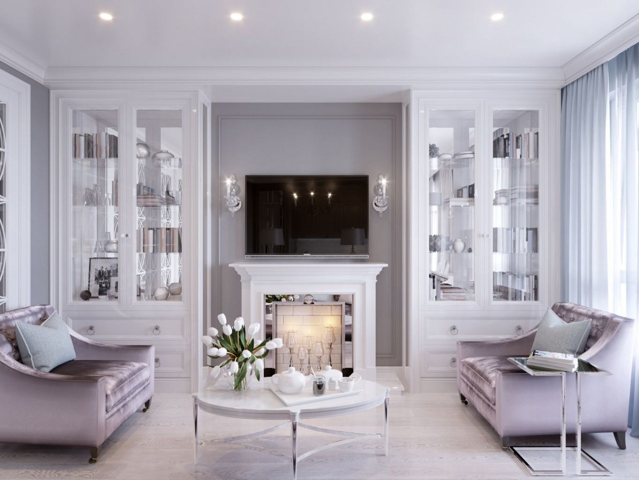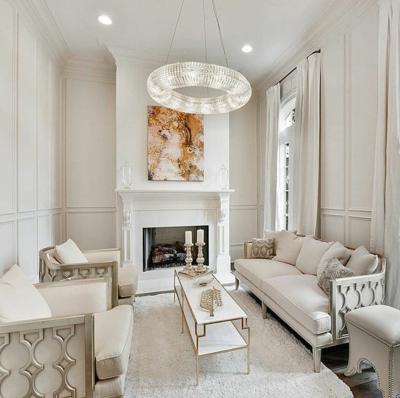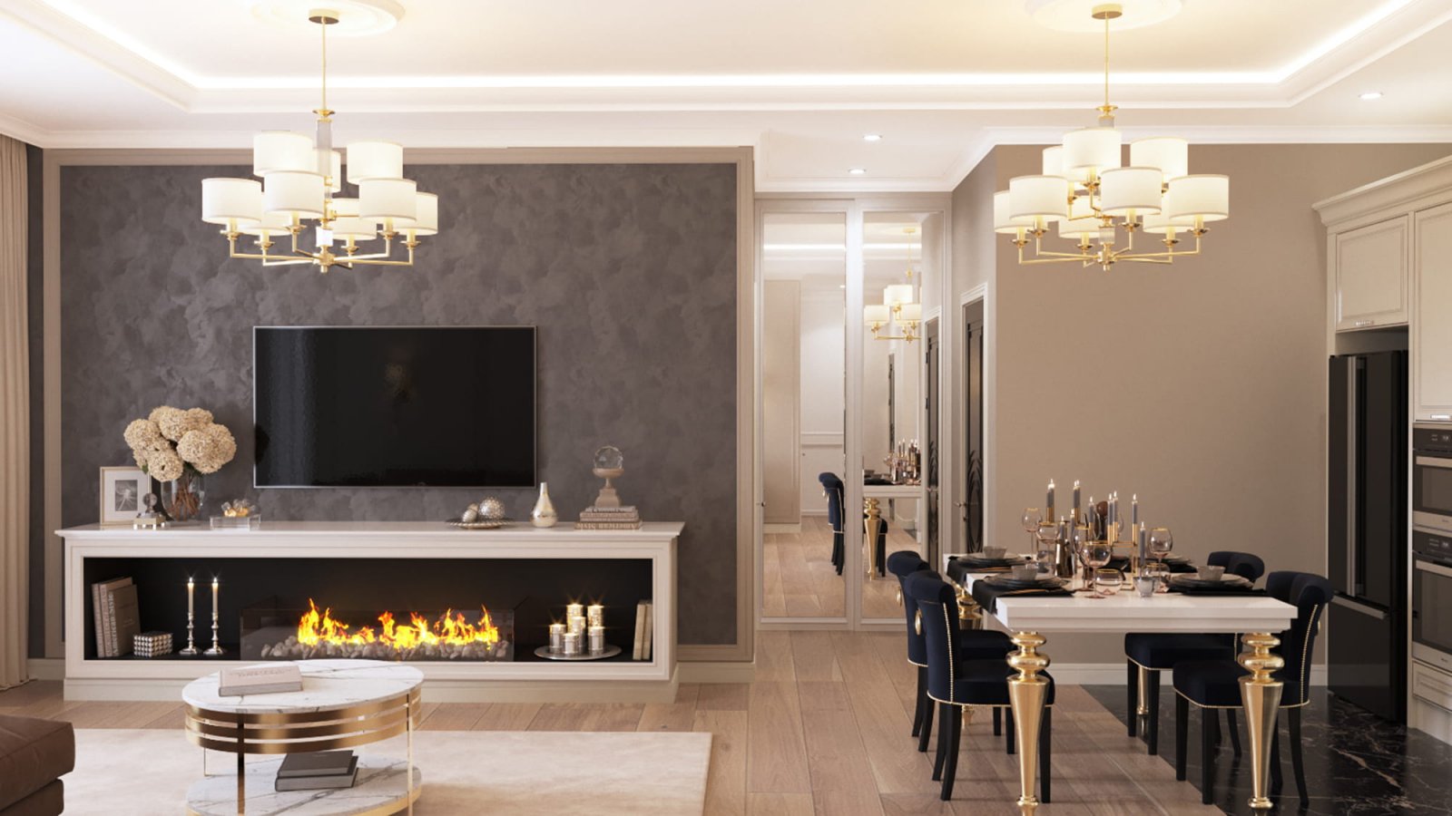 Неоклассика в интерьере гостиной с камином