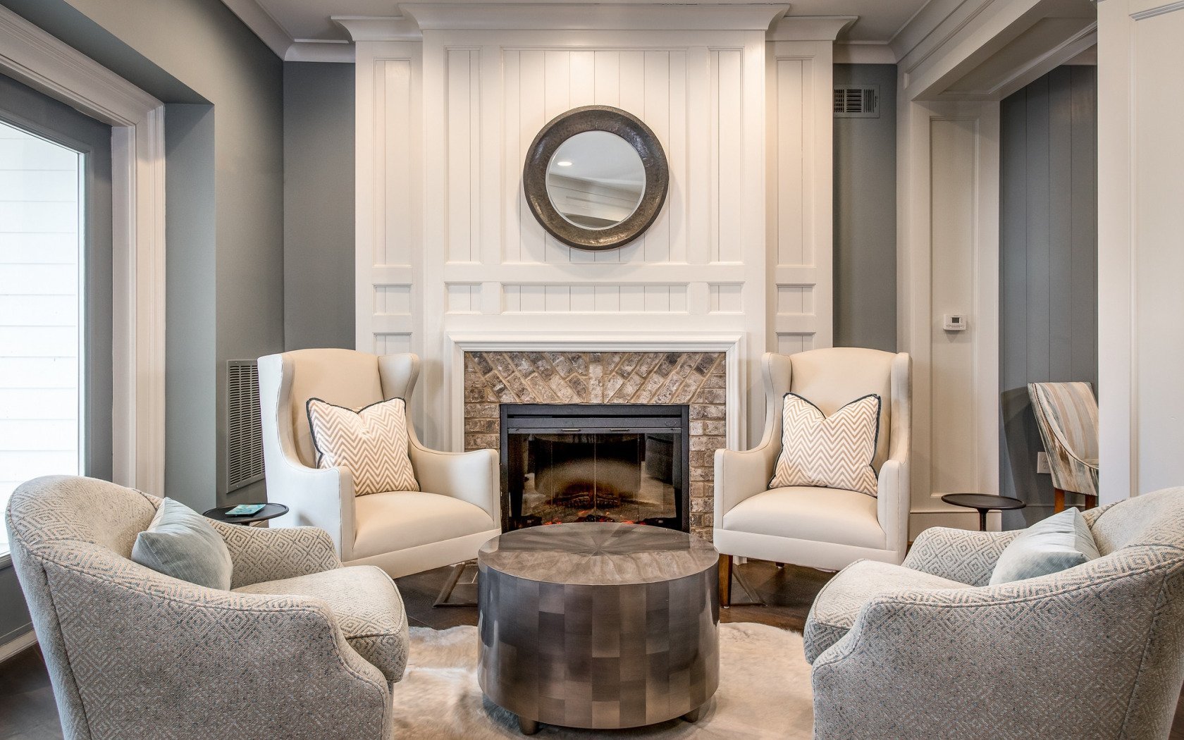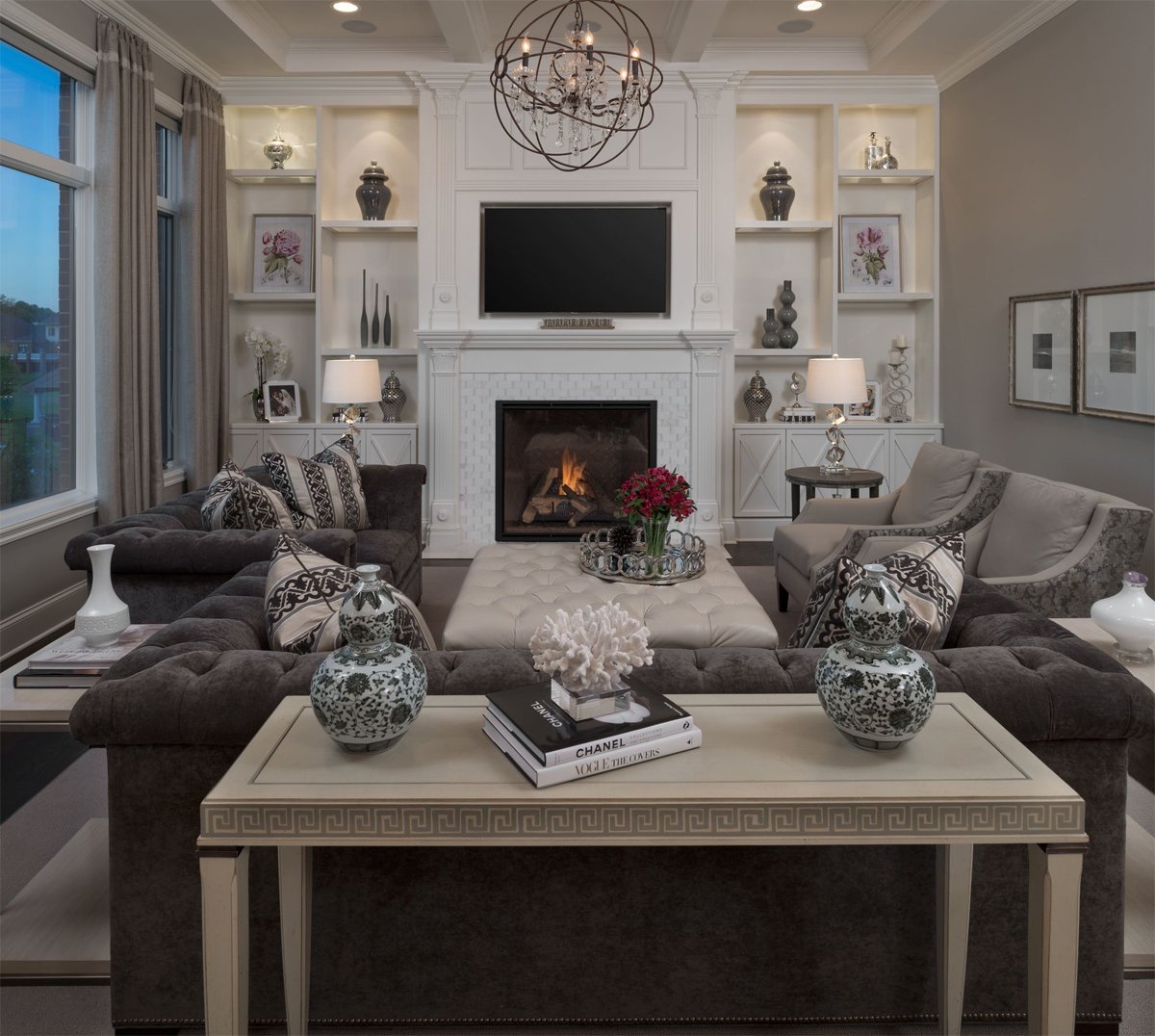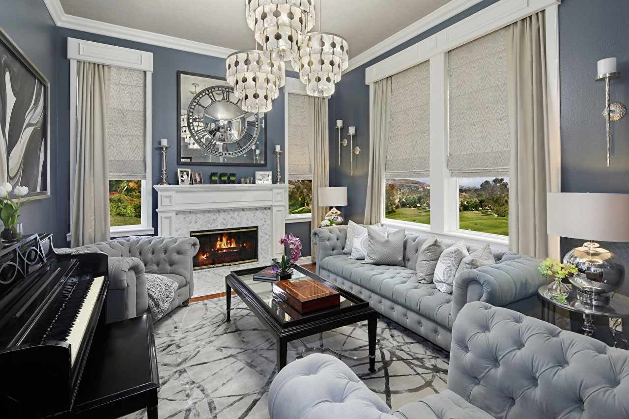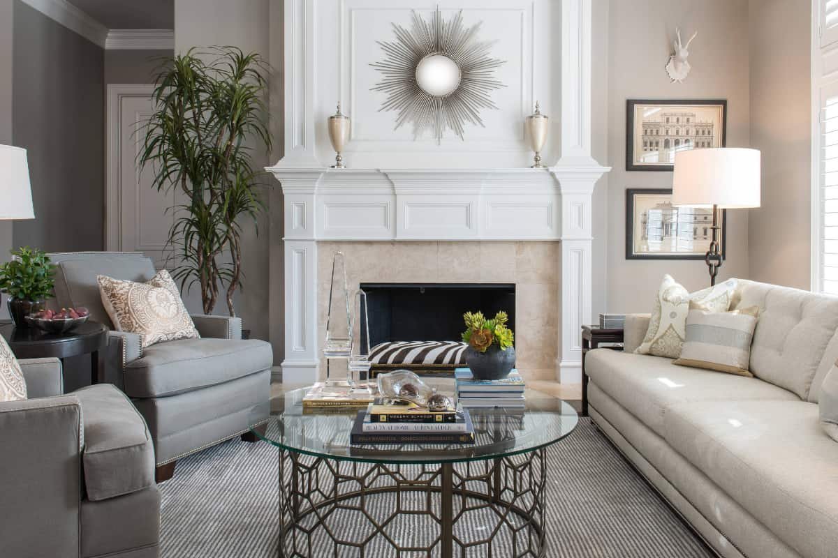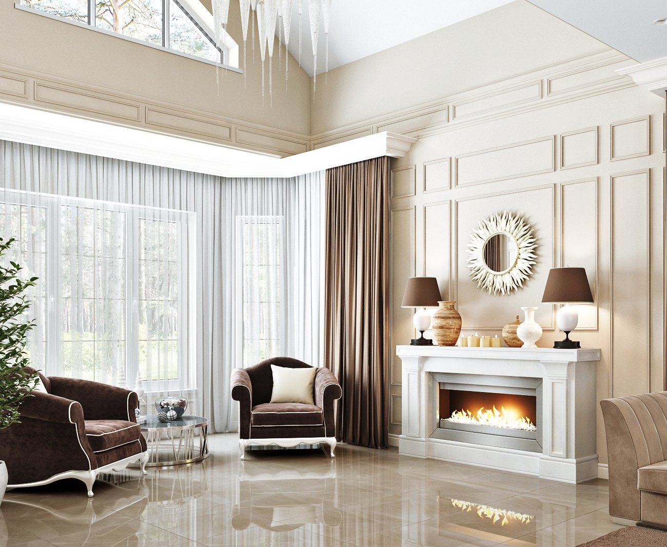 Неоклассика в интерьере гостиной с камином