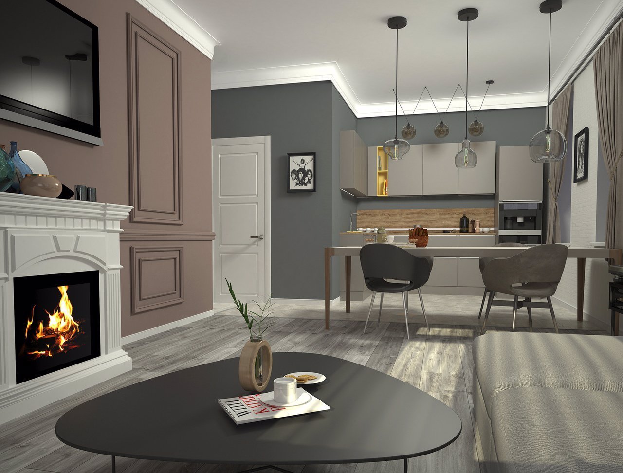 Гостиная с камином совмещенная с кухней