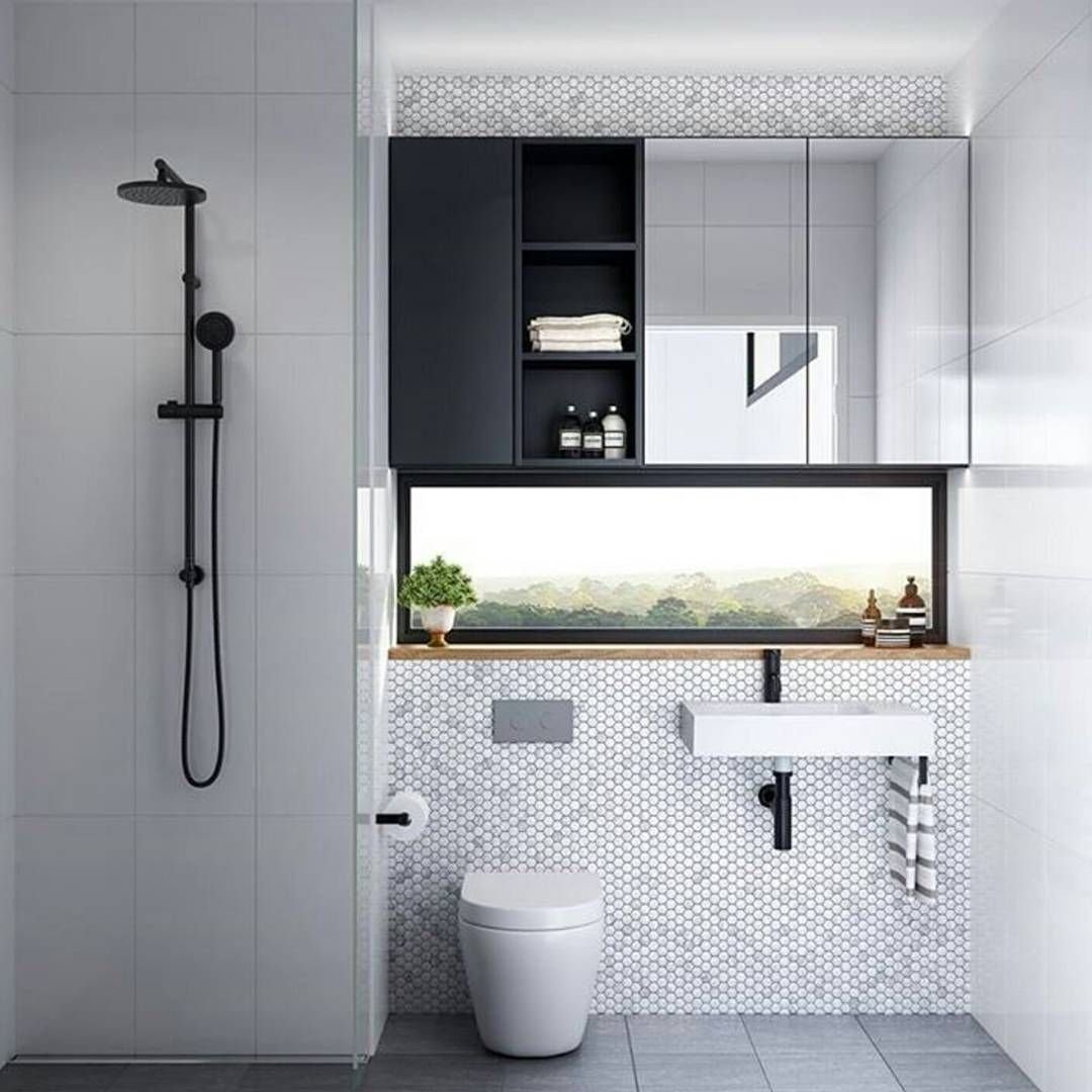 Белая ванная с черными аксессуарами