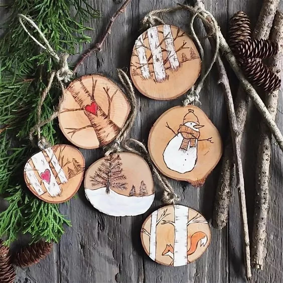 Елочные игрушки на спилах дерева
