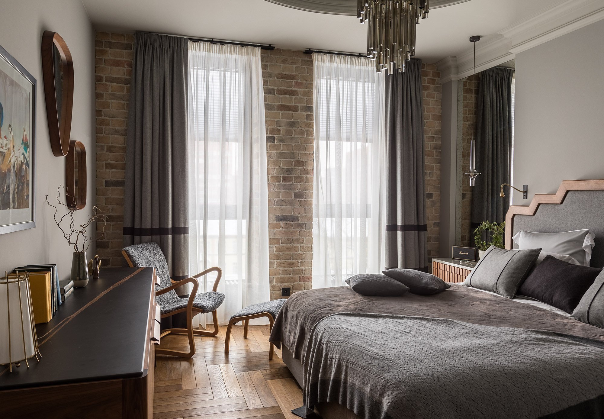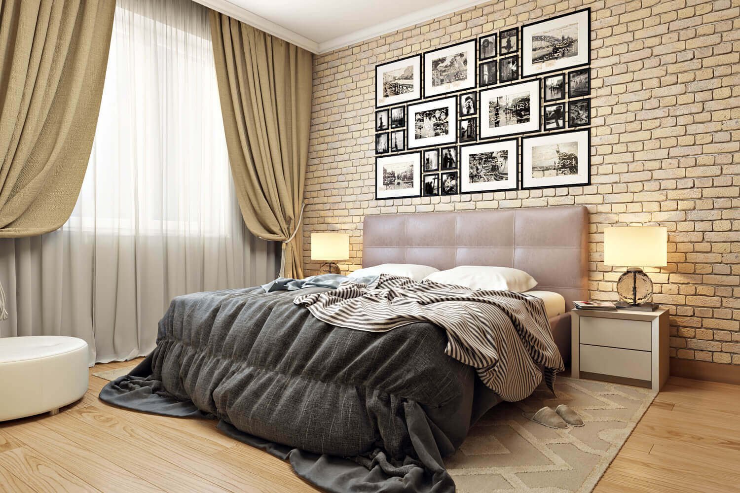 Серая спальня с кирпичиками