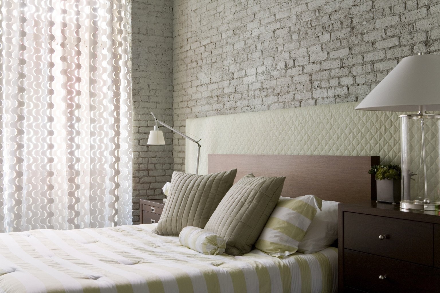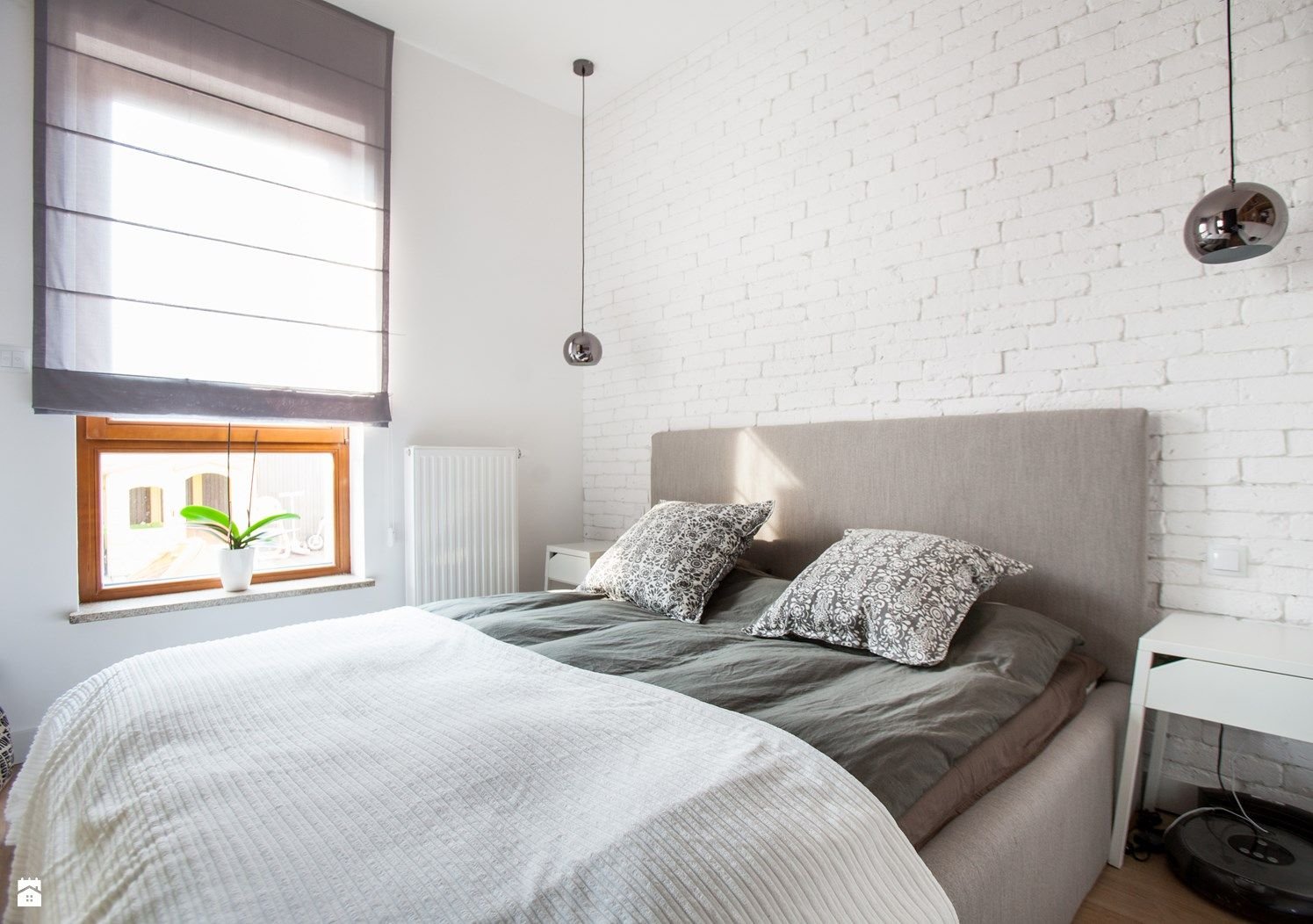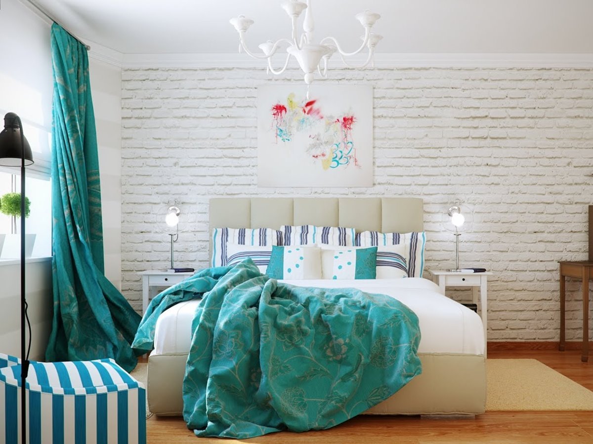Белая кирпичная стена в спальне