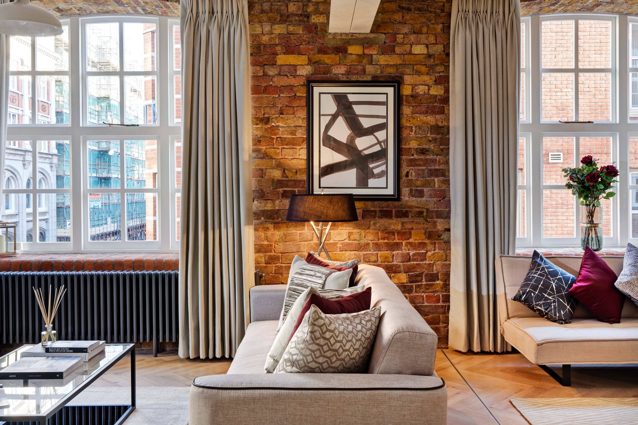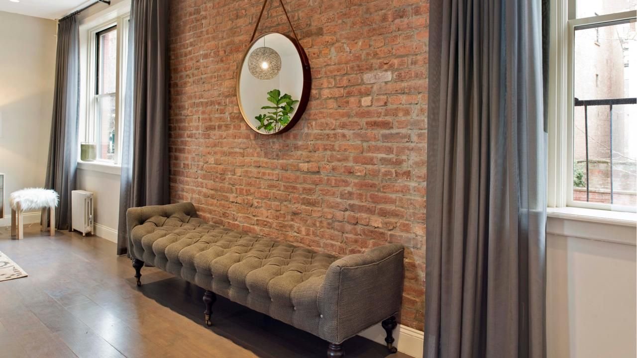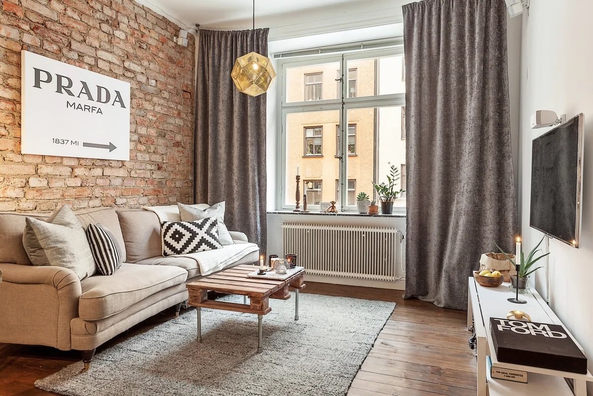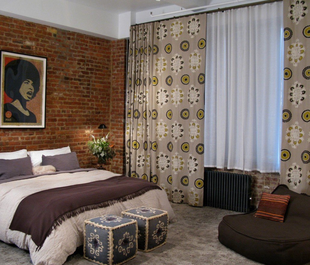 Кирпичная стена и шторы в интерьере