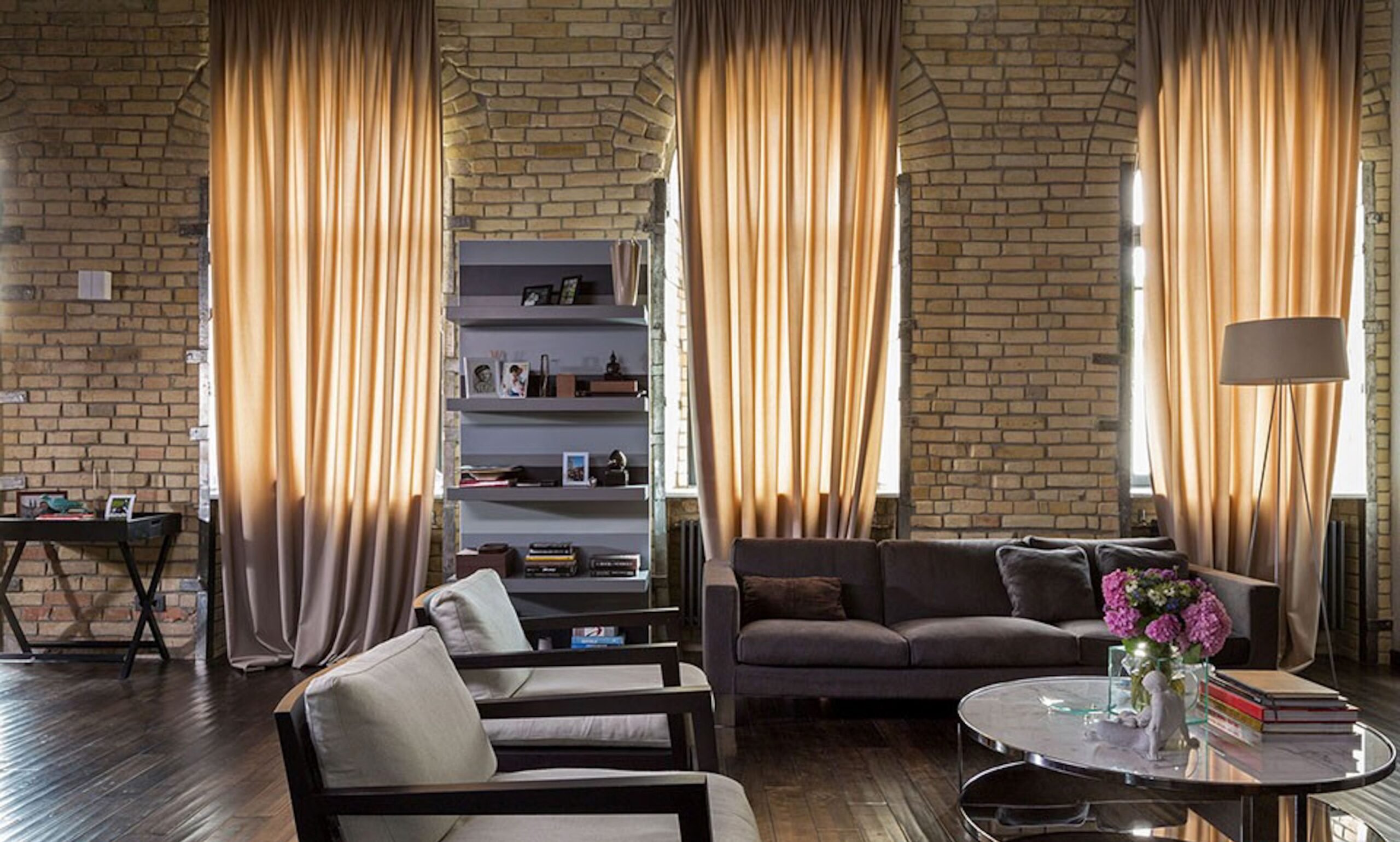 Портьеры в интерьере с кирпичной стеной