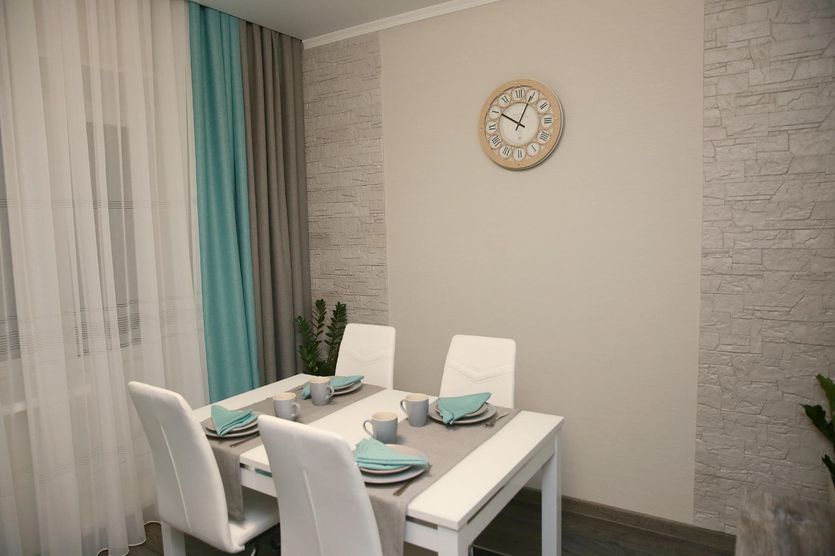 Бирюзовые шторы в интерьере кухни