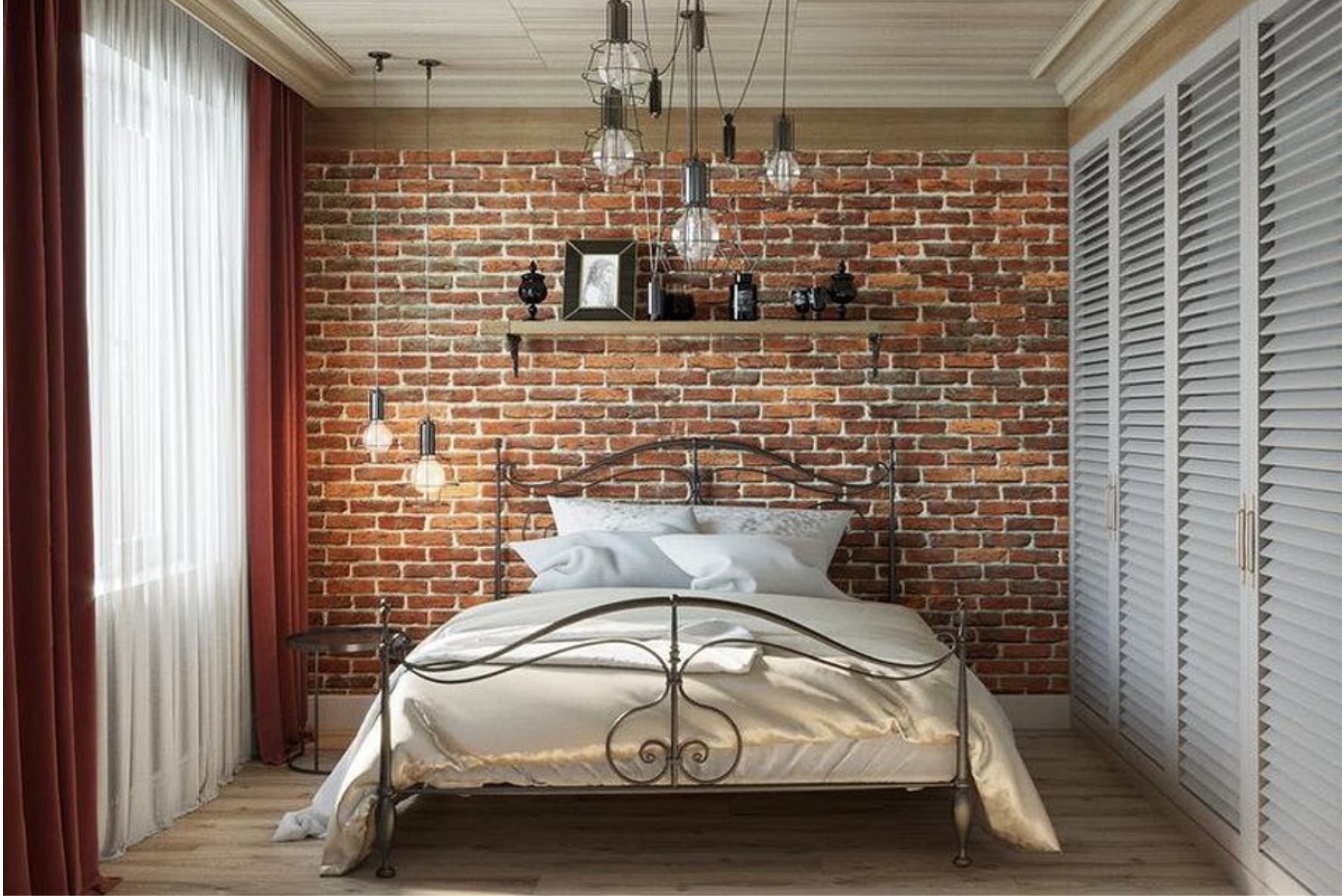 Красный кирпич в интерьере спальни