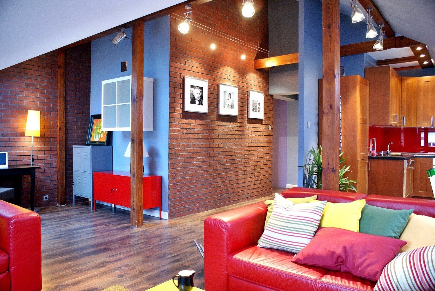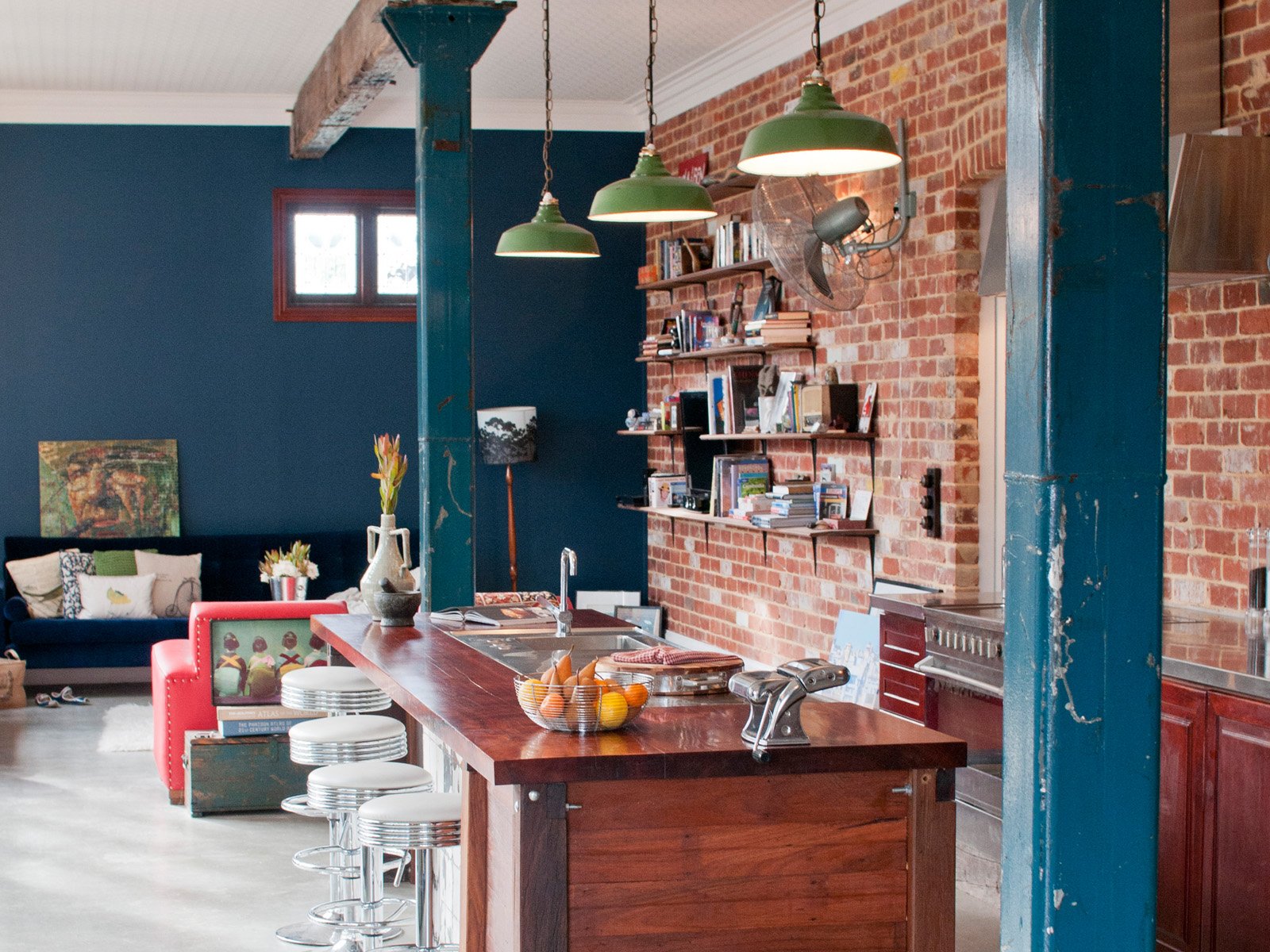 Красный кирпич в синем интерьере