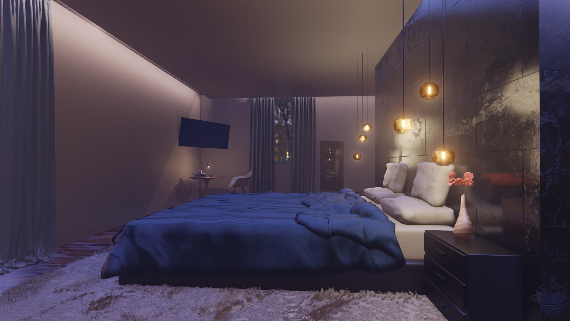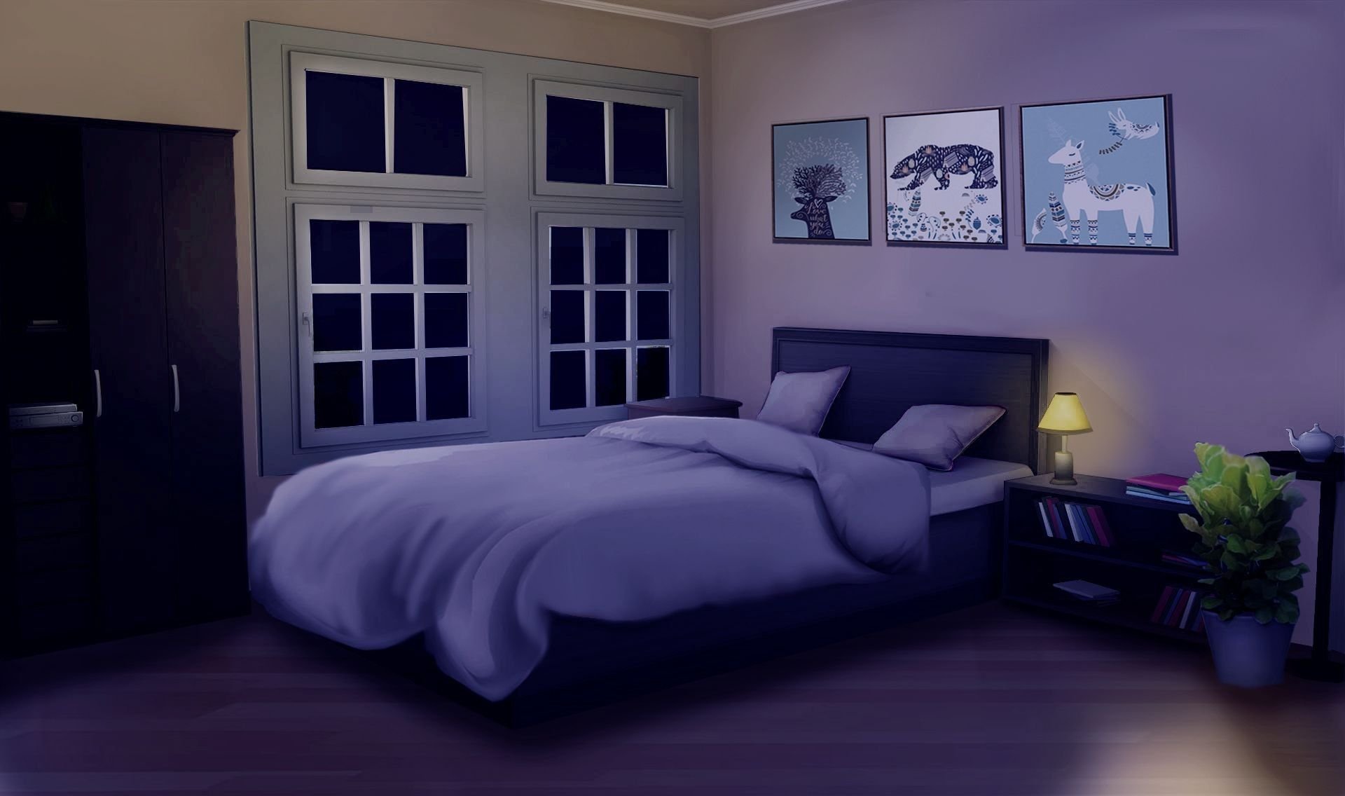 Комната с кроватью ночью
