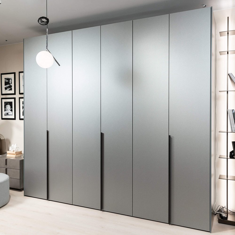 Серый шкаф с черными ручками