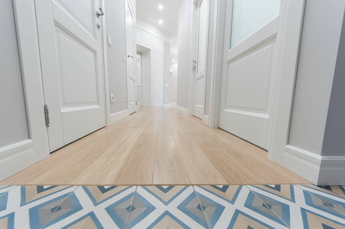 Комбинированный пол на кухне плитка и ламинат