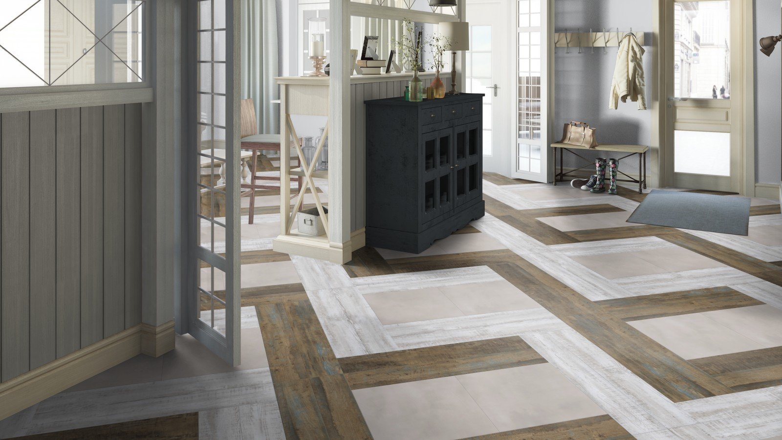 Сочетание плитки и ламината в прихожей
