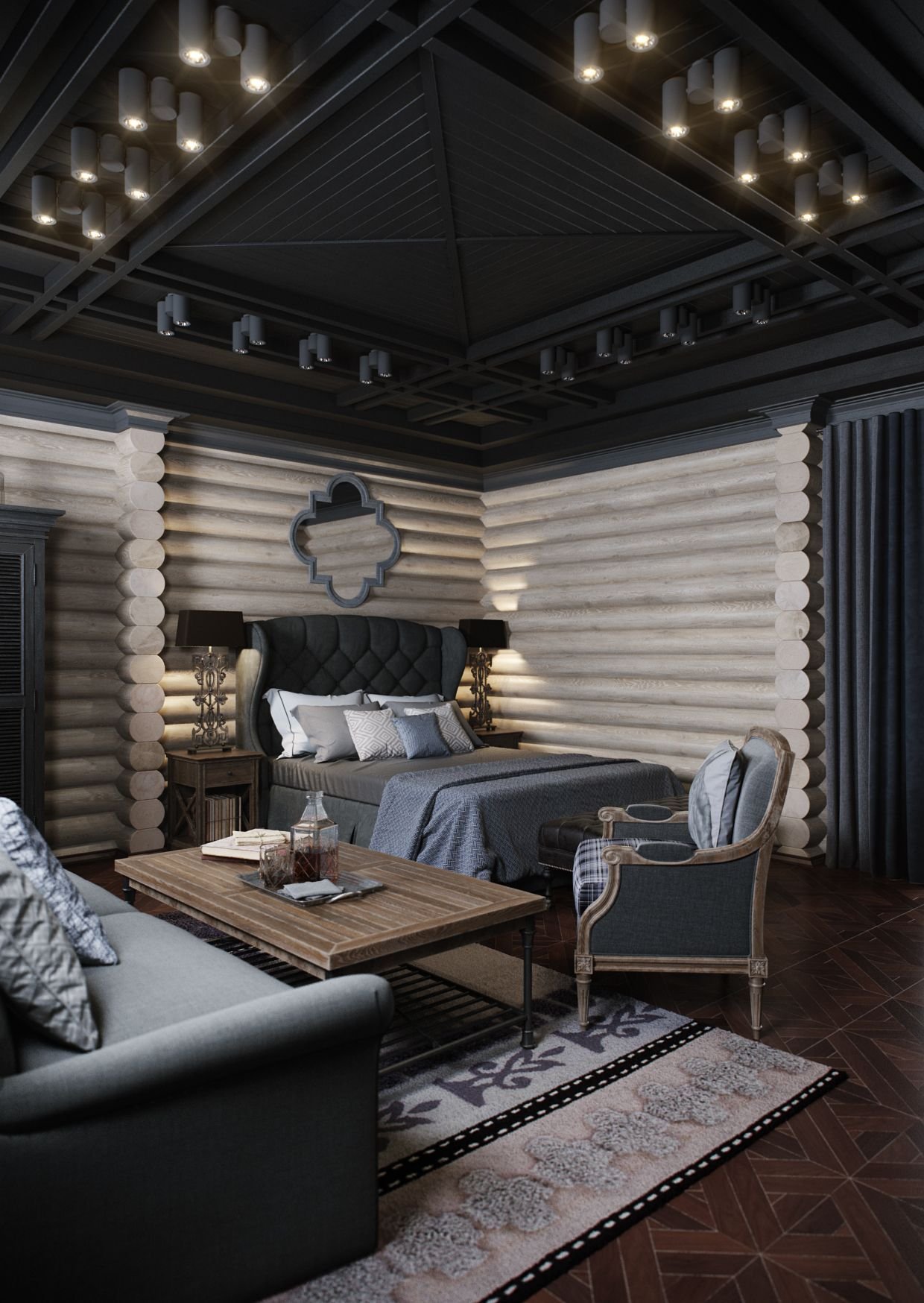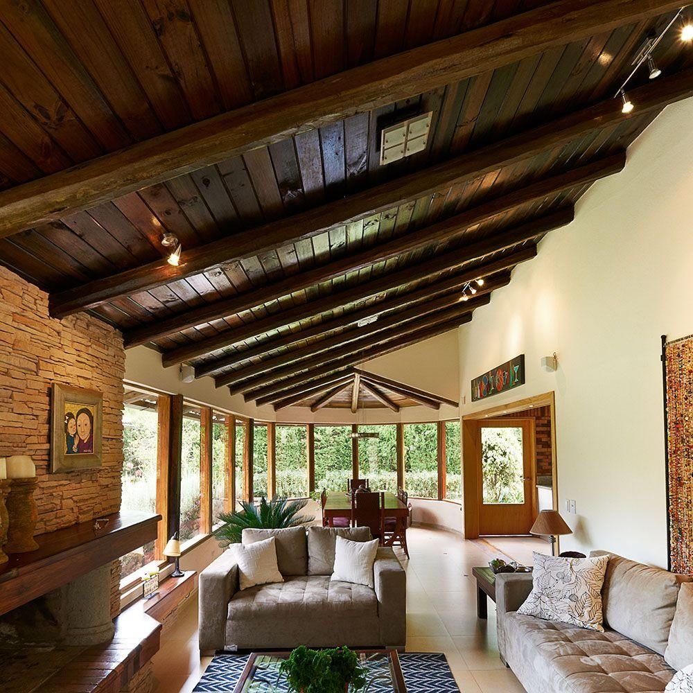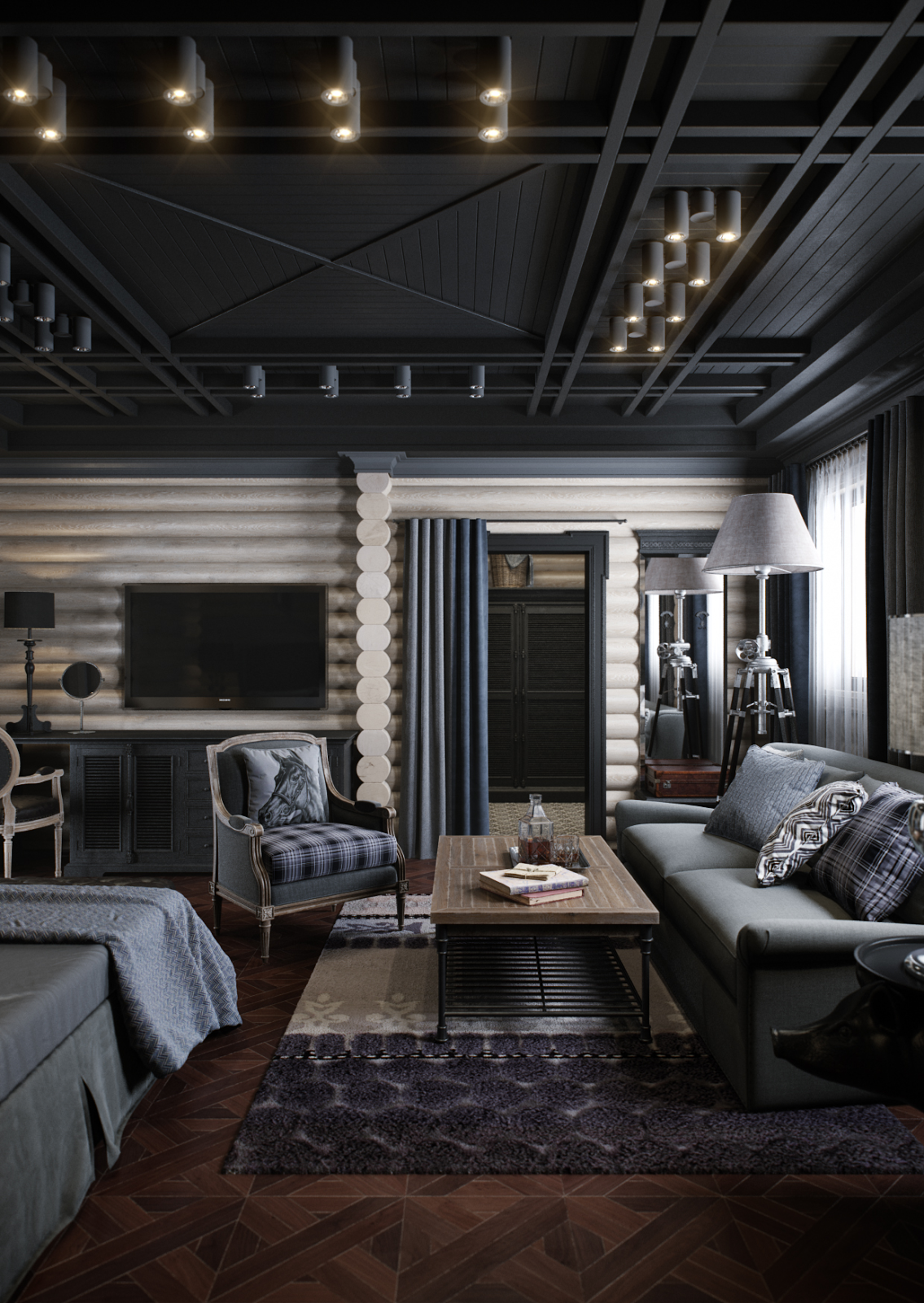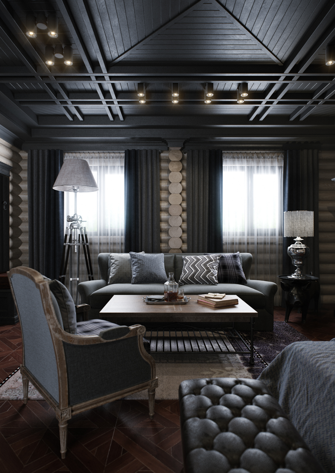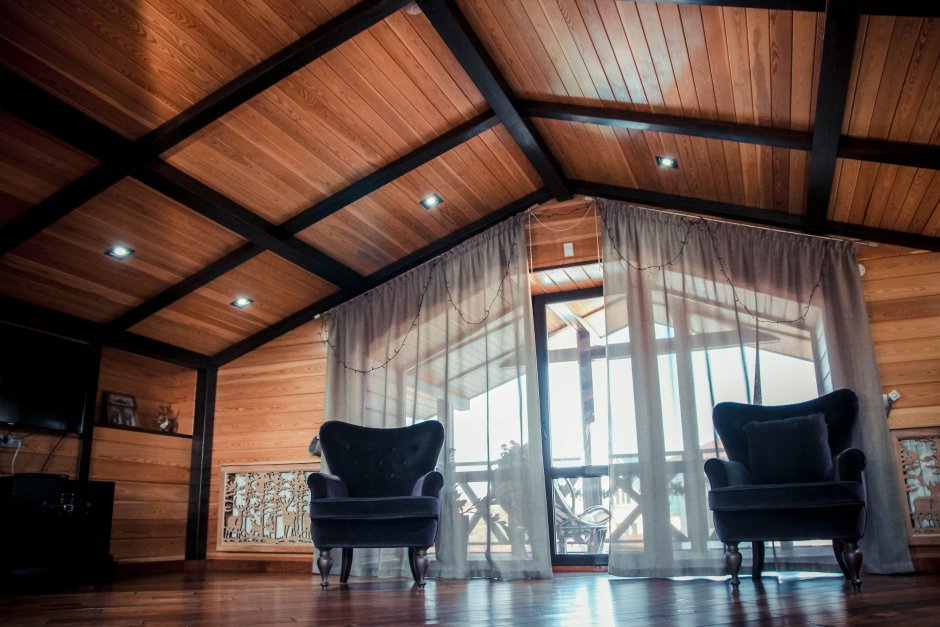 Деревянный интерьер с темными потолком гостиной