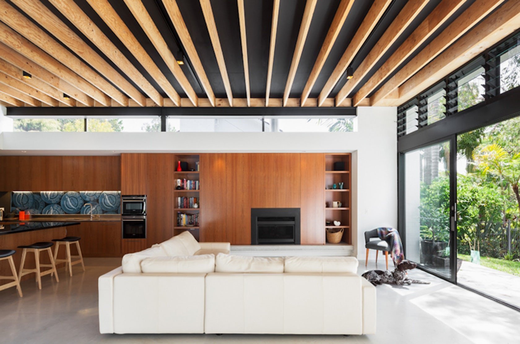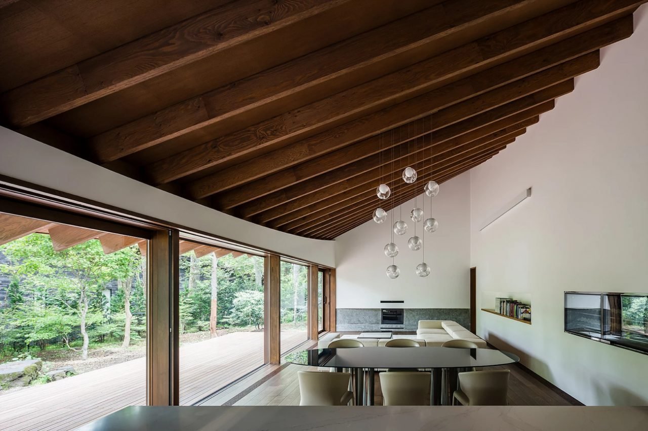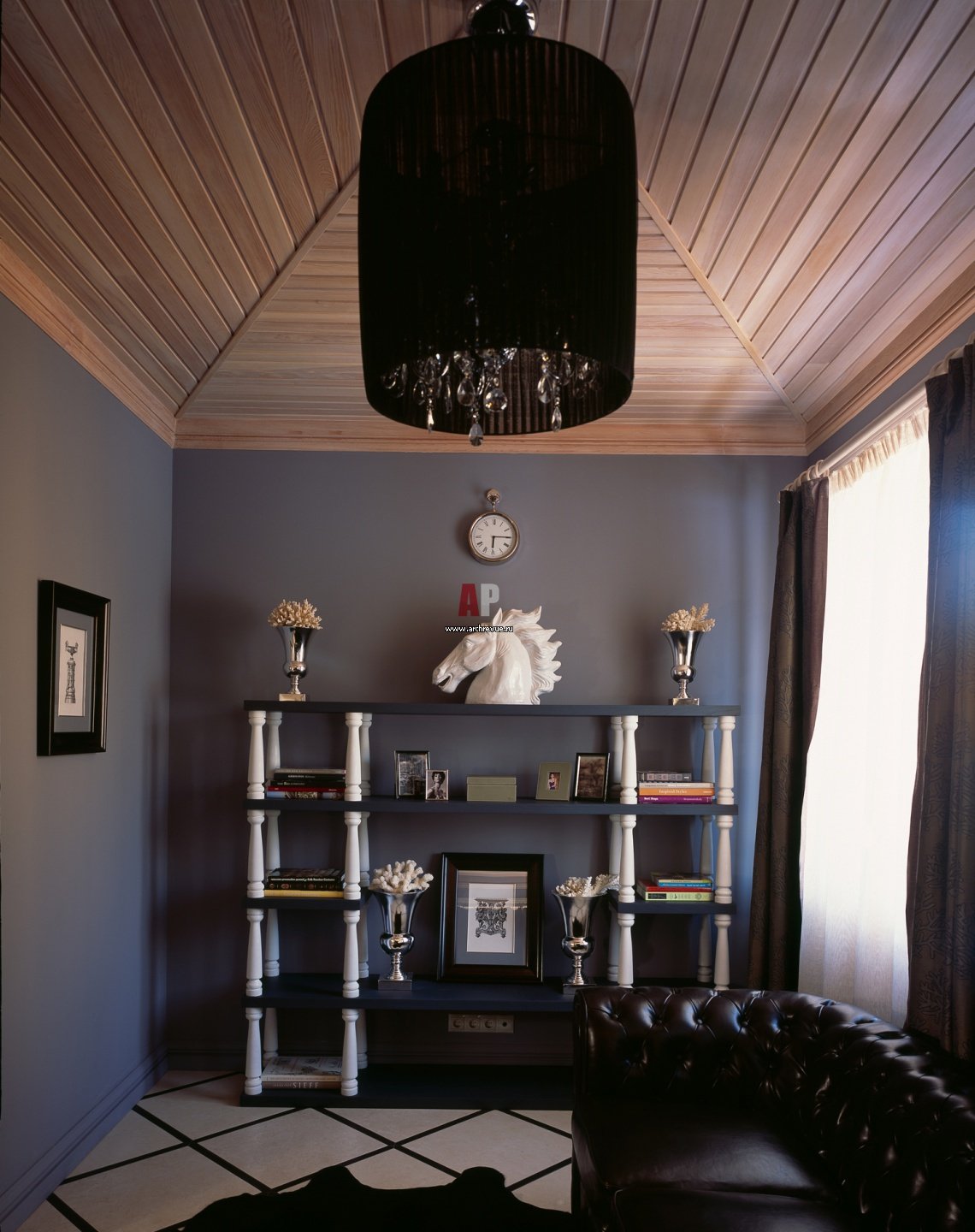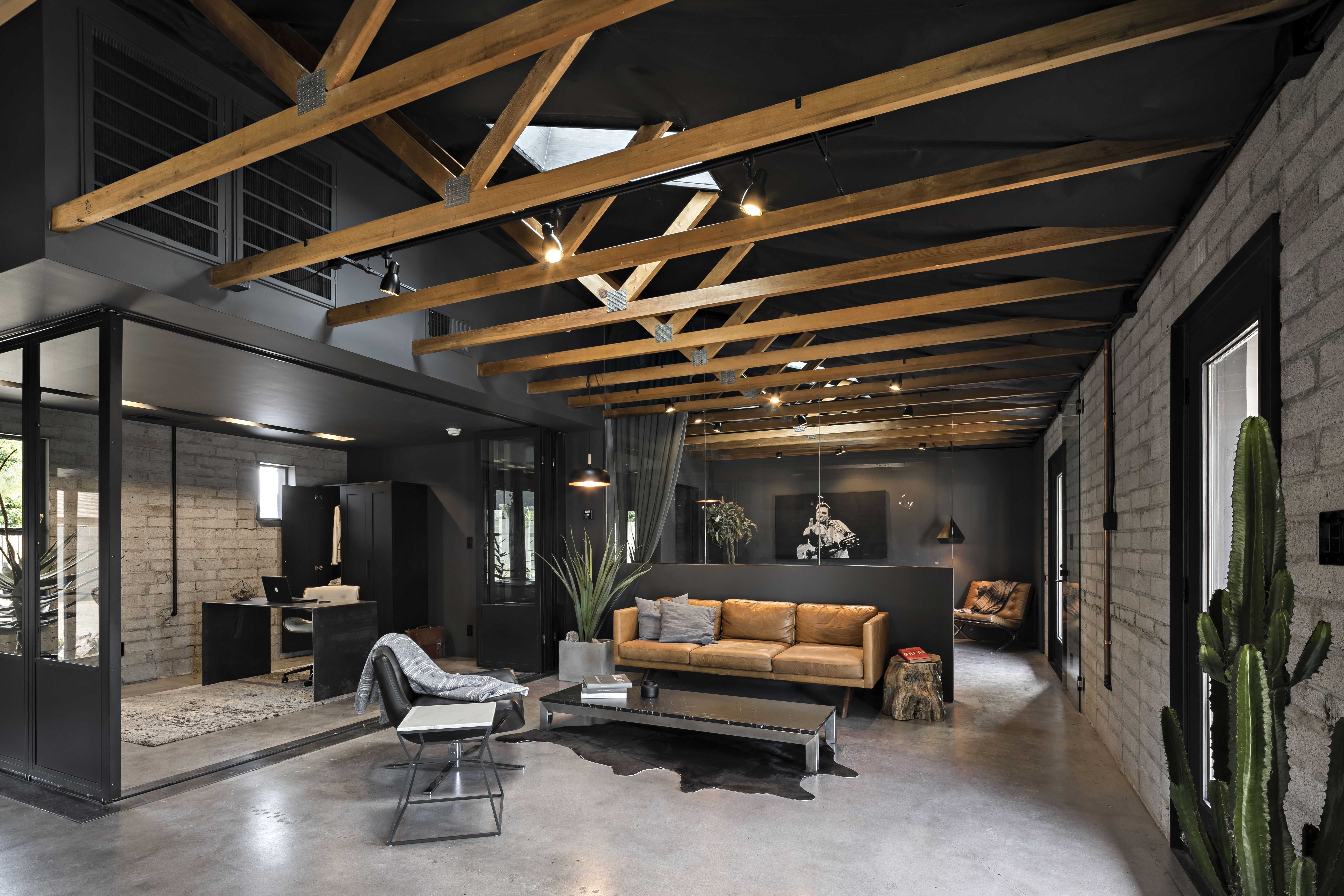 Деревянный интерьер с темными потолком гостиной