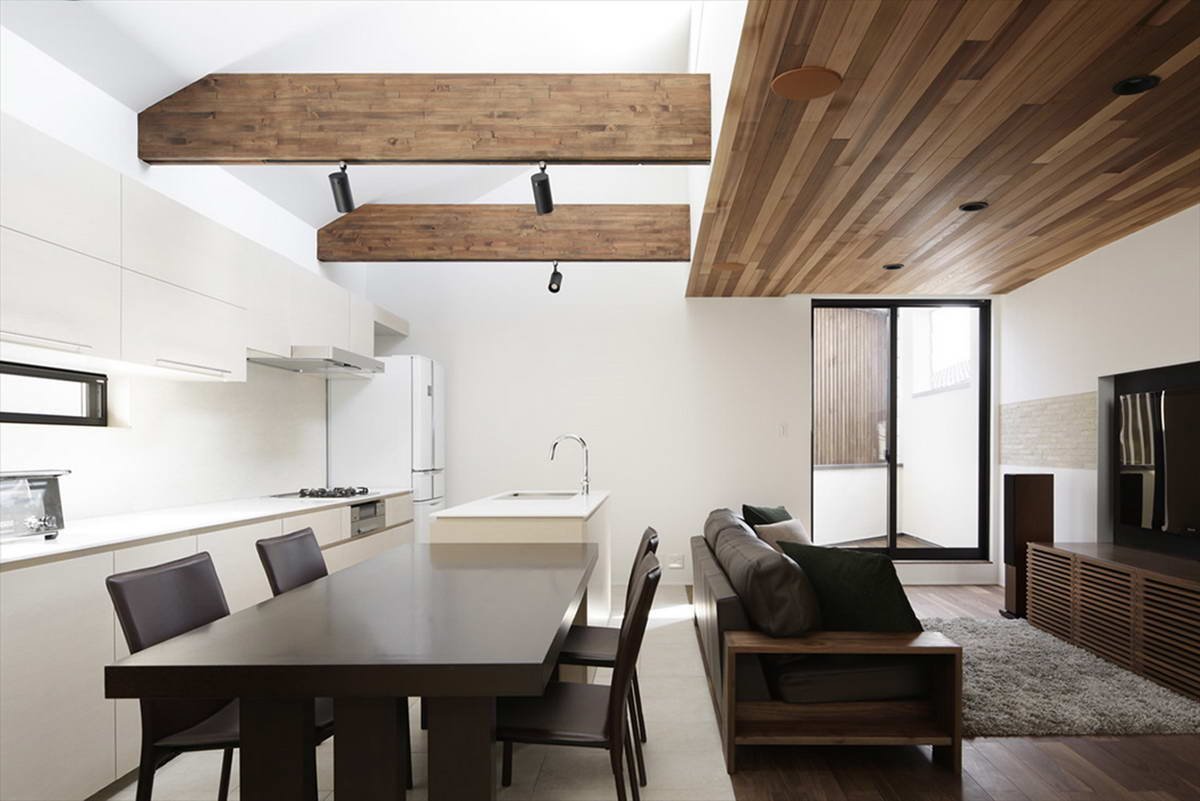 Коричневый деревянный потолок в интерьере