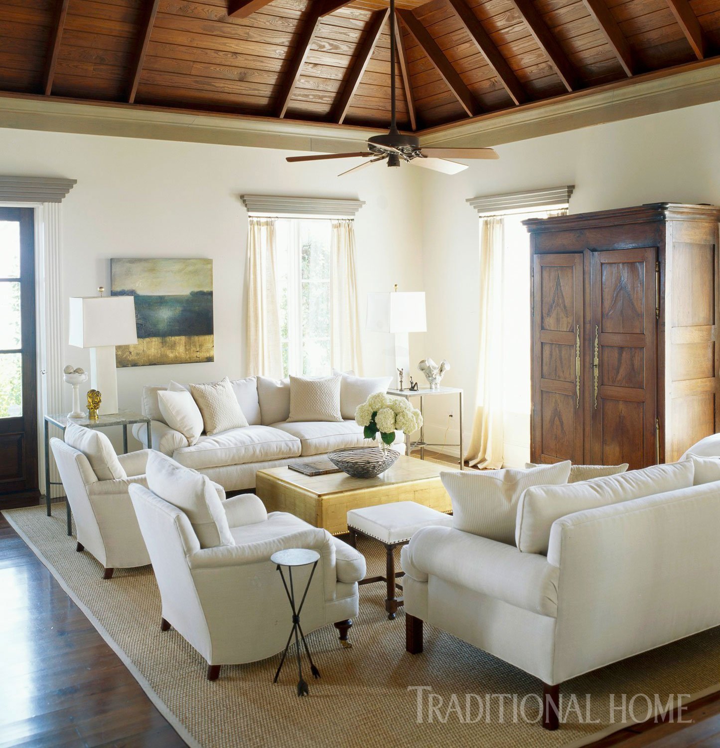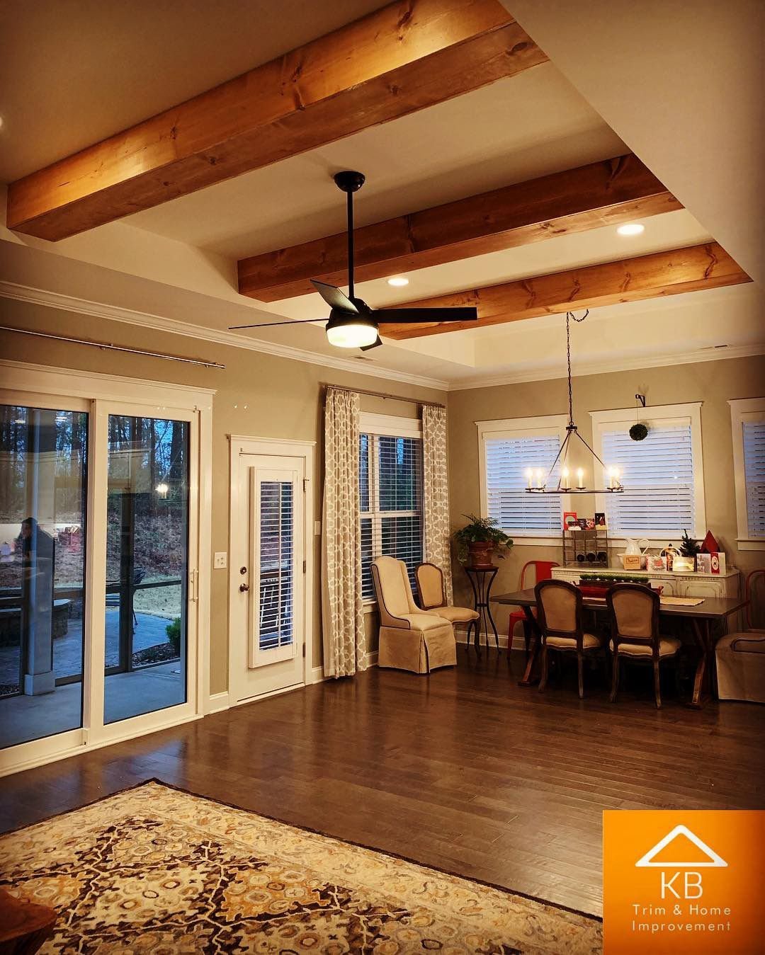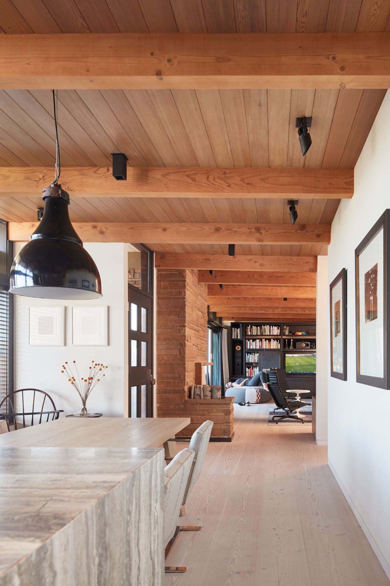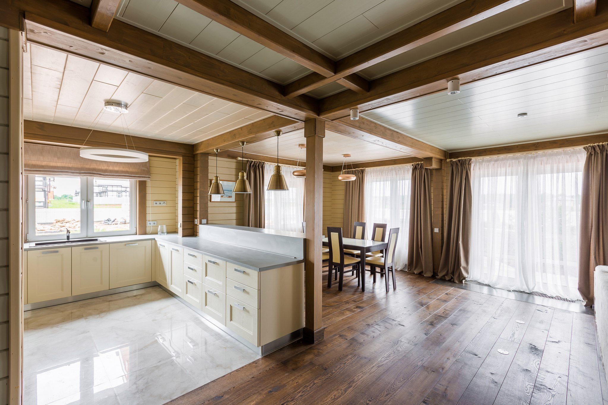 Деревянный потолок с балками в интерьере