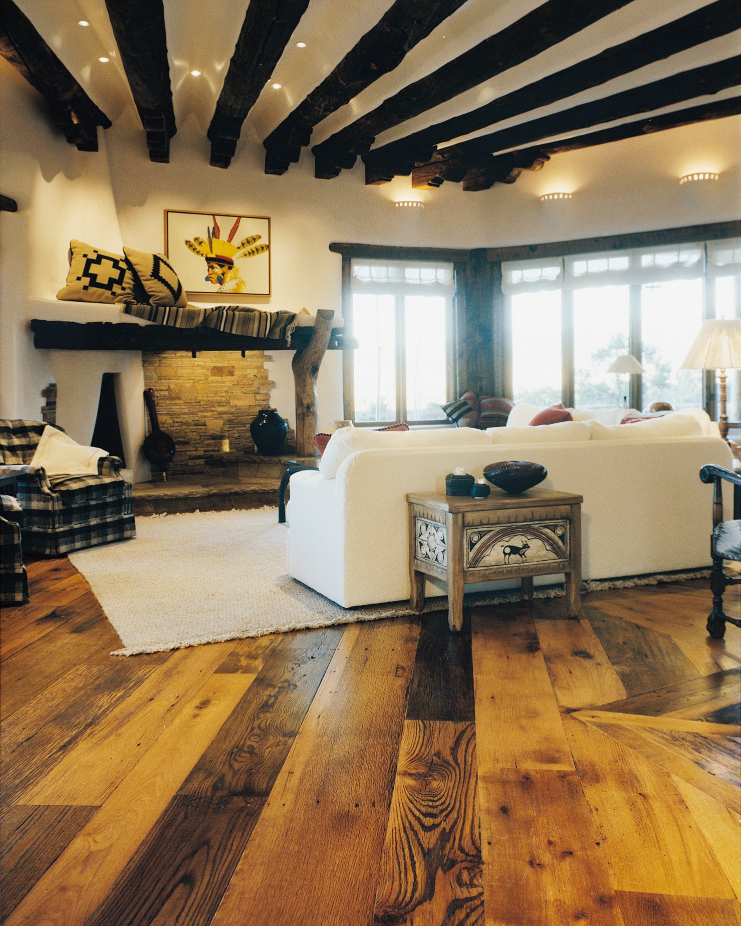 Темные балки на белом потолке