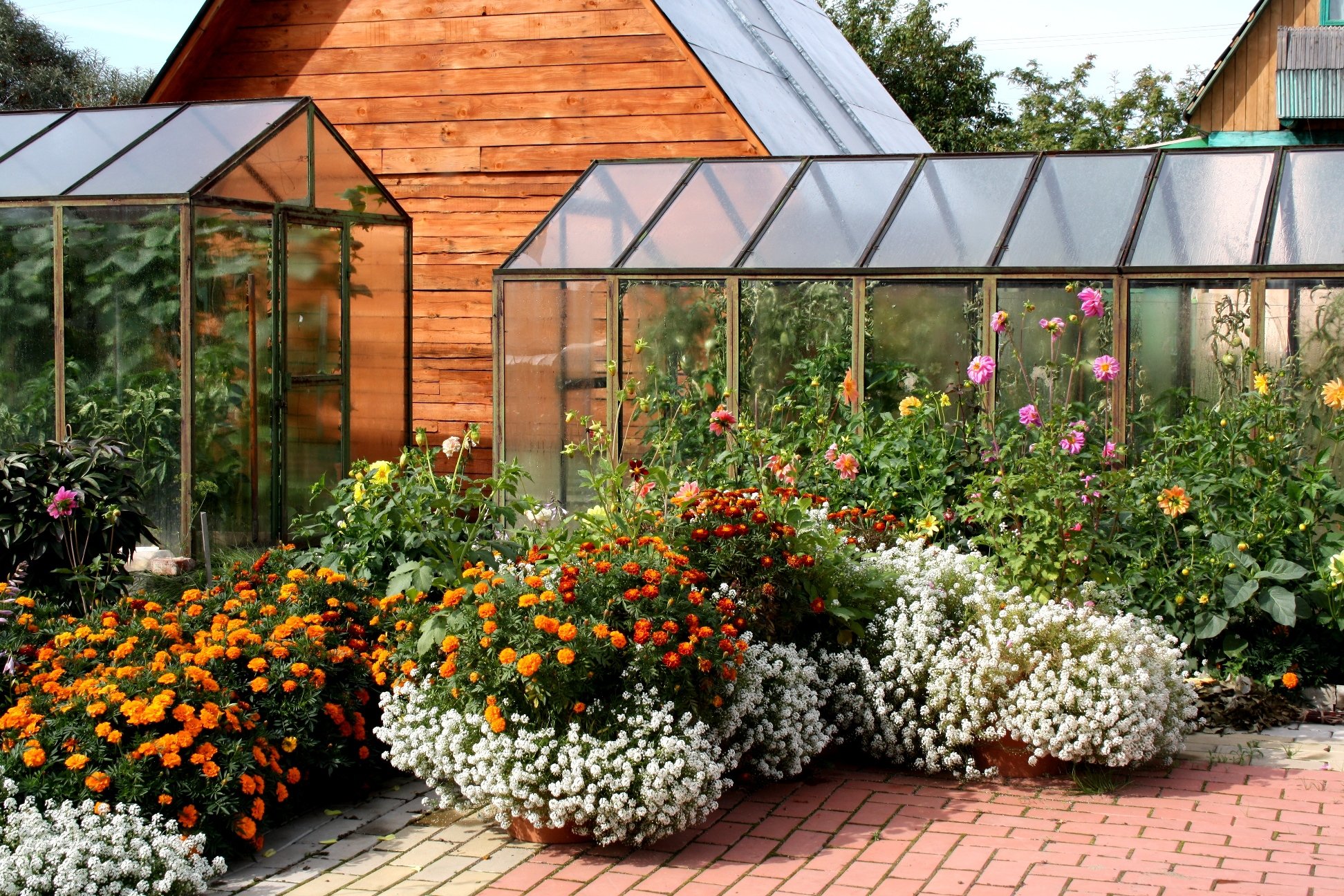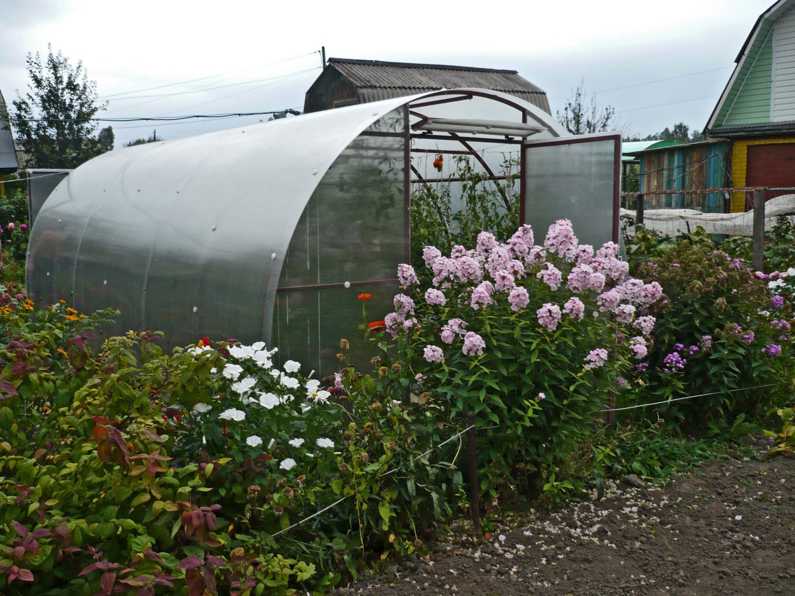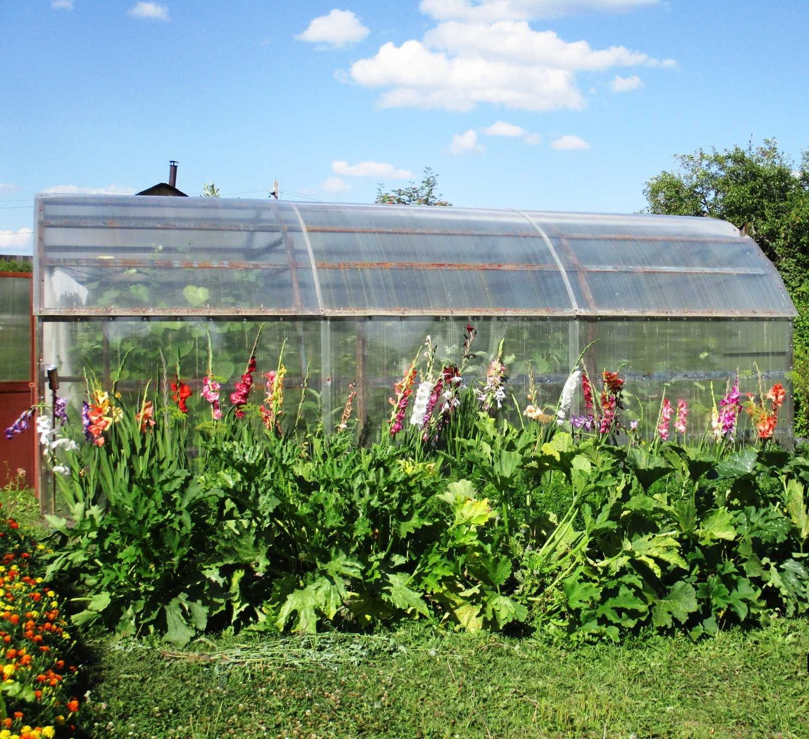 Цветы рядом с теплицей