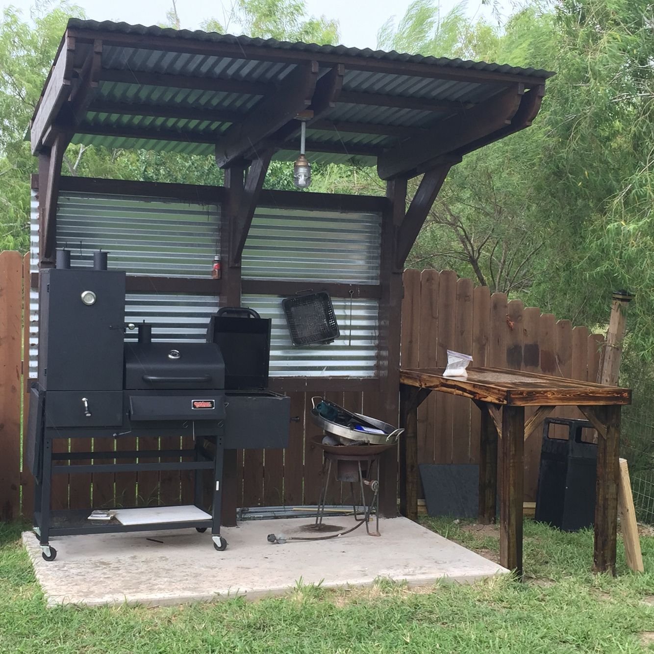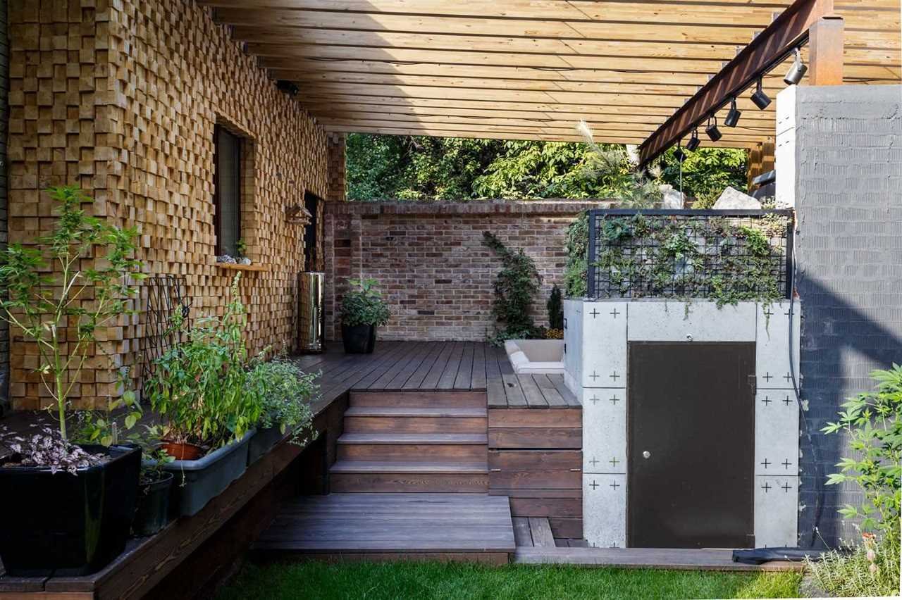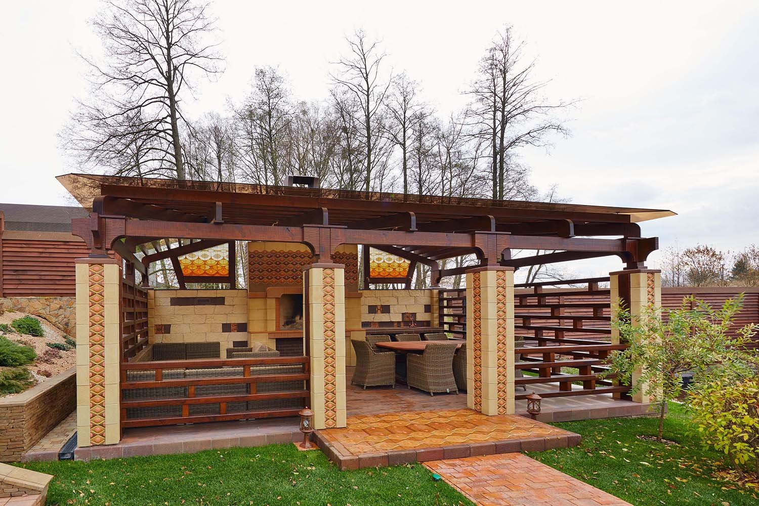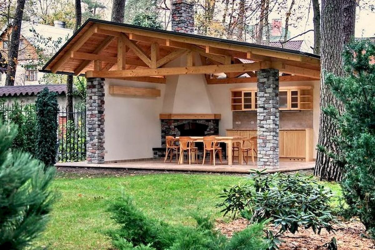 Патио с барбекю и деревянным навесом