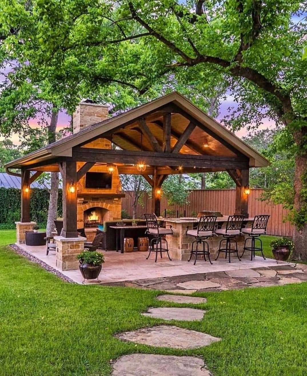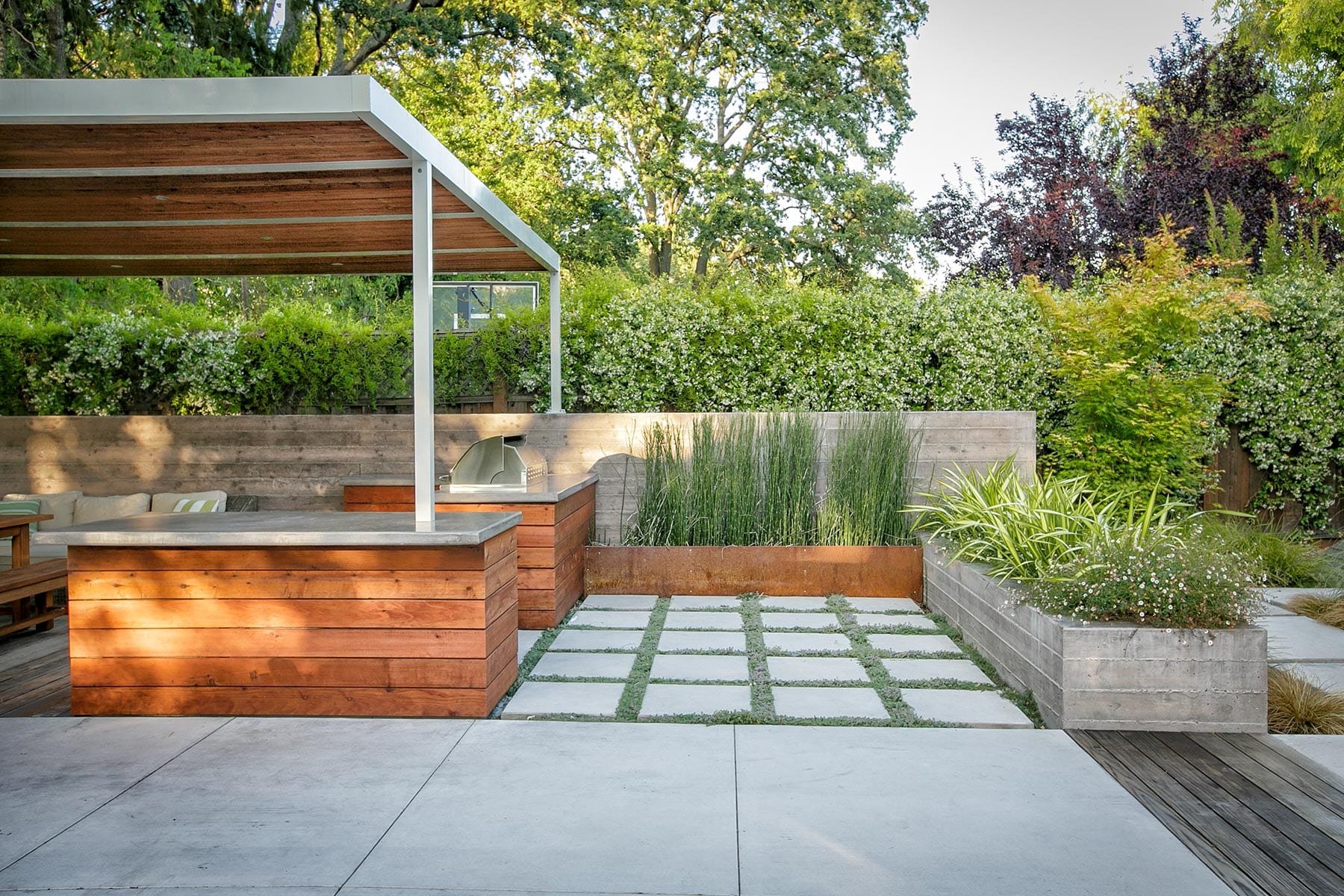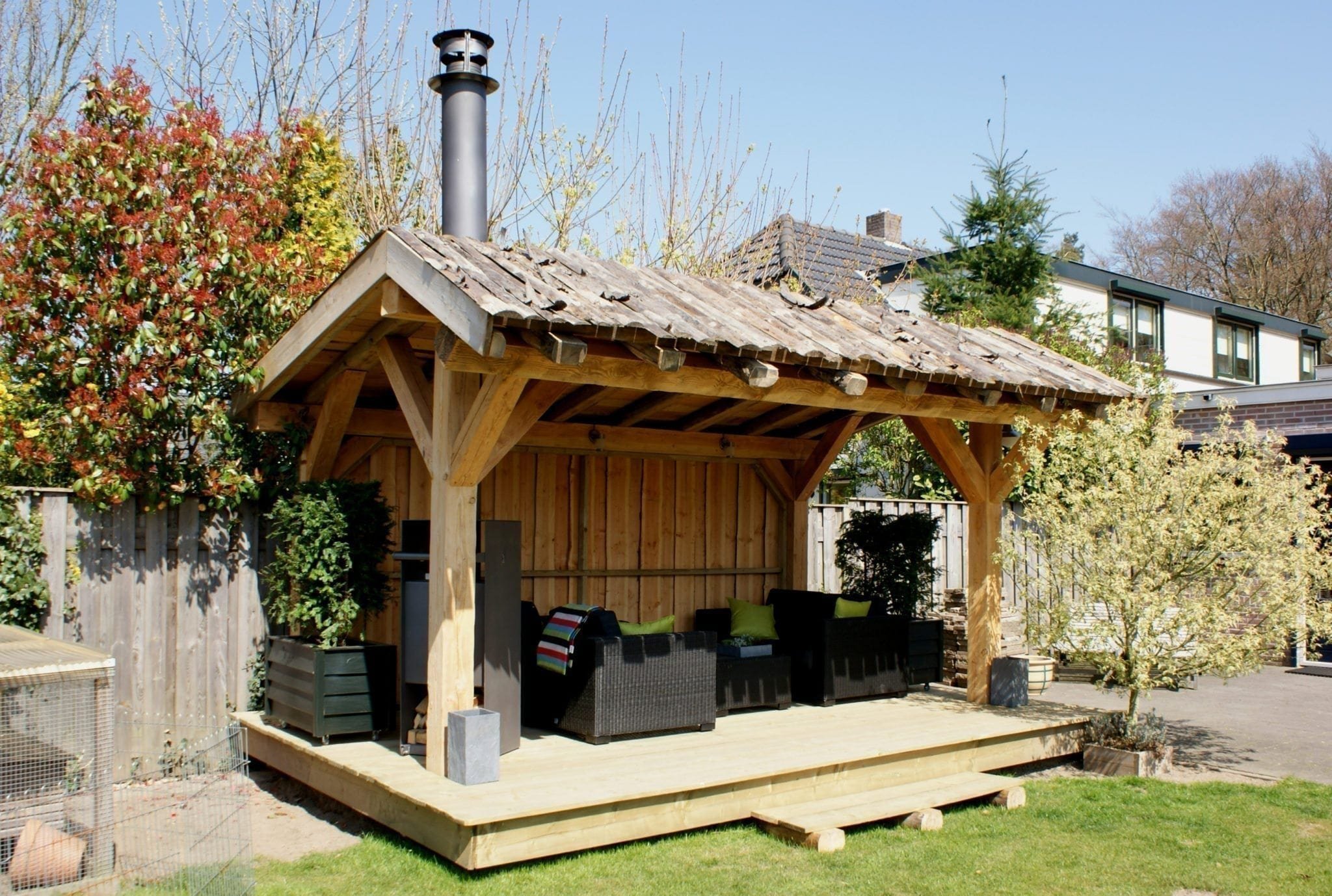 Патио с барбекю и деревянным навесом