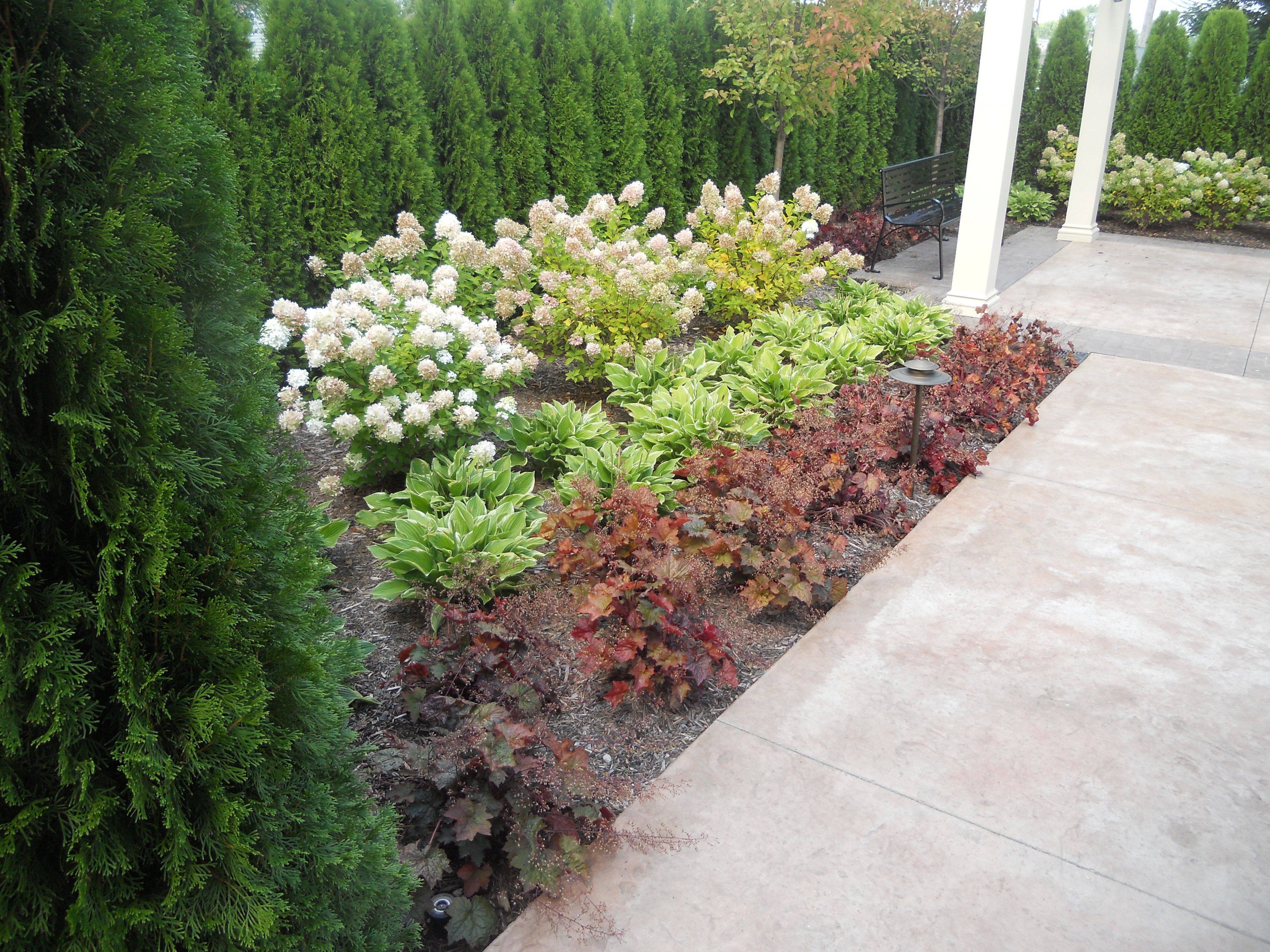 Клумба с туей гортензией и хостой